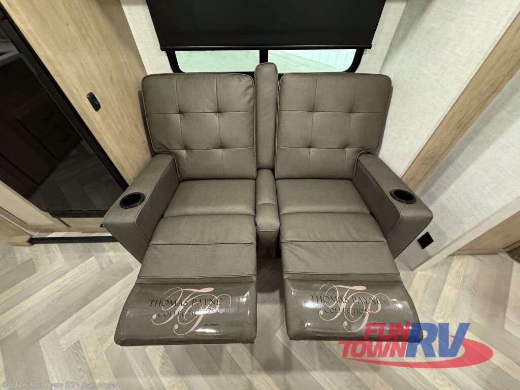 Are you looking for a travel trailer with plenty of interior space and lots of conveniences? Look no further than this E-Series unit! You can sleep three to four comfortably between the true residential queen bed in the front bedroom and the legless dinette, plus there is a walk-through bath that everyone can access easily. You'll also find the second entry door located in the master bedroom, along with dual nightstands and dual wardrobes to keep clothes wrinkle-free. After a day outdoors, you will love relaxing on the theater seating that is directly across from the HDTV to make it a movie night, and the legless dinette provides a place to dine, play games, and let a guest or two sleep over. And we haven't even mention the rear kitchen with tons of counter space, an air fryer convection microwave, a two burner cooktop, and a 10 cu. ft. 12V refrigerator!
