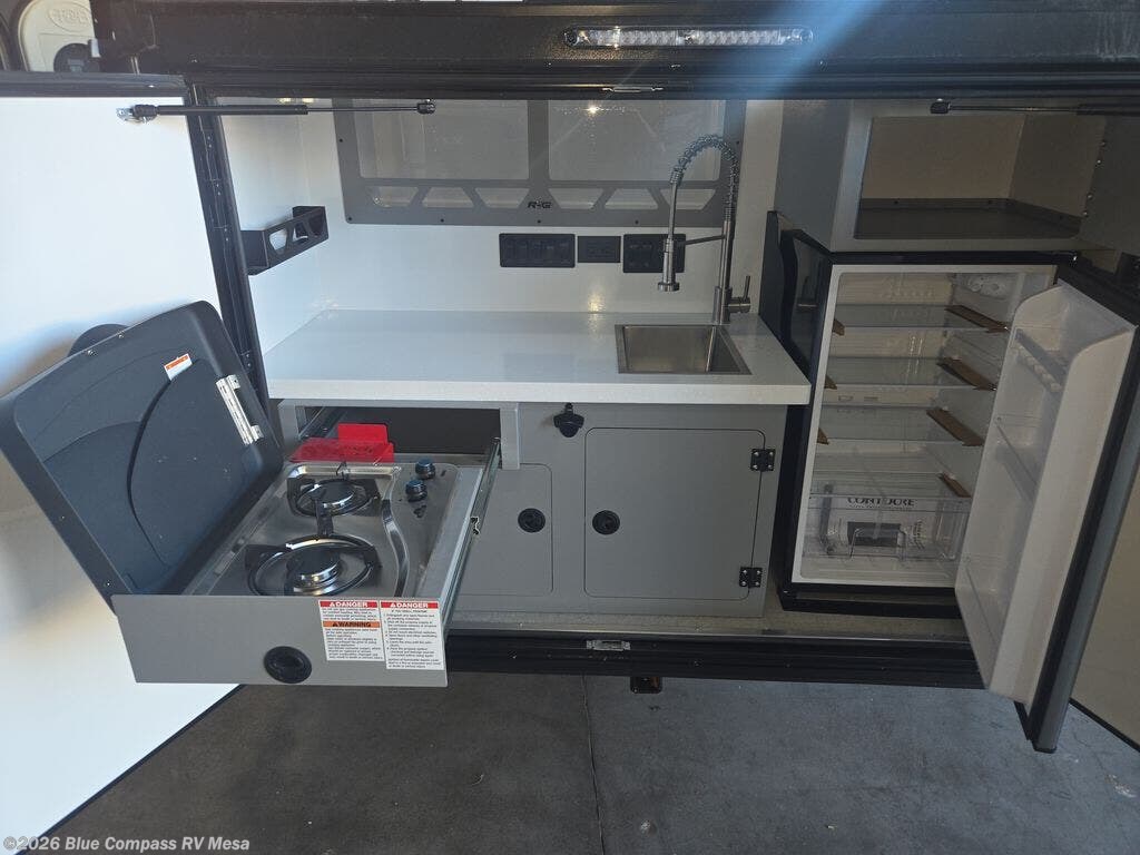 You will be so excited to test out this ROG travel trailer for yourself! The interior has great storage solutions to keep your camp gear secure. The rear outdoor kitchen has convenient amenities to help you eat well while you're away. You'll find a two-burner stove with cast-iron grates and a 3.3 cu. ft. 12V refrigerator to cook and store food. And the queen/futon mattress is sure to bring a great night's rest!