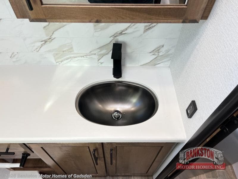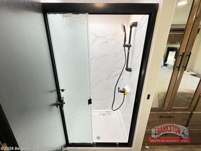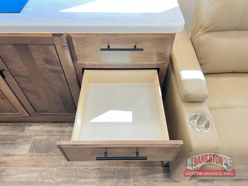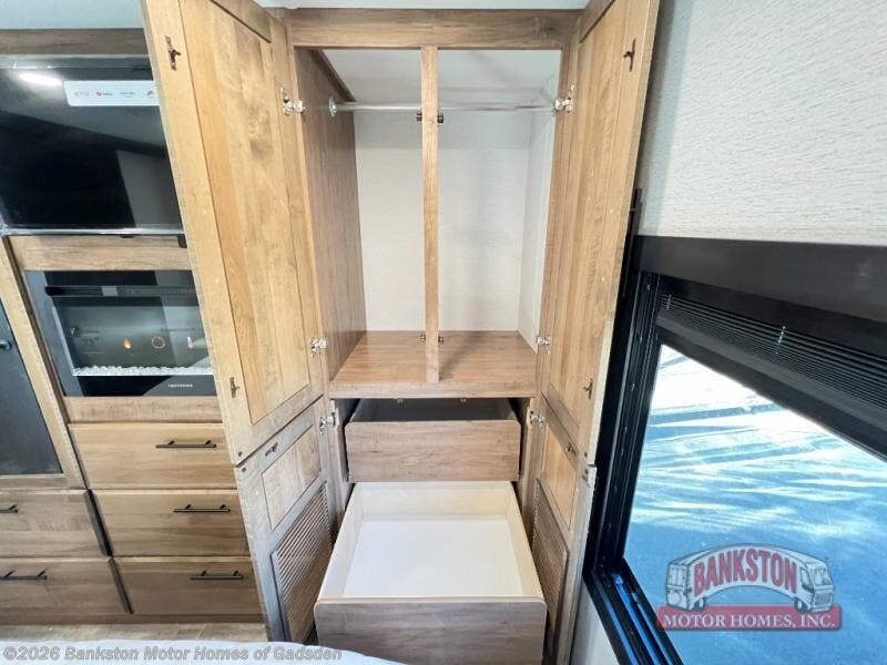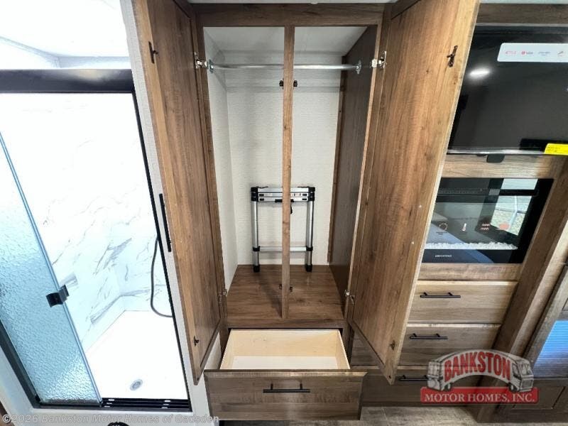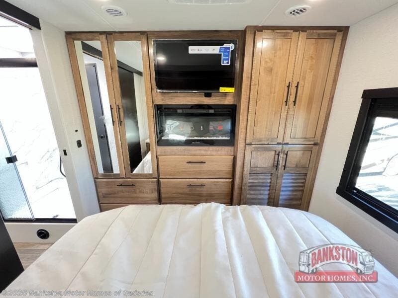 Head across the country in this coach for six to seven! Experience the best of outside living with an outside entertainment center including a Smart TV and a Bluetooth receiver so you can stream all your favorite songs and shows. The 17' awning will keep you cool under the sun. Inside you will enjoy even more comforts like a full rear bedroom with its own TV and fireplace. The bedroom storage unit also includes a wardrobe and space for an optional washer/dryer combo. A split center bath means the shower is across the hall from the toilet and sink for extra convenience.
