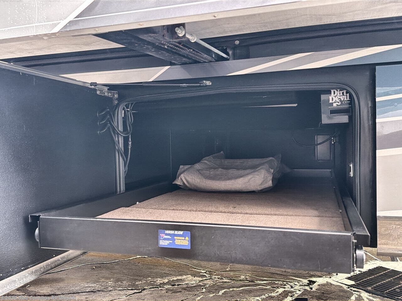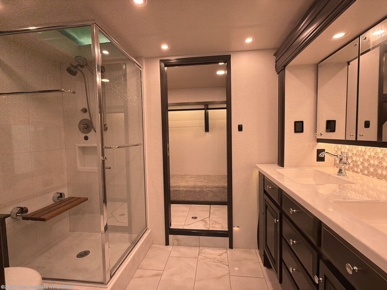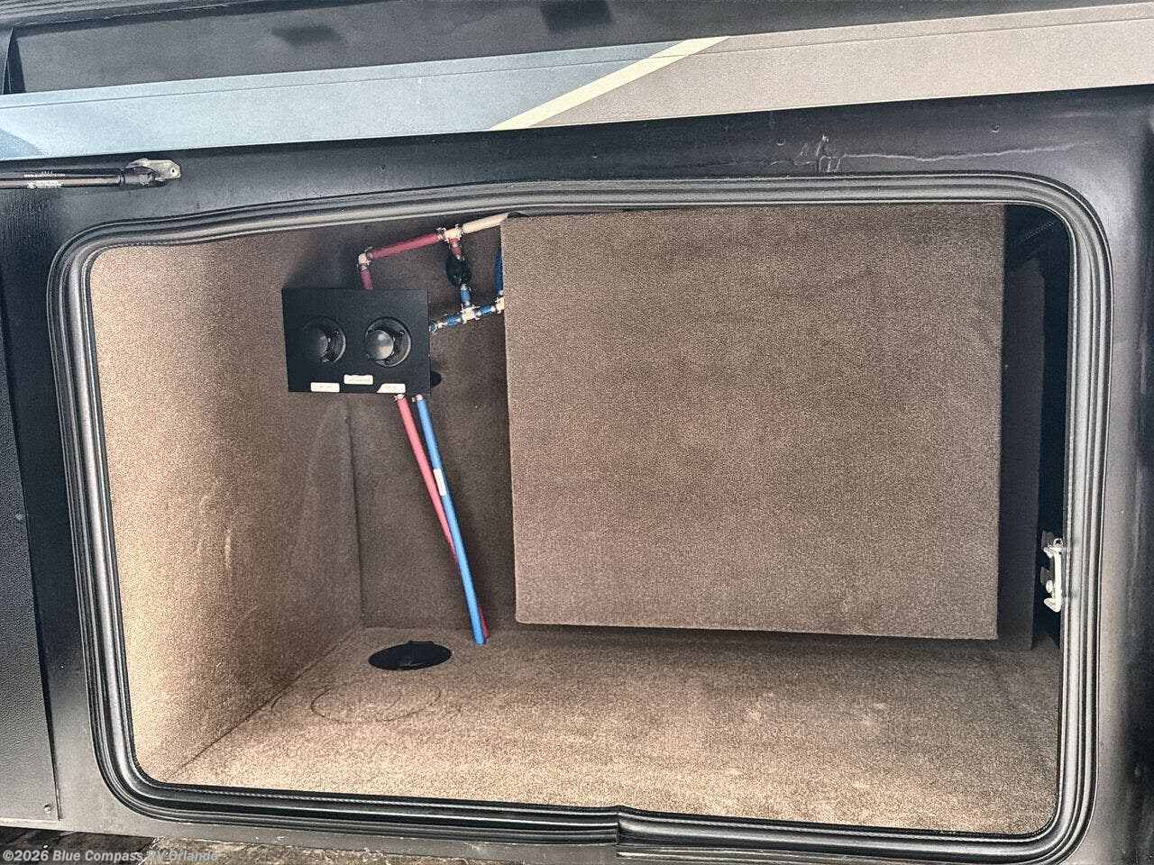 Comfortable traveling and living can be found in this coach with a master suite that includes a slide out king bed, dual wardrobes, drawers for storage and a 32" Smart TV, plus a full bathroom with a dual sink vanity. There is also a huge walk-in wardrobe with more storage areas plus a washer and dryer to keep everything clean while away. There is a mid-coach half bath for convenience, and the combined living and kitchen area offers full kitchen amenities such as a convection microwave, a Fisher & Paykel dishwasher, slide-out storage trays in the overhead cabinet, a buffet/table and two chairs to dine or work from. You'll also enjoy power theater seating while watching one of two Smart TVs in this area, plus a hide-a-bed sofa. There are options to change out the furniture if you wish such as a booth dinette, a 74" sofa with ottomans, and/or another hide-a-bed sofa with the desk/fireplace entertainment center option.