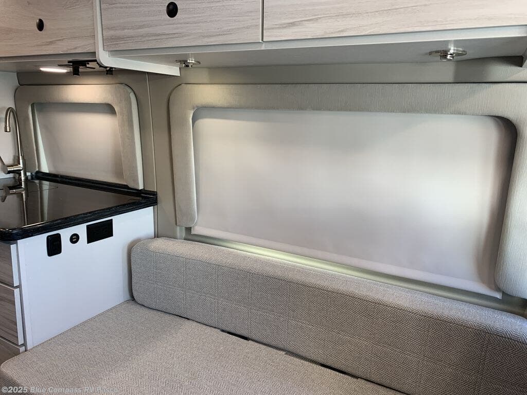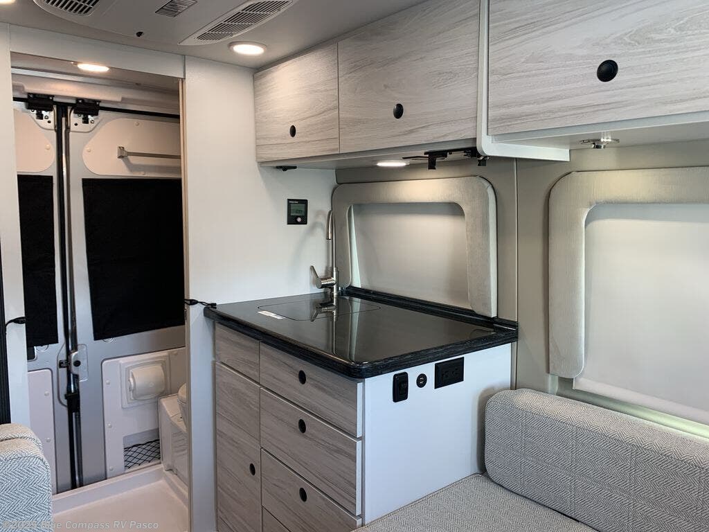 Any trip in this camper van will be spent in comfort thanks to the convenient wet bath and full kitchen amenities. You can whip up a hearty breakfast on the portable induction cooktop or use the microwave oven. There is a stainless steel sink with a cover for more prep space, and the pressed countertops will be easy to clean. After you've hiked for the day and gotten cleaned up in the rear wet bath, you can relax on the 54" sofa that will convert to a 54" x 72" bed. There is also a 27" bench seat for more seating space, overhead cabinets for storage, and an overhead TV to keep you entertained.
