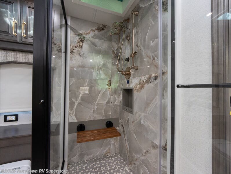 If you've been looking to upgrade your motorhome, this Cornerstone will be the perfect choice. There is a bath and a half, four slides, and sleeping space for four. Once you arrive at the campground, relax on the power theatre seating that is directly across from the 50" TV on lift. You can play a game at the free-standing dinette, or you may just want to head outside since there is an outside entertainment center. The master suite includes a king bed slide out, dual wardrobes, plus your own 32" TV. And check out the full rear bath that includes a rear walk-in wardrobe with plenty of storage space and a Splendide stackable washer and dryer.