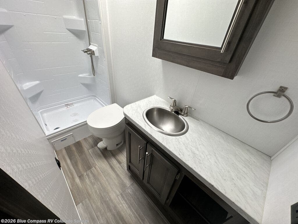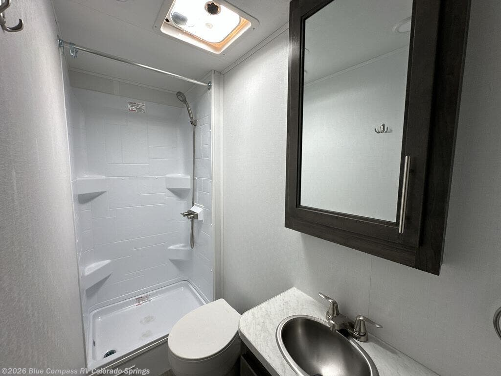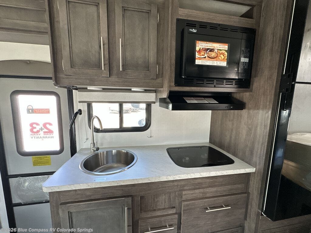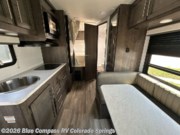 This coach will feel a little more like home with a booth dinette and full bath onboard! You can dine here, play games, and even let guests sleep here. There is additional sleeping space in the cab-over bunk and the rear corner 60" x 74" queen bed. You will find everything you need to cook meals each day, including a two burner cooktop with a flush cover, a convection microwave, plus a 10 cu. ft. 12V refrigerator to store perishables.