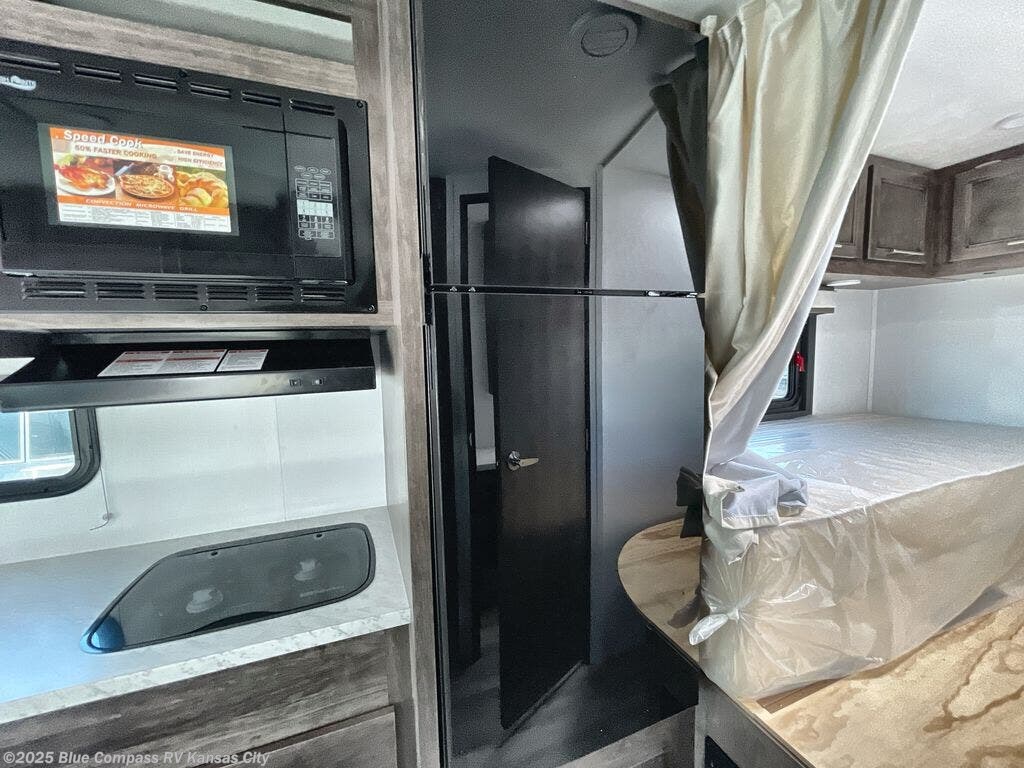 This coach will feel a little more like home with a booth dinette and full bath onboard! You can dine here, play games, and even let guests sleep here. There is additional sleeping space in the cab-over bunk and the rear corner 60" x 74" queen bed. You will find everything you need to cook meals each day, including a two burner cooktop with a flush cover, a convection microwave, plus a 10 cu. ft. 12V refrigerator to store perishables.