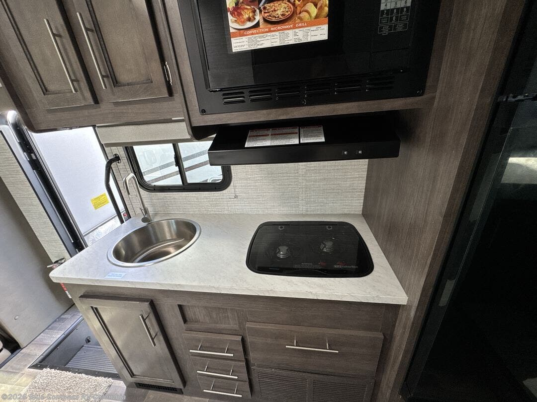This coach is perfect for traveling with your buddy or honey since there are twin beds that convert to a king-size bed if you choose! There is a large overhead cabinet above the bed for storage, along with cabinets in the kitchen and a medicine cabinet in the bathroom. A 48" bench with a removable table provides a place to enjoy meals or you can eat outdoors under the 16' electric awning. The full kitchen includes a two burner cooktop and convection microwave to cook meals each day, plus a 10 cu. ft. 12V refrigerator for food storage.