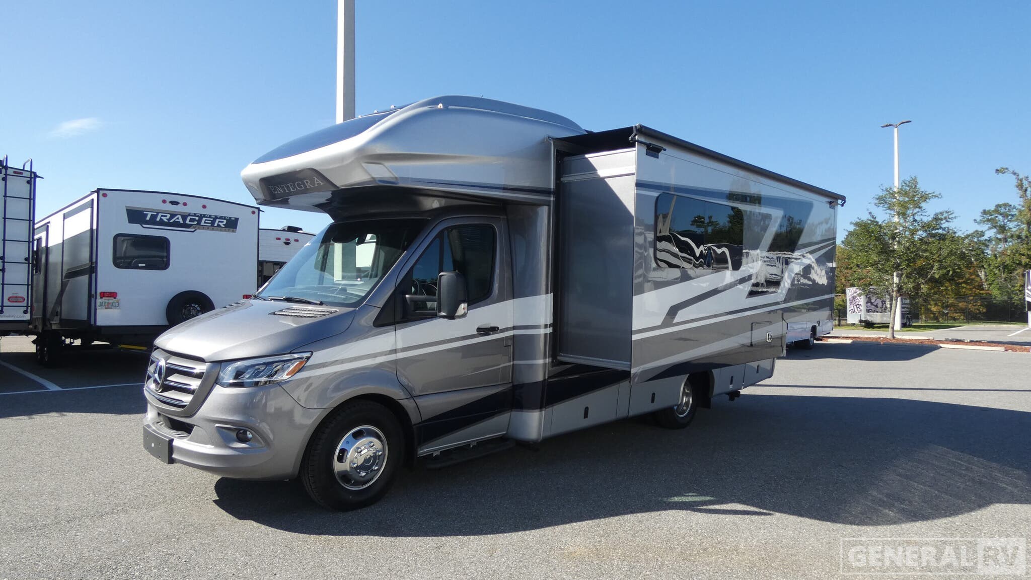 Experience the road like never before with the 2026 Entegra Coach Qwest 24L. This luxurious RV is built on the reliable Mercedes-Benz Sprinter 3500 chassis, powered by a robust I4 engine that delivers 211 horsepower and 332 lb-ft of torque. Its sleek 25-foot design is perfect for families or groups, comfortably sleeping up to six. The cozy interior features a queen-sized bed, a double bed, and a convertible dinette, offering plenty of space for everyone to unwind after a day of adventure. The Qwest 24L boasts a thoughtfully designed floorplan with a center kitchen that's equipped with a mid-size refrigerator and a two-burner cooktop, ideal for preparing delicious meals on the go. The front living area is perfect for relaxing, while the rear bath provides privacy and convenience. Enjoy the great outdoors under the 14-foot powered retractable awning, creating the perfect setting for alfresco dining or simply soaking in the views. With a fresh water capacity of 43 gallons and a towing capacity of up to 5,000 pounds, this RV is ready for extended journeys. For more details or to see it in person, visit your nearest General RV dealership.