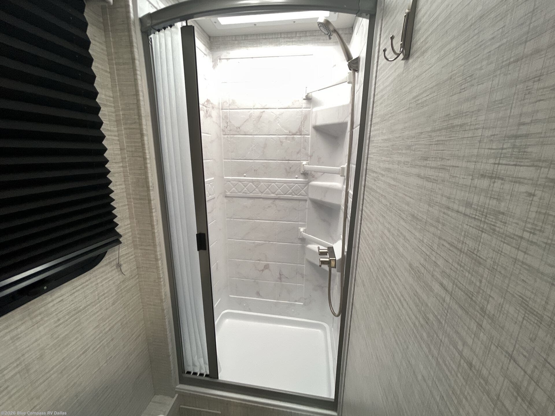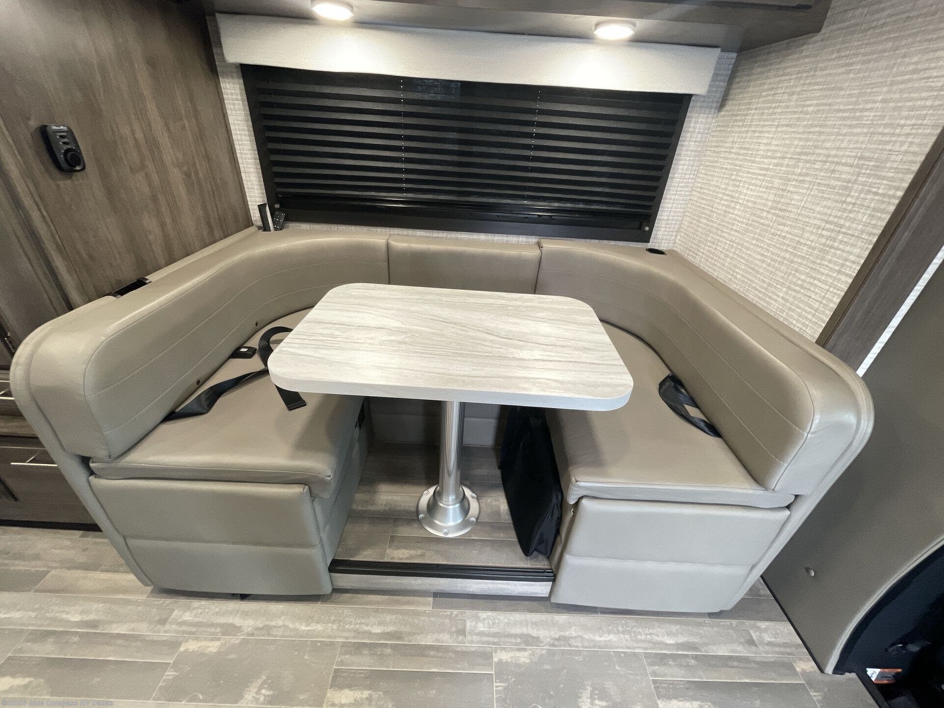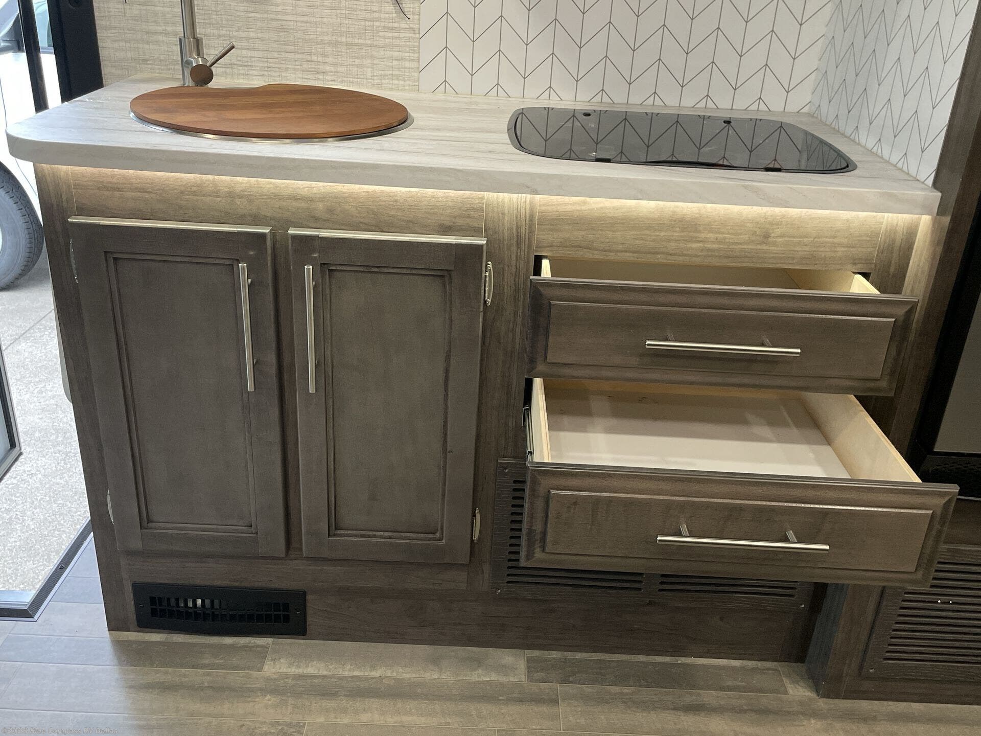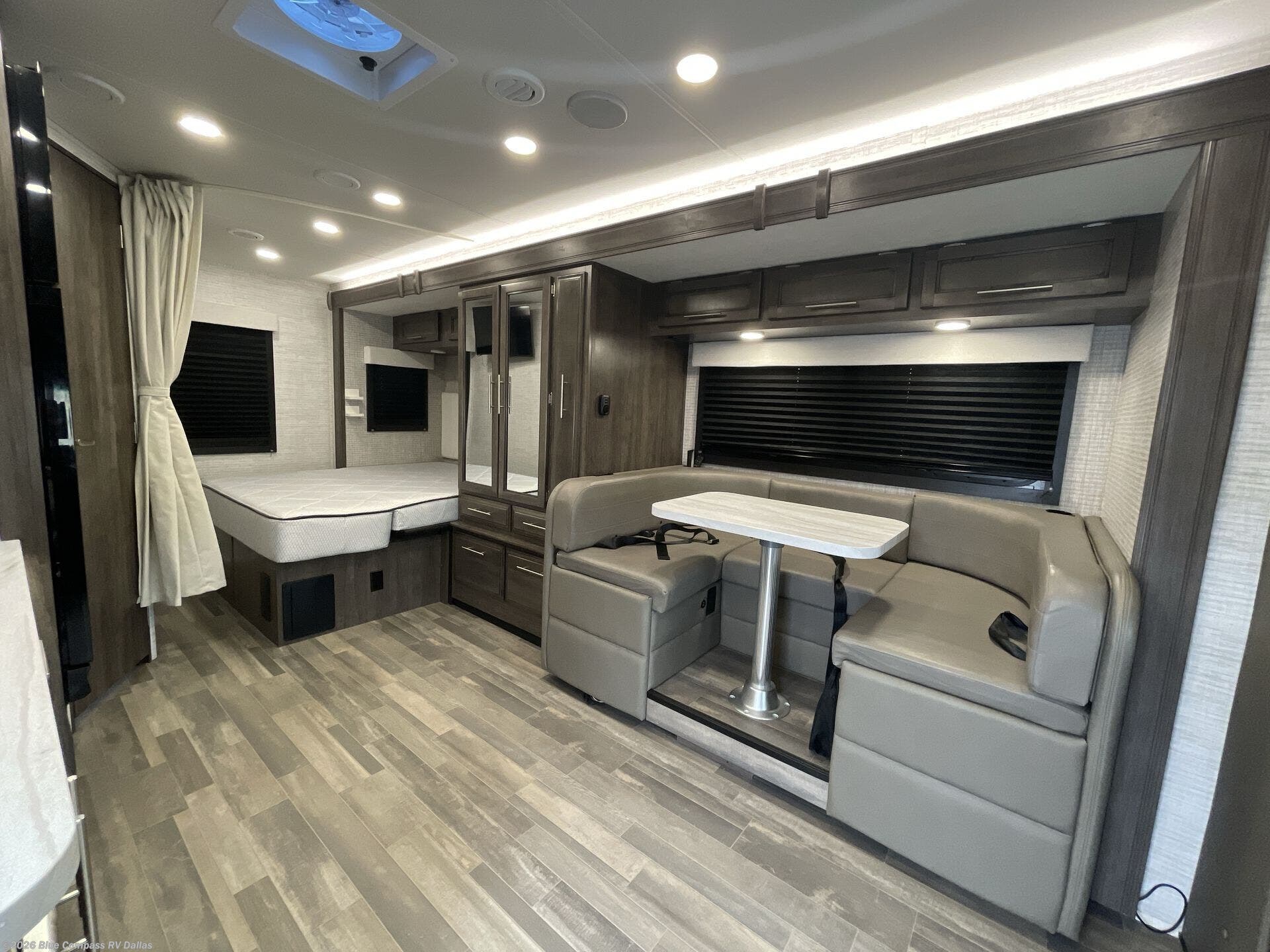 The full-wall slide in this coach will create an open floorplan you are sure to love. Here, you'll find the U-shaped dinette, the 60" x 70" queen bed, and the large wardrobe for all your clothes. Get cleaned up in the full bath that features a decorative shower surround with a skylight, a stainless steel sink, plus a porcelain toilet with a foot flush. The U-shaped dinette will provide a place to eat, play games, and even sleep more guests. If you're not needing this extra sleeping space, just choose the theater seating option in place of the dinette! And the cab-over bunk can be switched out for the optional B+ front cap with overhead storage. This model also includes a stainless steel convection microwave, a two burner cooktop, plus a 6 cu. ft. 3-way refrigerator for your perishables.