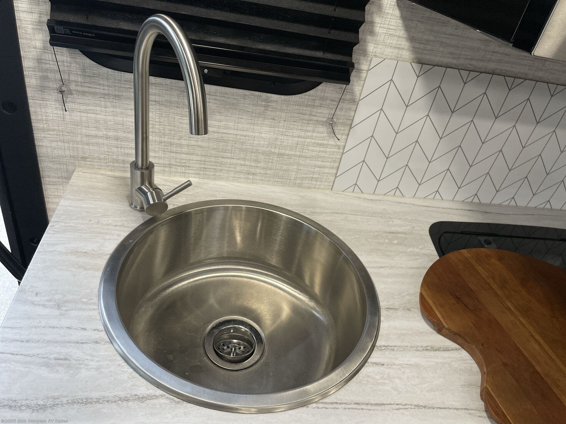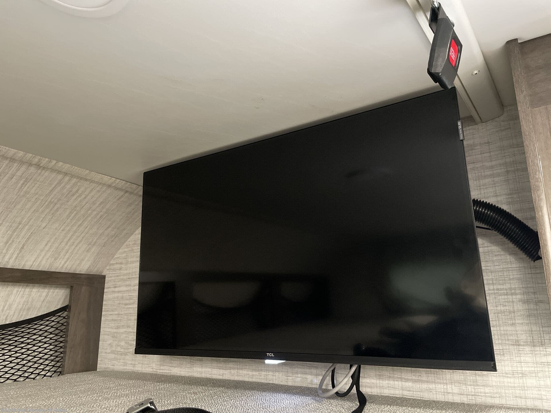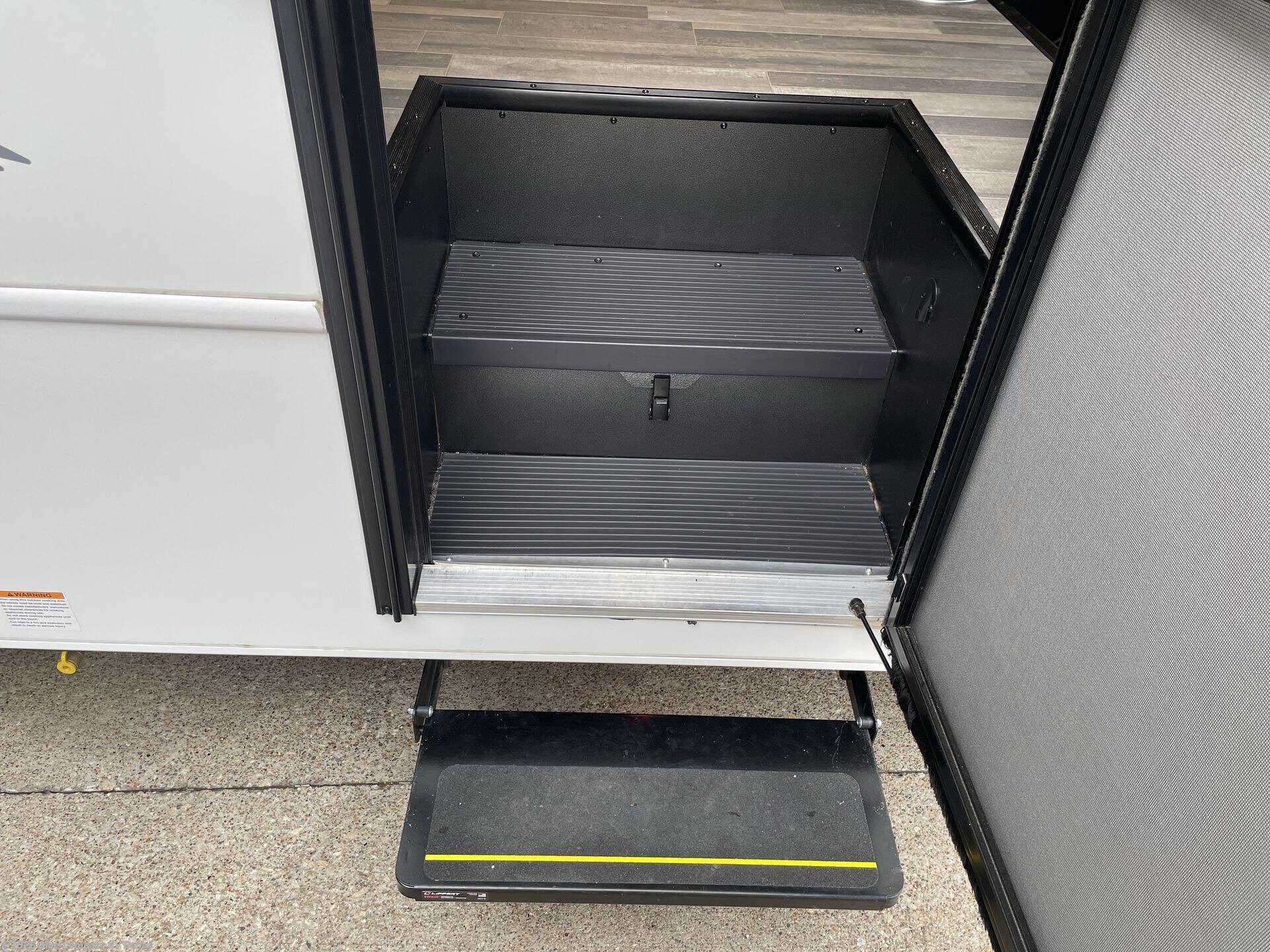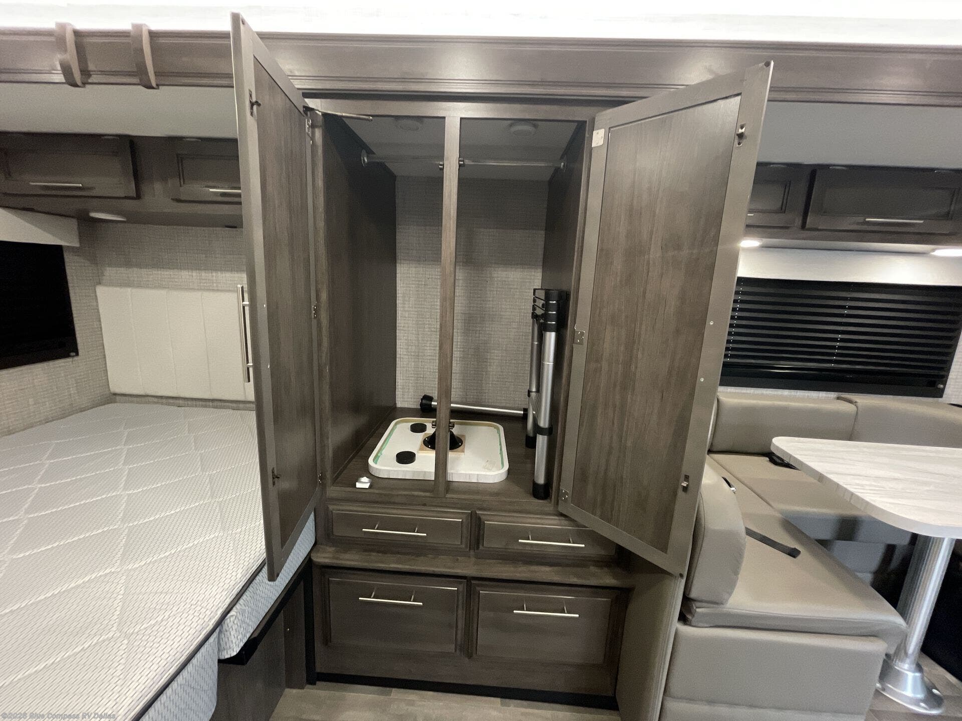 The full-wall slide in this coach will create an open floorplan you are sure to love. Here, you'll find the U-shaped dinette, the 60" x 70" queen bed, and the large wardrobe for all your clothes. Get cleaned up in the full bath that features a decorative shower surround with a skylight, a stainless steel sink, plus a porcelain toilet with a foot flush. The U-shaped dinette will provide a place to eat, play games, and even sleep more guests. If you're not needing this extra sleeping space, just choose the theater seating option in place of the dinette! And the cab-over bunk can be switched out for the optional B+ front cap with overhead storage. This model also includes a stainless steel convection microwave, a two burner cooktop, plus a 6 cu. ft. 3-way refrigerator for your perishables.