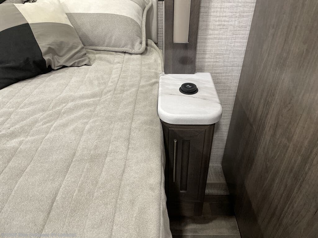 Picture yourself sitting in one of the swivel cab seats with your favorite beverage resting on the removable cockpit table in this Vision XL Class A gas motorhome! When you enter this coach, you will be greeted with a warm and comfortable living environment that has a theater sofa, hide-a-bed sofa, and 38" x 70" booth dinette for lounging, and the fireplace and 50" LED HD Smart TV will add to the coziness. For storing your favorite foods, you can use the residential refrigerator and pantry, and your dishes can be kept in the hutch or overhead cabinets. Conveniently located across from the kitchen is the half bathroom which has an area prepped for an optional washer/dryer, and the walk-around king-size bed in the master suite creates an exceptionally comfortable space to spend your nights.