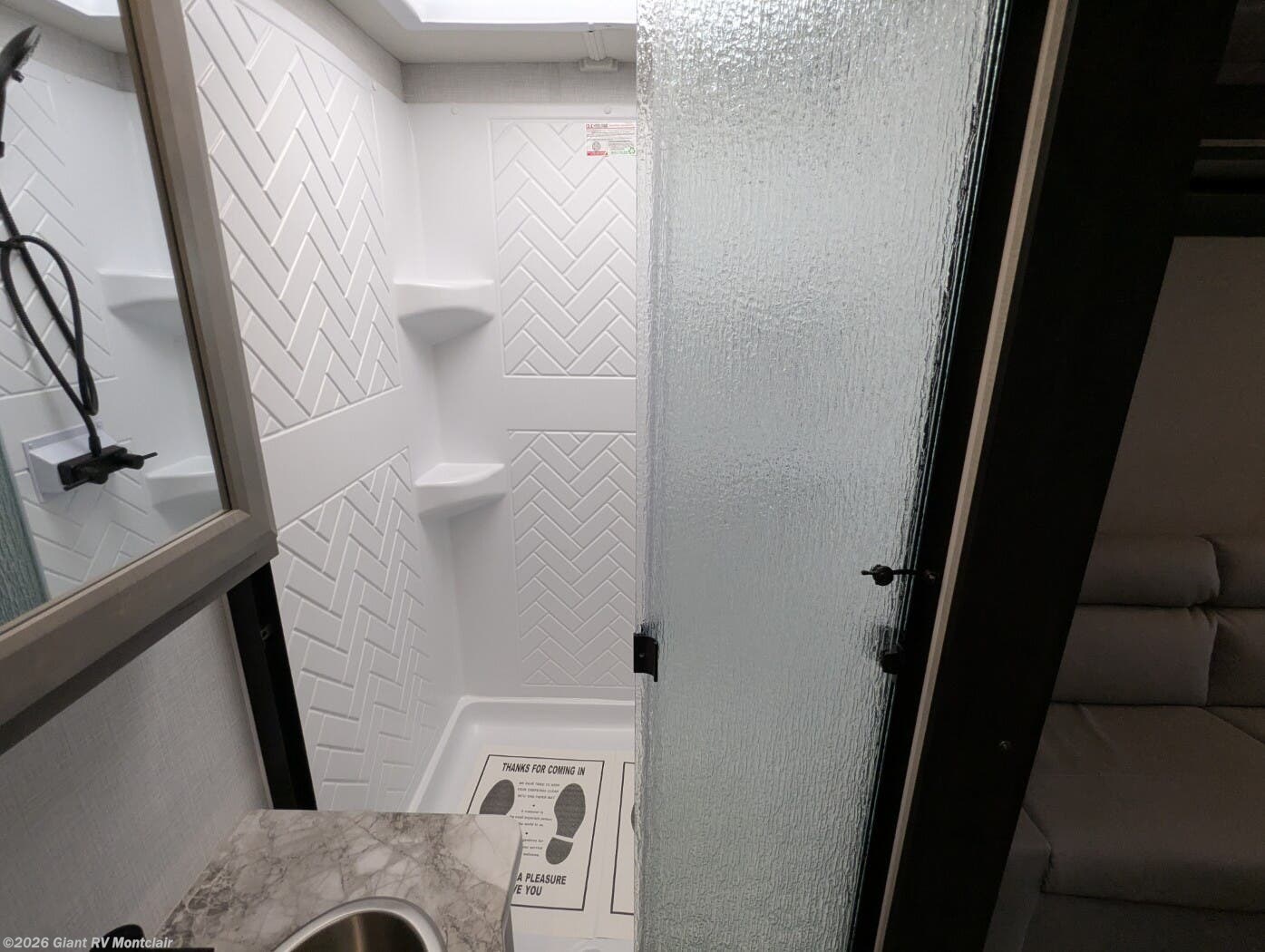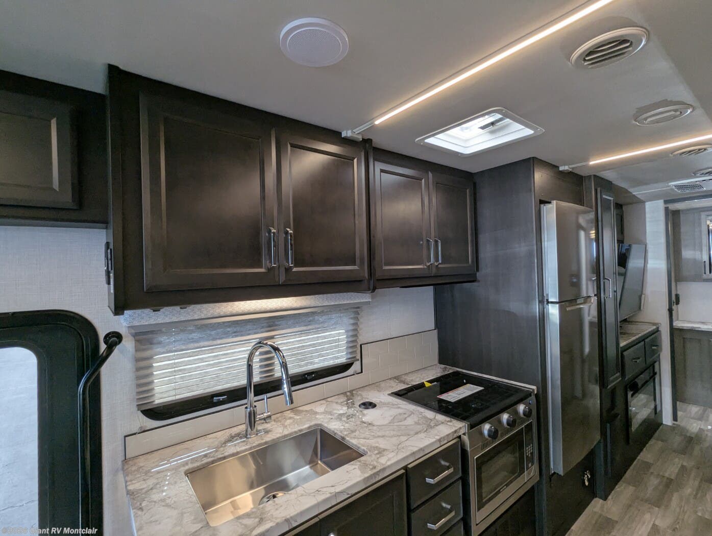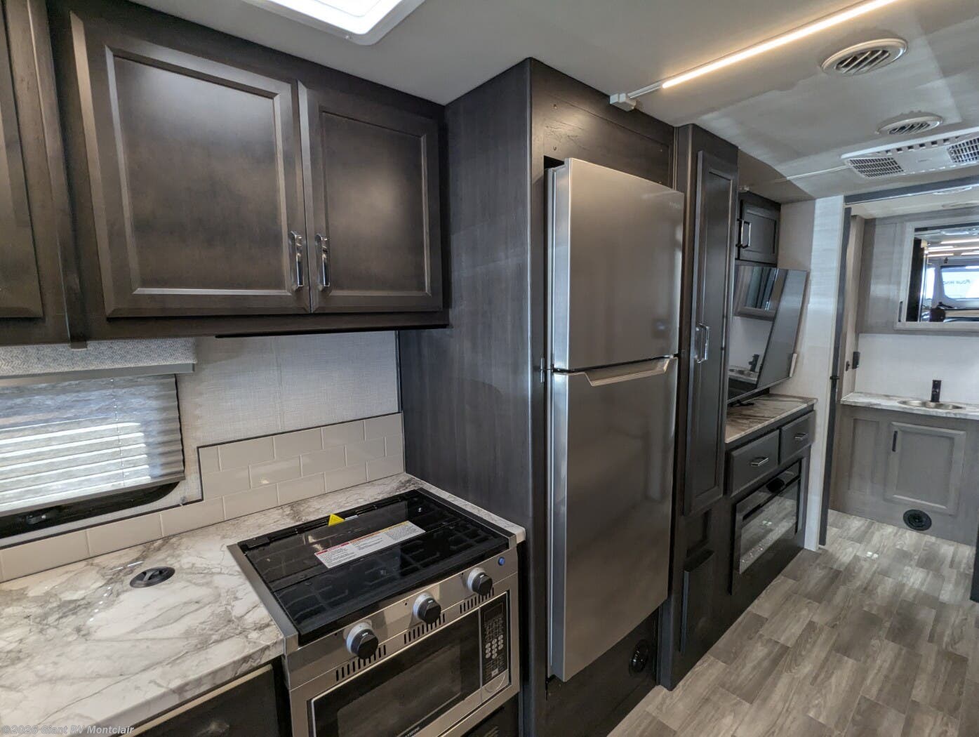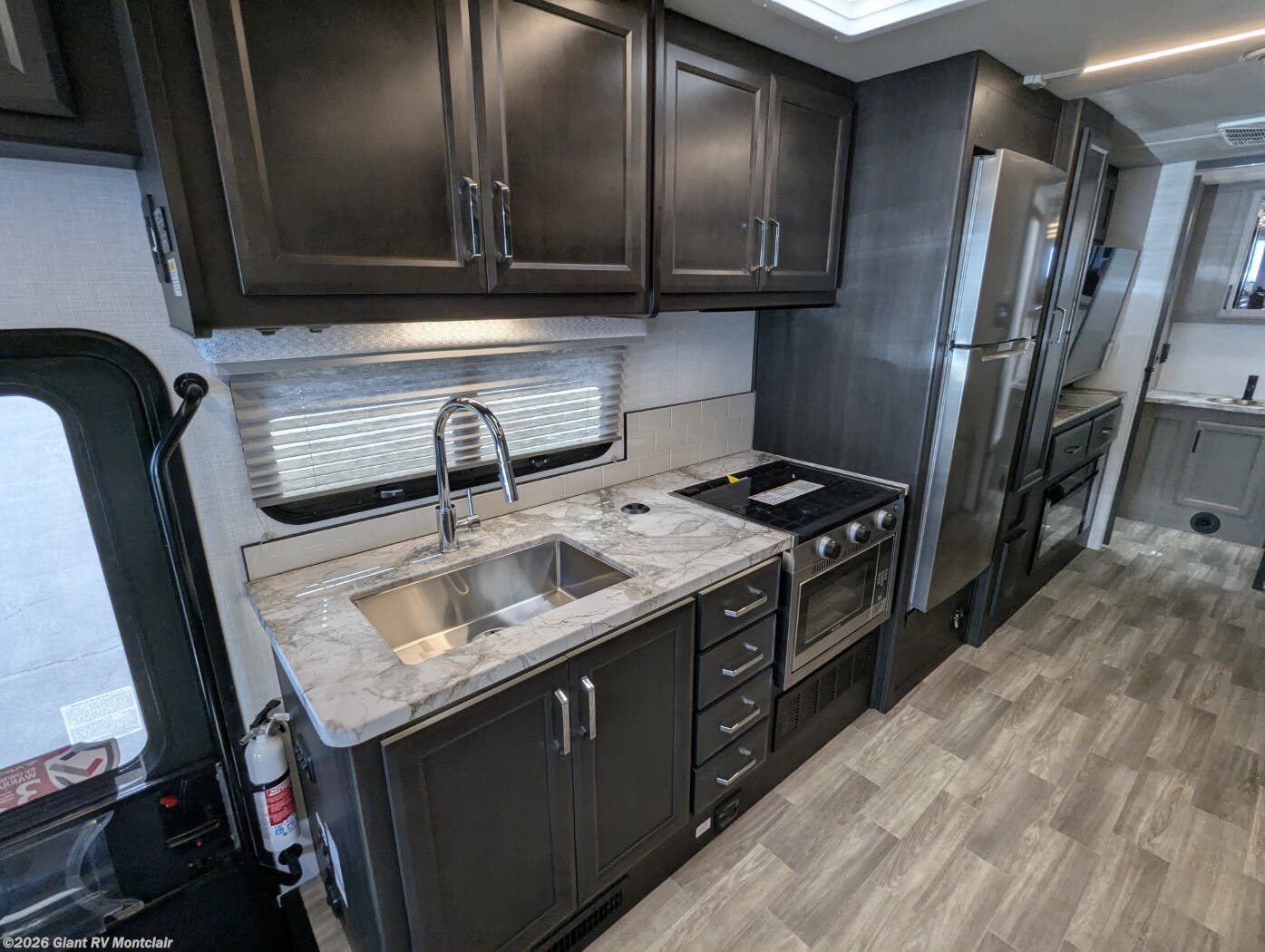 - Modern Interior: Equipped with a residential refrigerator, 3-burner range, convection microwave, Surf-X countertops, and a 2XL ABS shower enclosure.