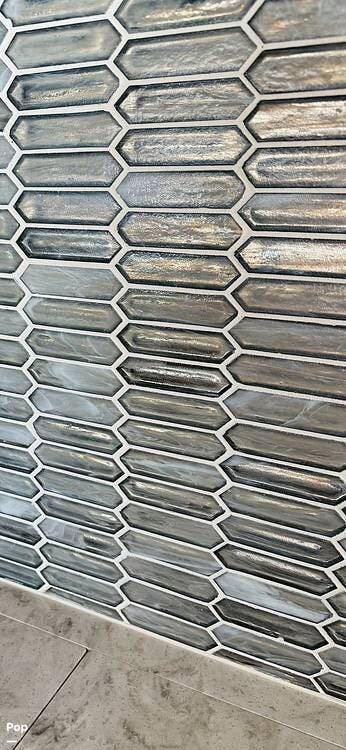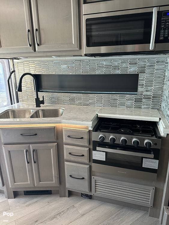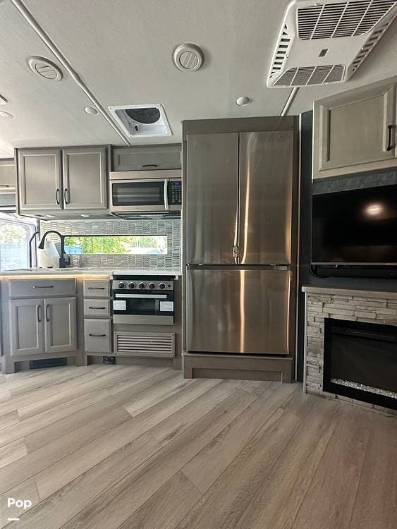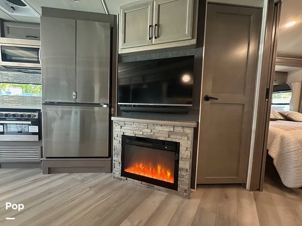 The entertainment center boasts a large flat-screen TV and an electric fireplace. The kitchen is equipped with solid surface countertops, a full-size refrigerator, a convection microwave, and a three-burner cooktop. Ample cabinets provide plenty of storage for all your culinary needs.