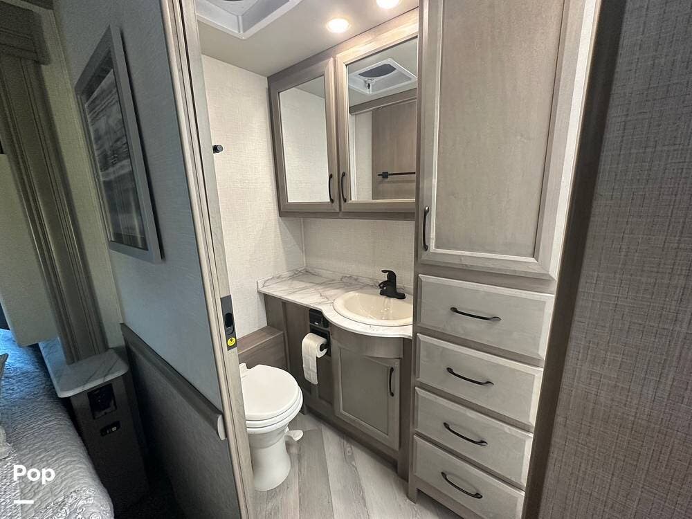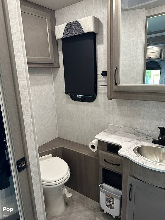The Bounder 35K features two bathrooms: a full rear bathroom with a large shower, porcelain toilet, and vanity, and a convenient half-bath located mid-coach, ensuring comfort and convenience for all travelers.