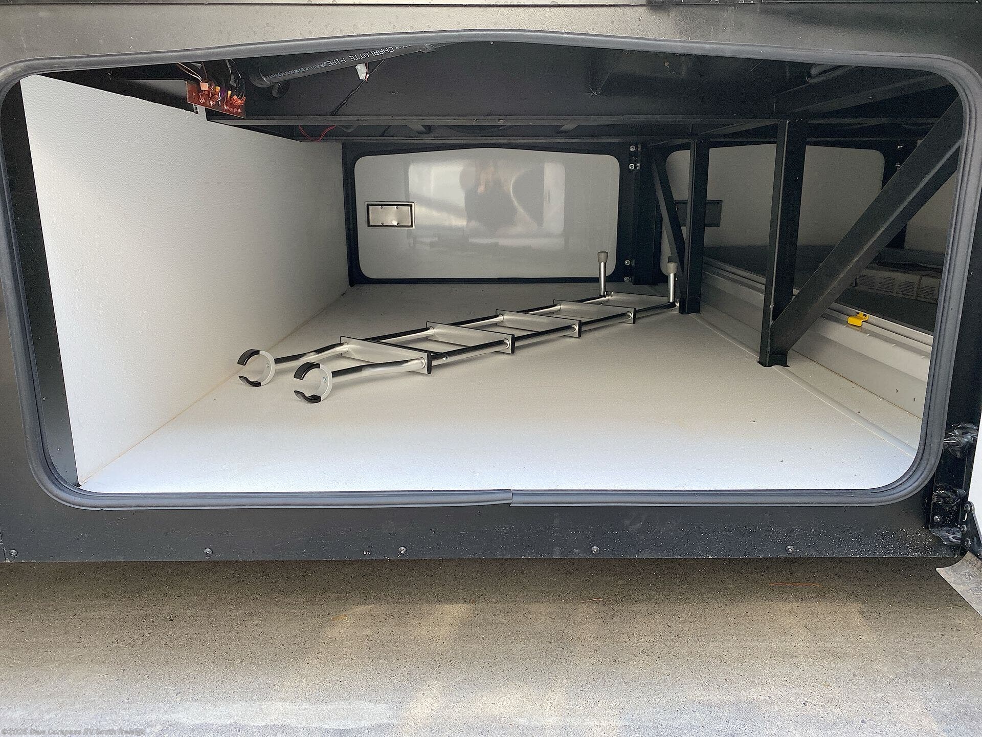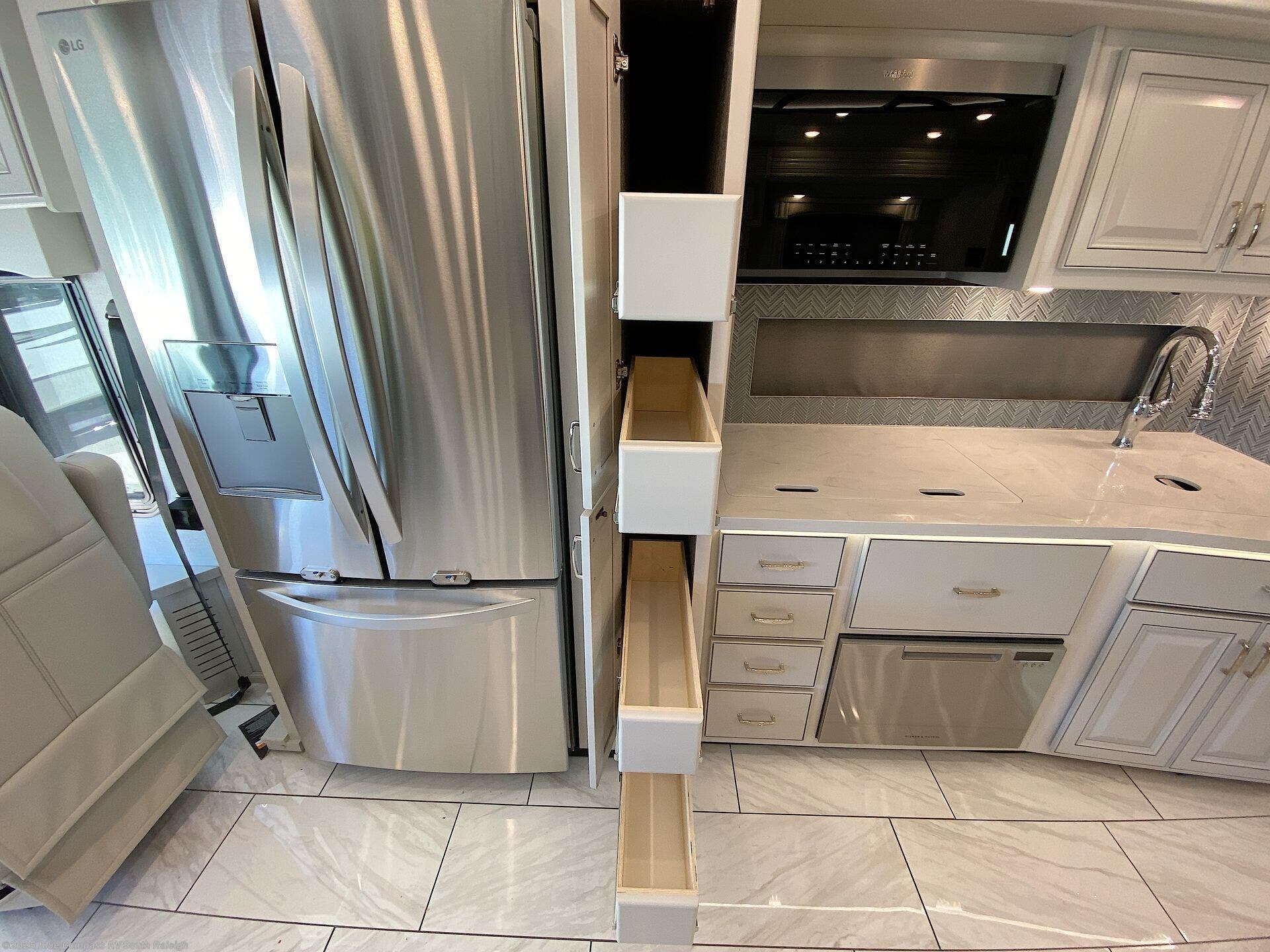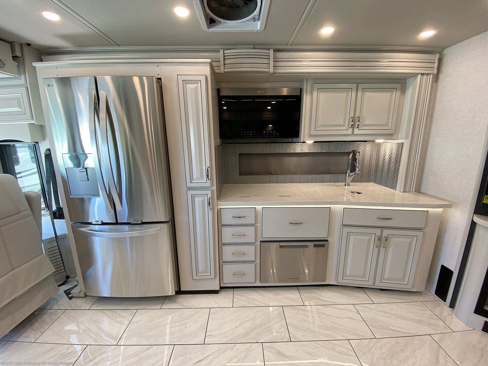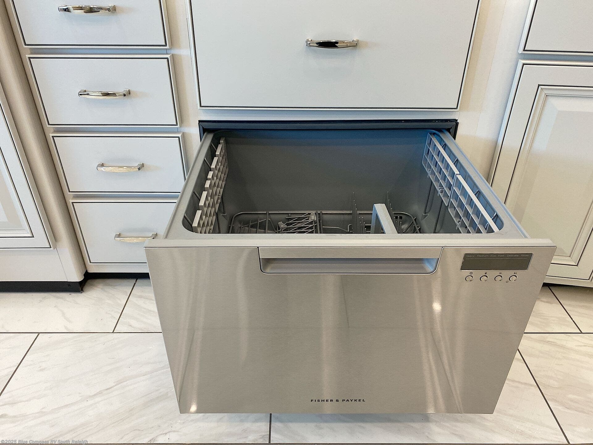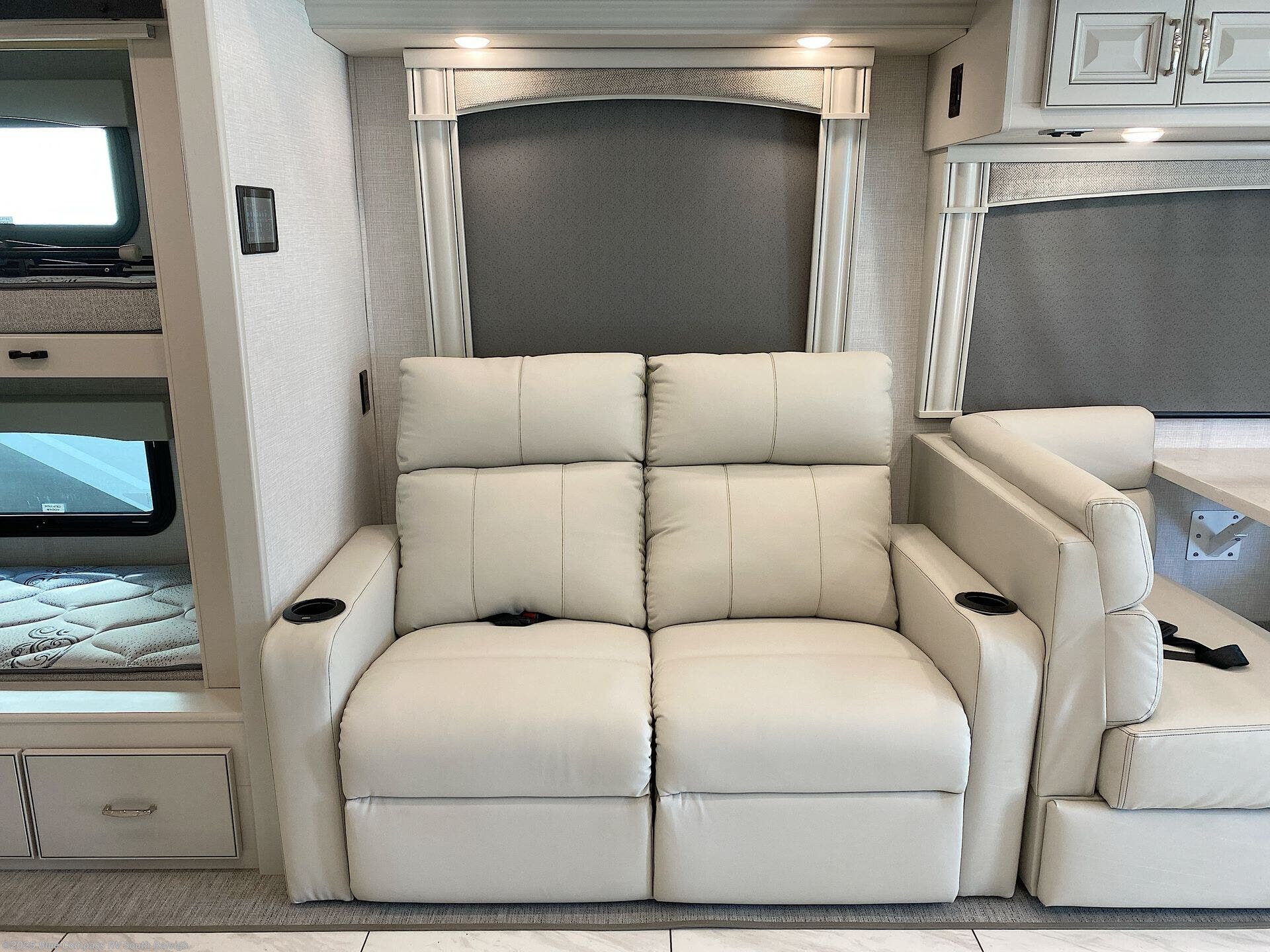 This coach offers a family or a couple that enjoys entertaining overnight guests plenty of sleeping space with the convertible bunk beds with barn doors. You can sleep even more guests when the optional Hide-A-Bed power drop-down overhead bunk is added, plus the sofa sleeper with pull-out twin bed and the booth dinette. The main living area also has an LED TV with a fireplace below and an LED TV over the cab to watch. The two full bathrooms shorten the waiting lines, and are convenient for all. The rear bathroom that is attached to the master bedroom even has a bedroom wardrobe. The bedroom provides a king bed slide for more floor space, and a side-by-side washer/dryer to keep everything clean while on the road, an LED TV to watch before bedtime, and more clothing storage. The kitchen offers stainless steel appliances, a convection microwave, an induction cooktop and so much more!