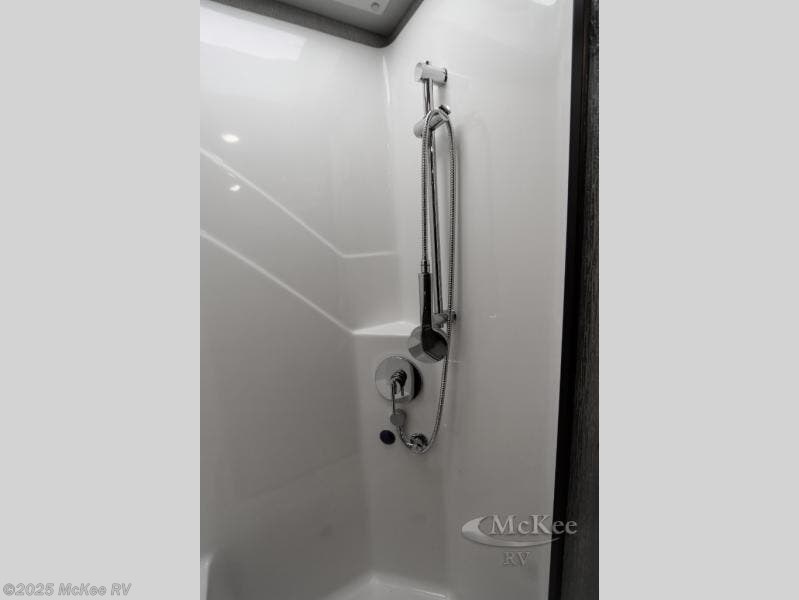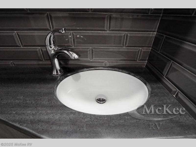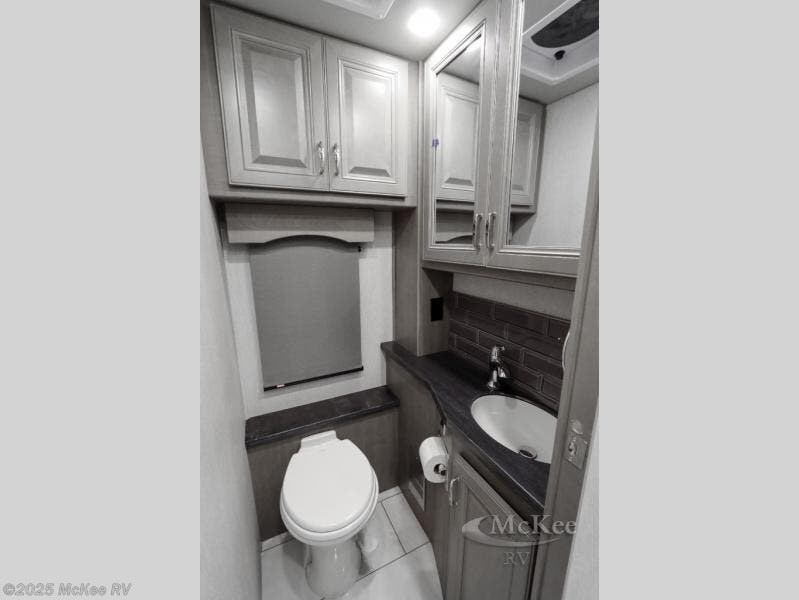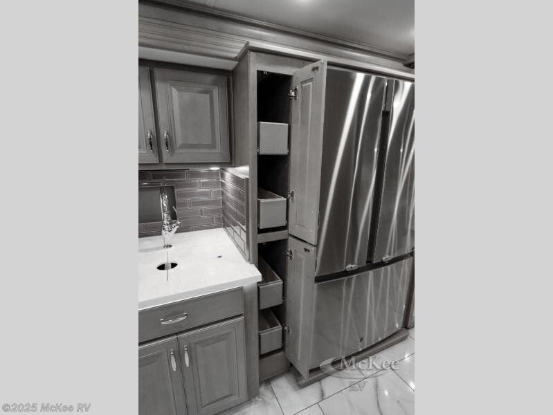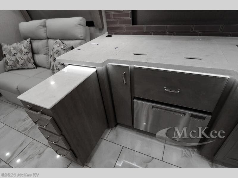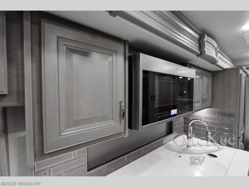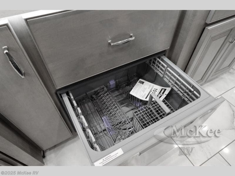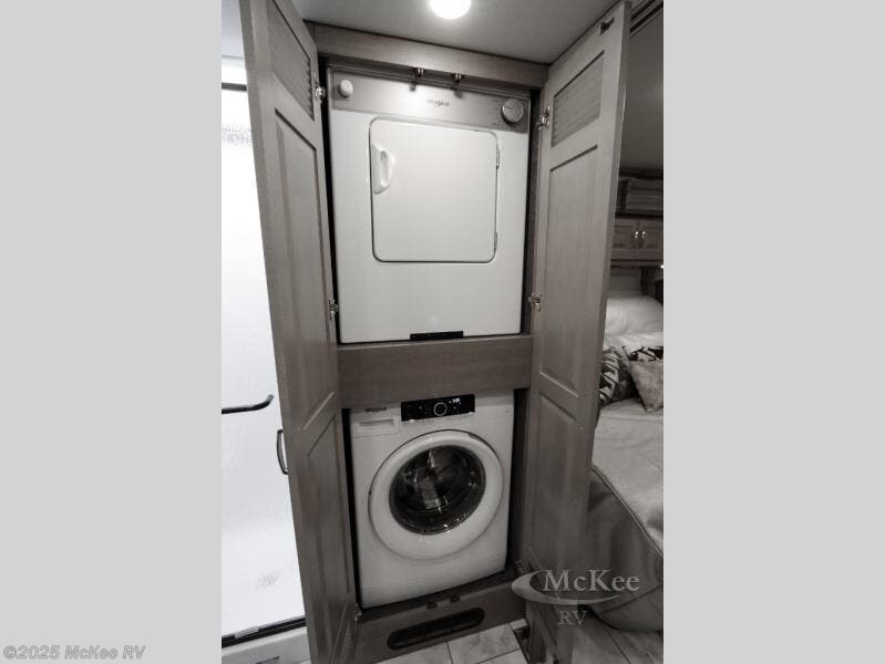 Travel for the love of it, work while traveling, or drive across country to see family and friends! You can do it all in this coach with luxury and residential features throughout and with many conveniences and comforts to keep you on the road. You will love the spacious full bathroom off of the master bedroom that offers two sinks, a fiberglass shower with a seat, glass door and designer shower head assembly. You will be able to keep everything clean using the stackable washer/dryer, and there is a linen closet for fresh towels. The king bed slide provides more floor space, and the two wardrobes, dresser and LED TV are more highlights in the bedroom. The mid-coach half bath is convenient especially when you have guests, and the sofa sleeper with pull-out full bed and the loveseat offer more sleeping space. You might like to add the Hide-A-Bed power drop-down overhead bunk option so you can invite more overnight guests. And the kitchen is something to boast about with the convection microwave, the residential refrigerator and the style of the polished solid surface galley countertop with lighting.