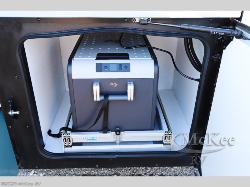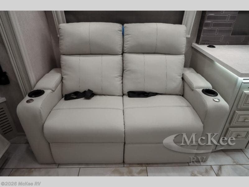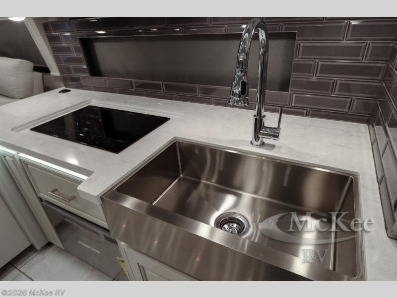 You will love traveling with friends and family in this spacious and luxurious coach. The full rear bath features dual bath sinks, a tile shower with a seat, plus a stackable washer and dryer. You will have plenty of space for your clothes in the dual bedroom wardrobes, and the Encore Series king bed is sure to bring comfort. The chef of your group will love cooking in the kitchen on the two burner induction cooktop, and there is a pull-out galley top here for more counter space. Your guests can relax on the sofa sleeper with full mattress, the sofa, or dine at the free-standing dinette with Credenza. There are four TV's found throughout this model, including an exterior entertainment center with an added Bluetooth speaker!