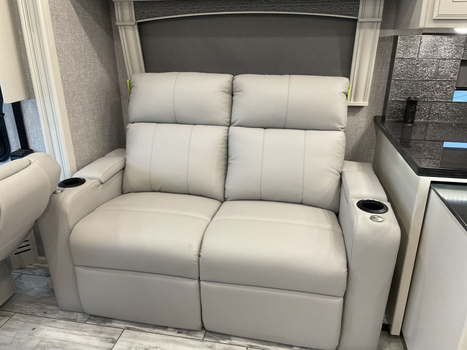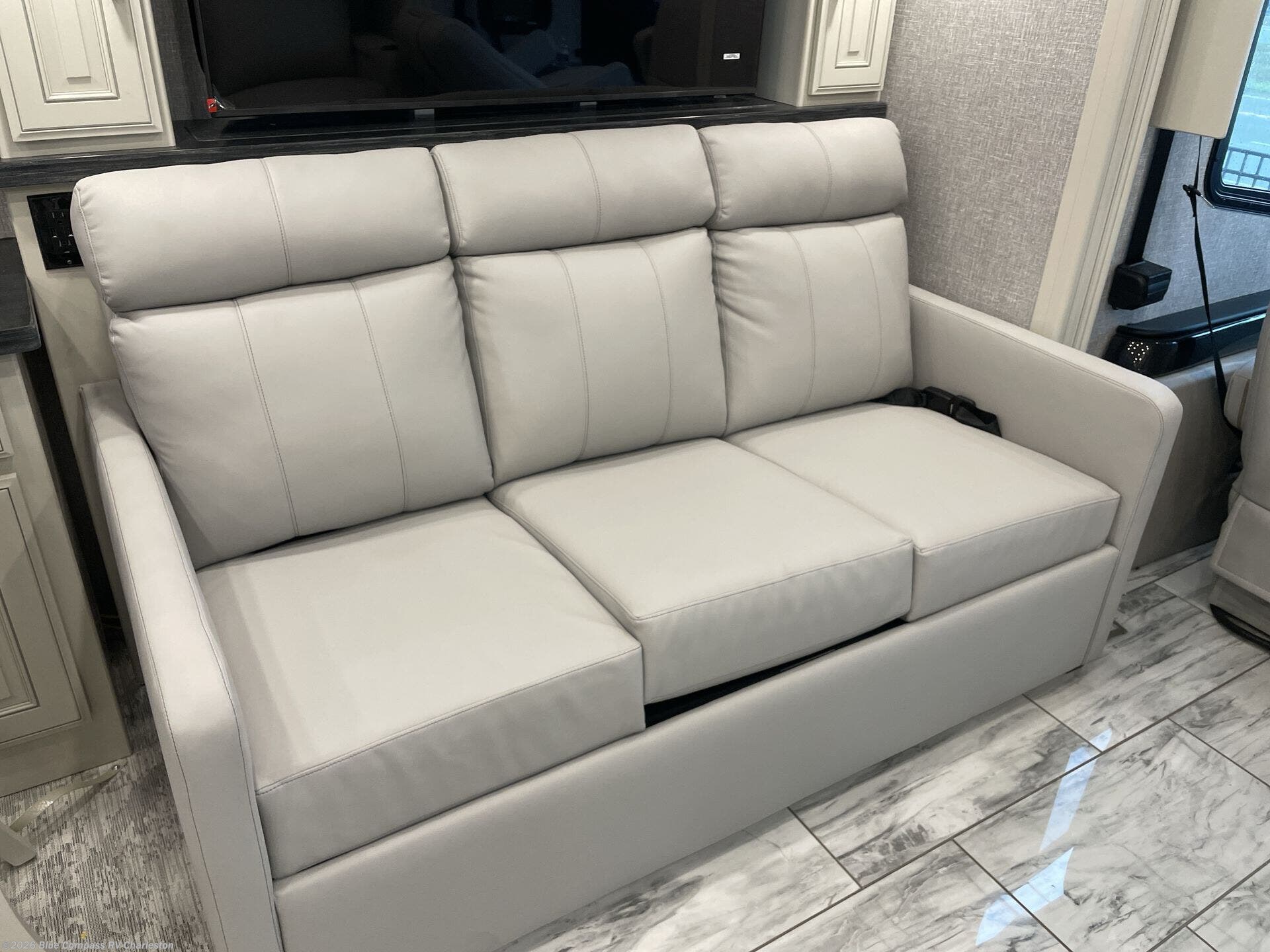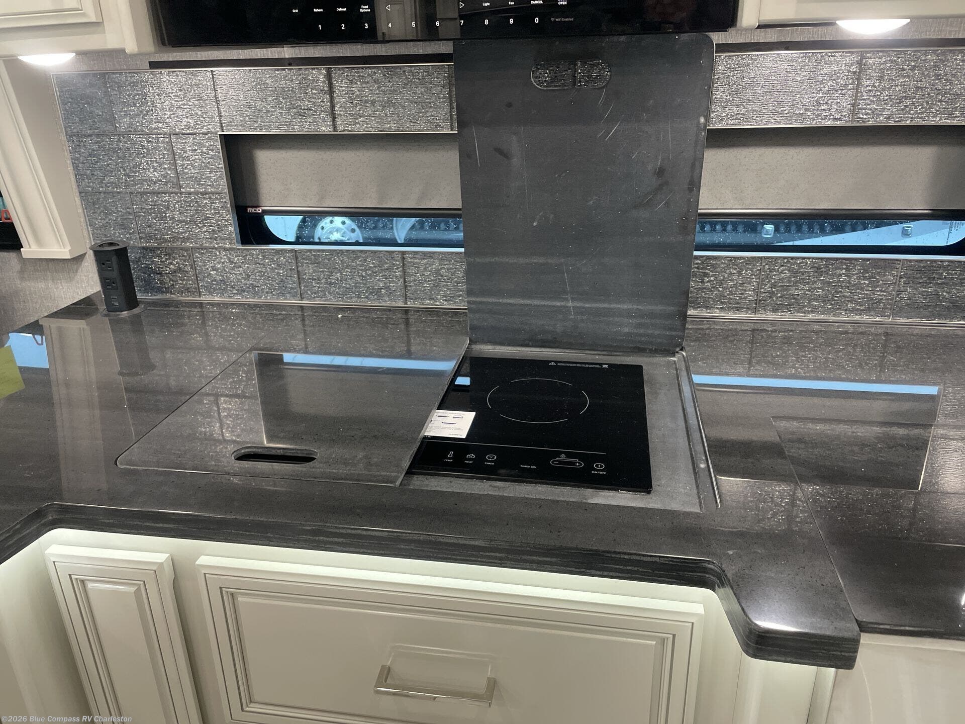 You will love traveling with friends and family in this spacious and luxurious coach. The full rear bath features dual bath sinks, a tile shower with a seat, plus a stackable washer and dryer. You will have plenty of space for your clothes in the dual bedroom wardrobes, and the Encore Series king bed is sure to bring comfort. The chef of your group will love cooking in the kitchen on the two burner induction cooktop, and there is a pull-out galley top here for more counter space. Your guests can relax on the sofa sleeper with full mattress, the sofa, or dine at the free-standing dinette with Credenza. There are four TV's found throughout this model, including an exterior entertainment center with an added Bluetooth speaker!