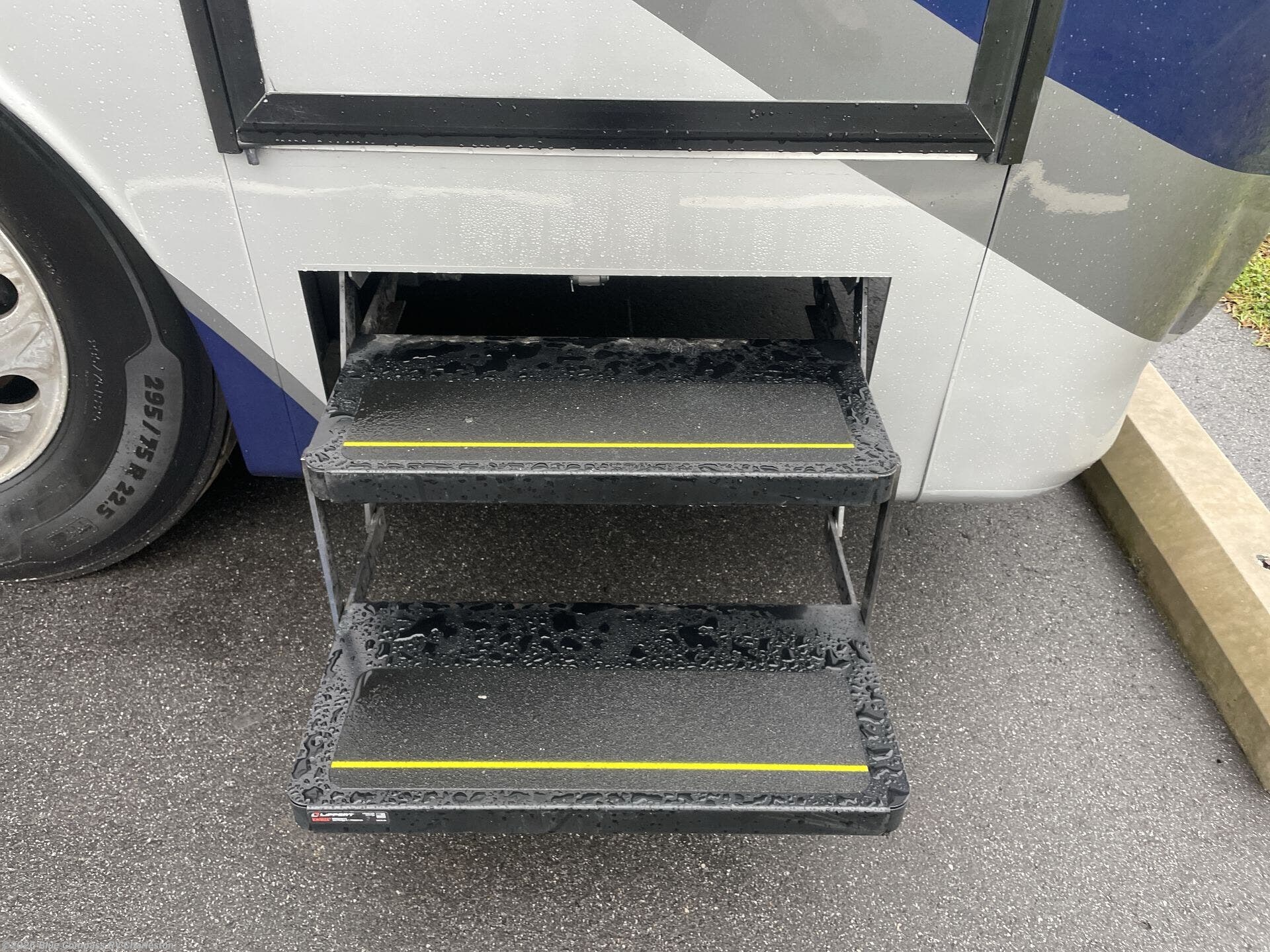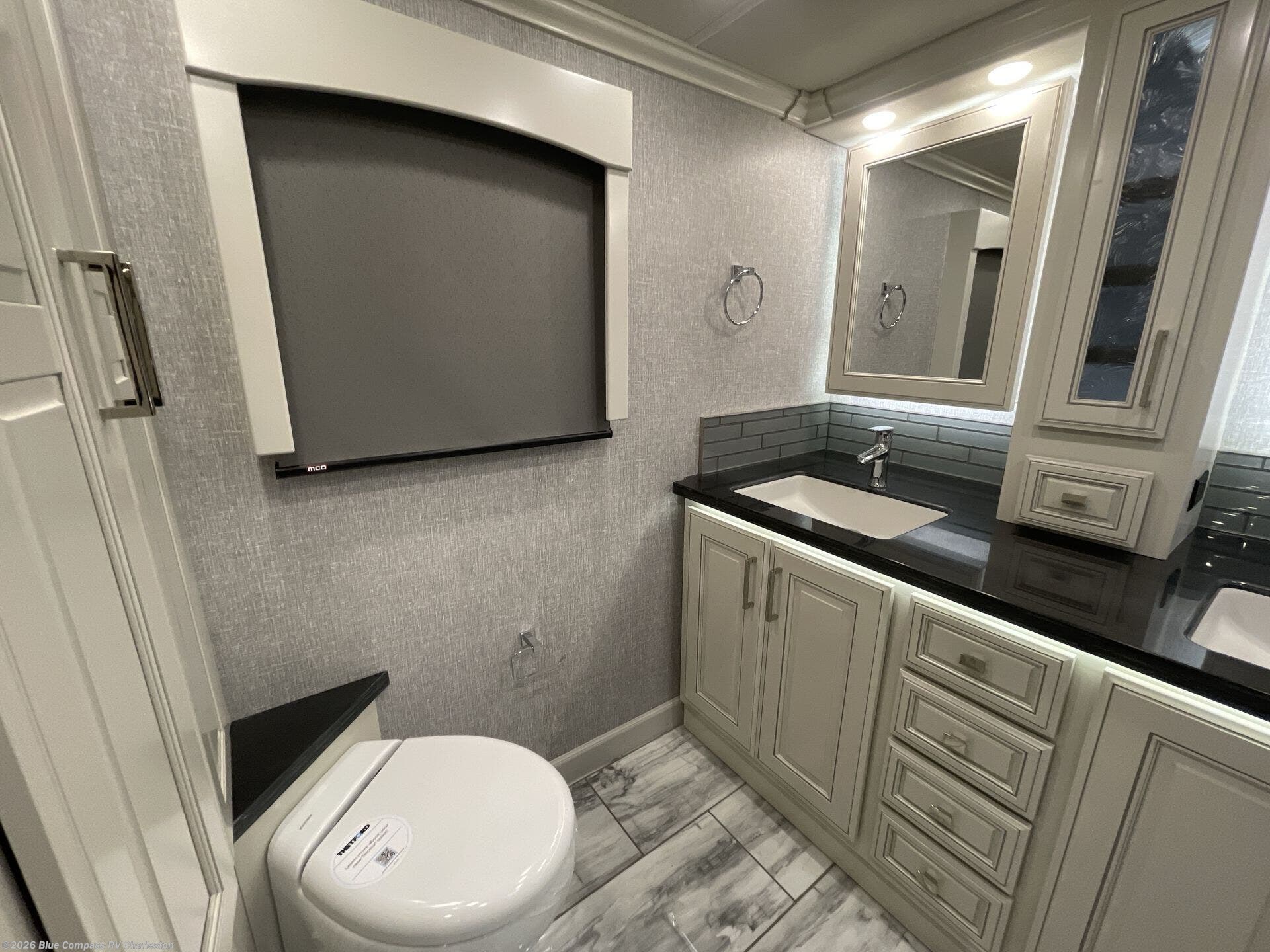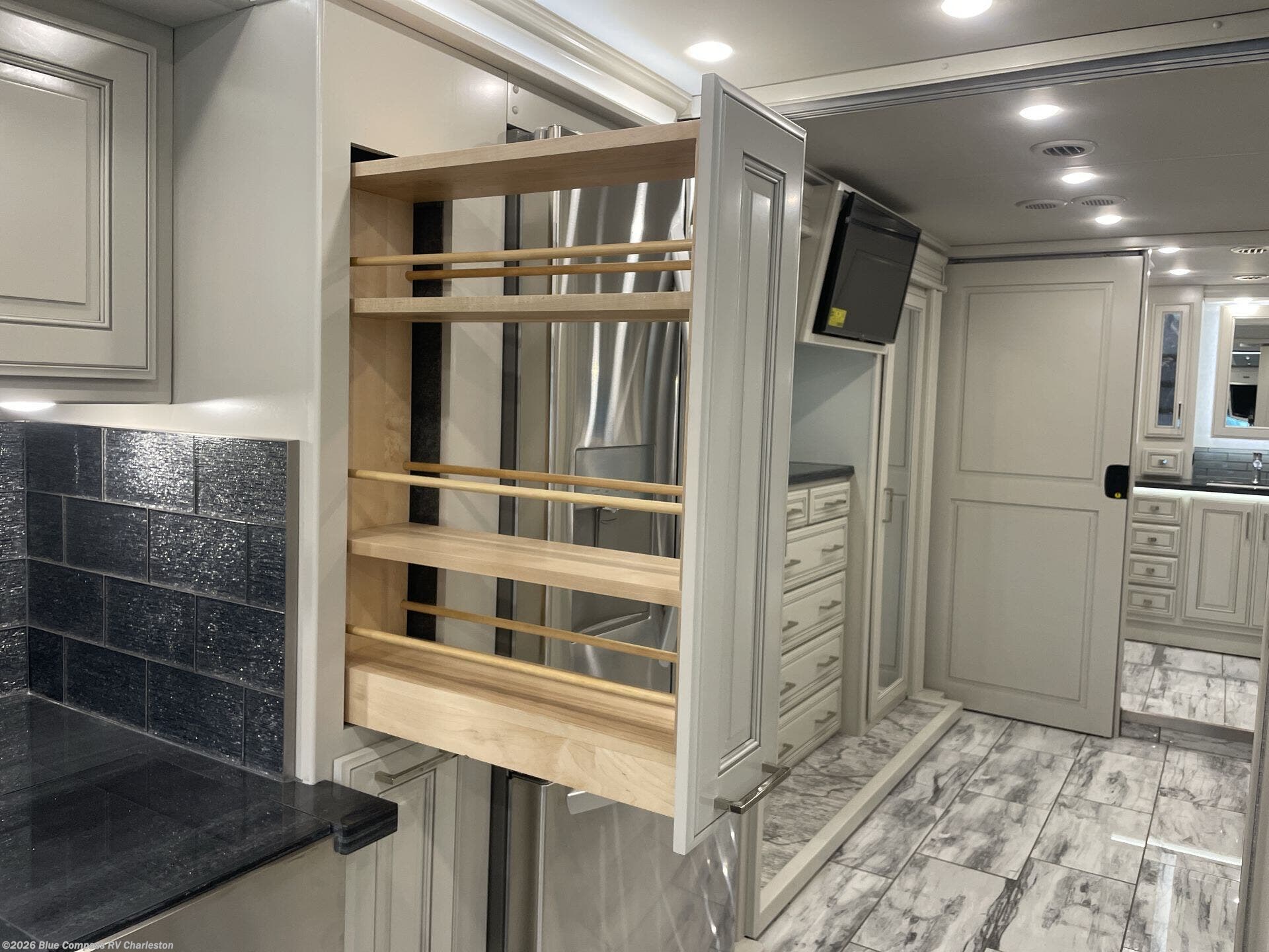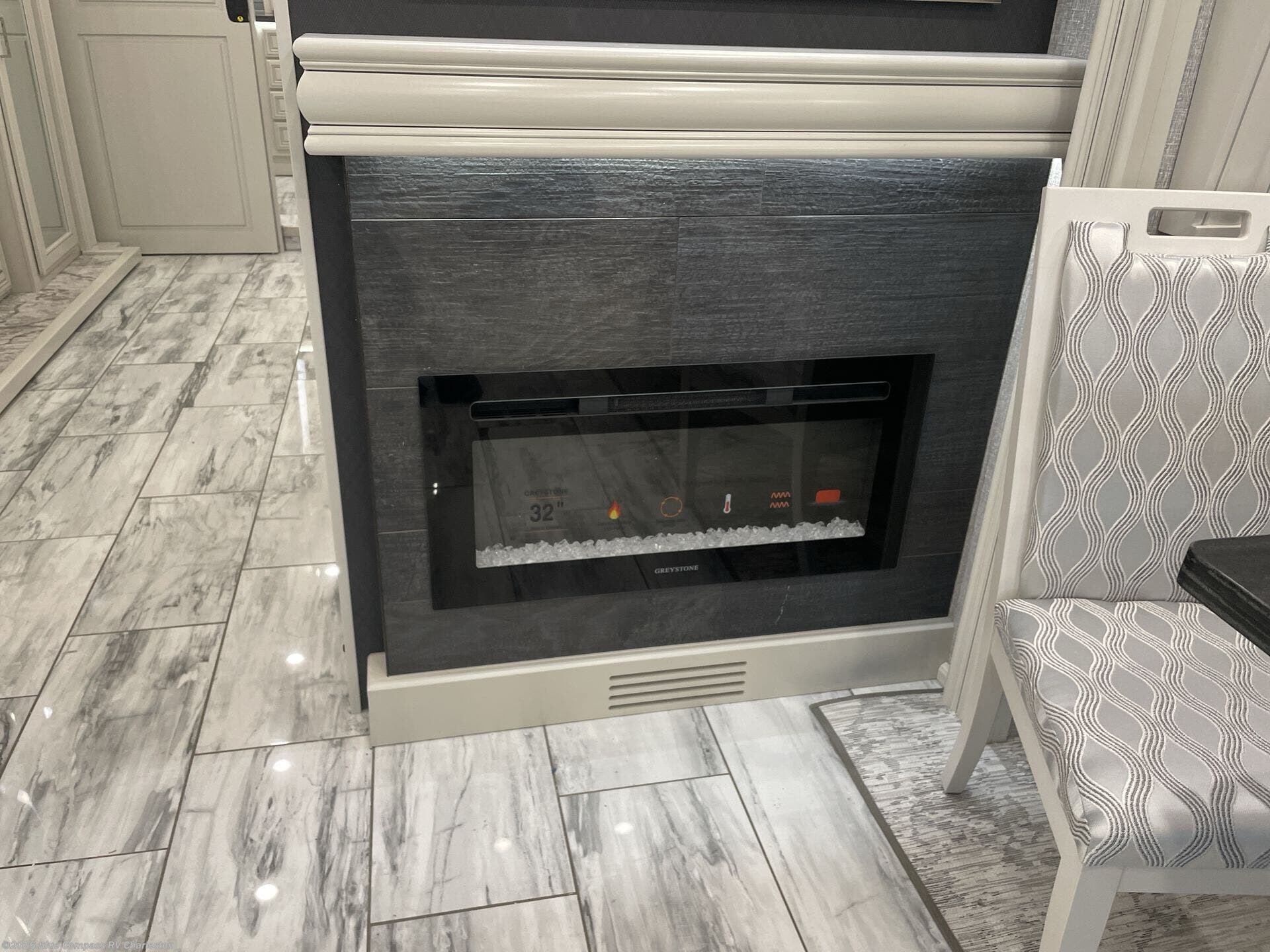 You will love traveling with friends and family in this spacious and luxurious coach. The full rear bath features dual bath sinks, a tile shower with a seat, plus a stackable washer and dryer. You will have plenty of space for your clothes in the dual bedroom wardrobes, and the Encore Series king bed is sure to bring comfort. The chef of your group will love cooking in the kitchen on the two burner induction cooktop, and there is a pull-out galley top here for more counter space. Your guests can relax on the sofa sleeper with full mattress, the sofa, or dine at the free-standing dinette with Credenza. There are four TV's found throughout this model, including an exterior entertainment center with an added Bluetooth speaker!