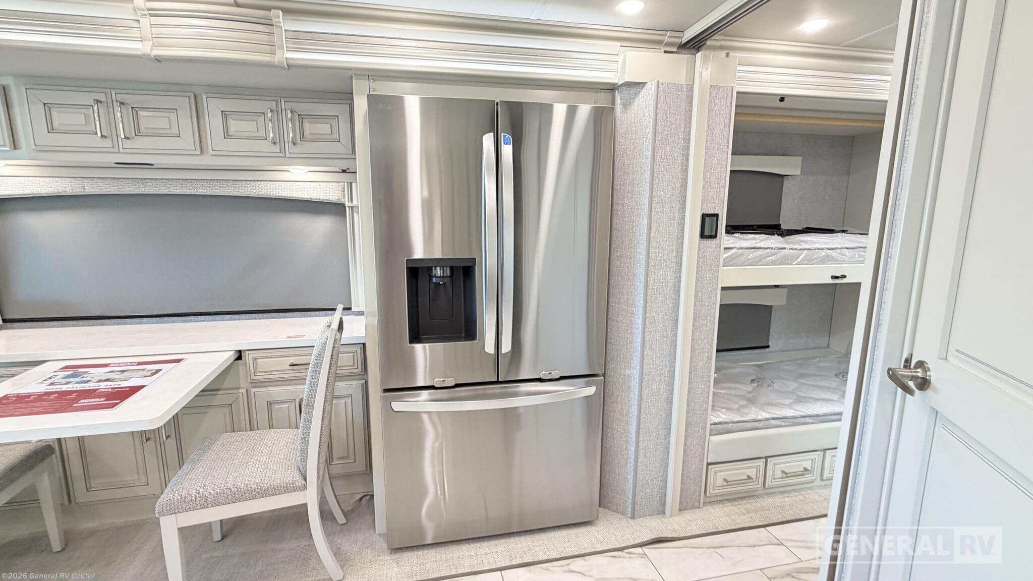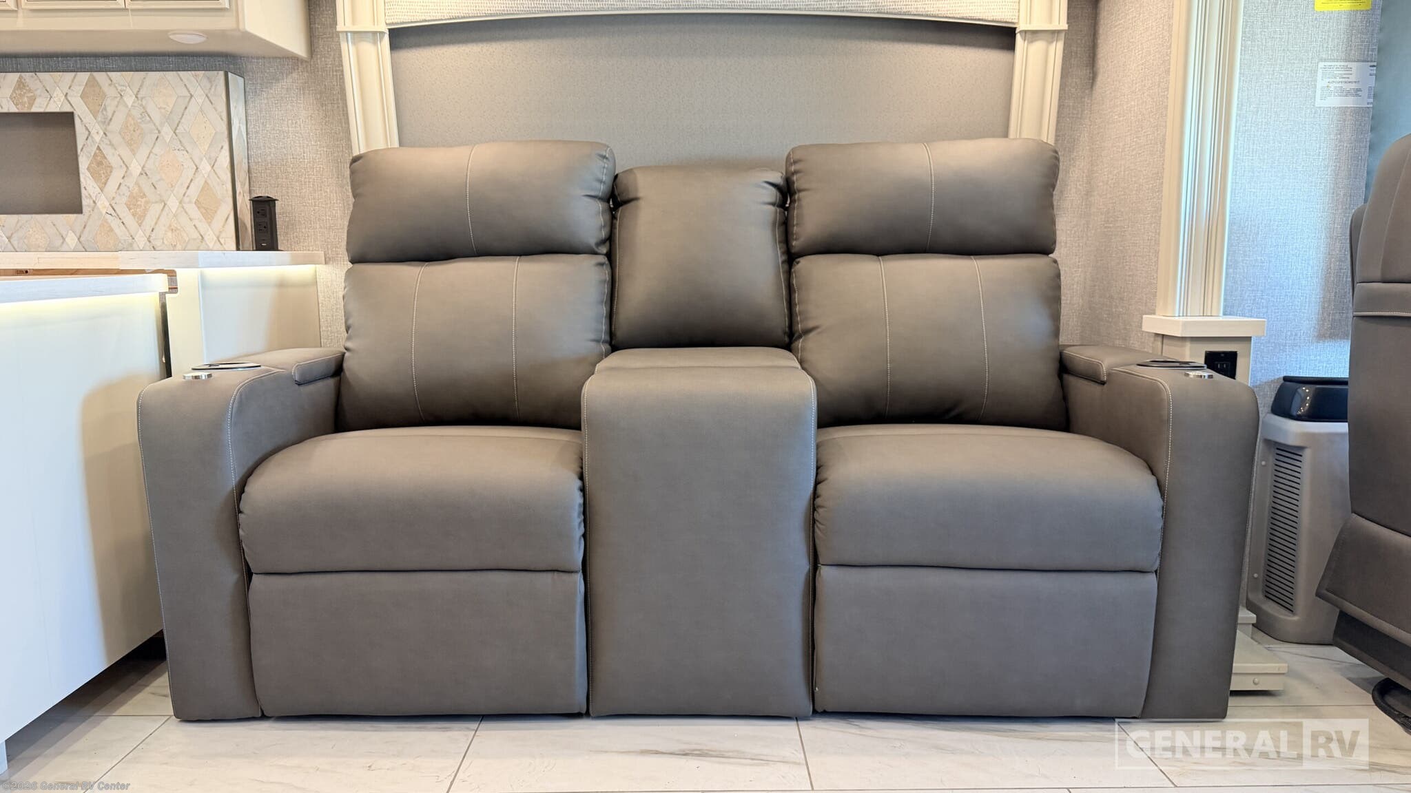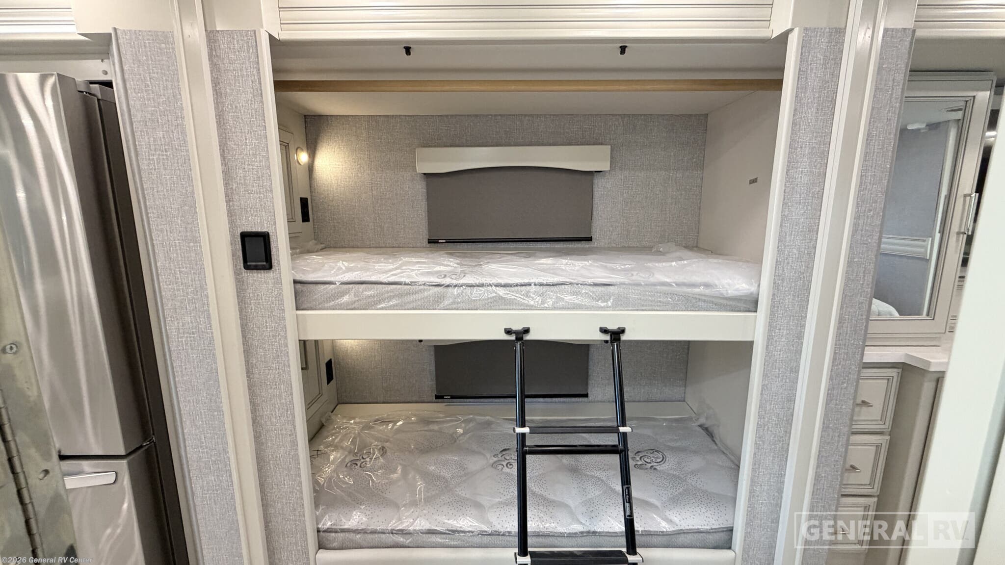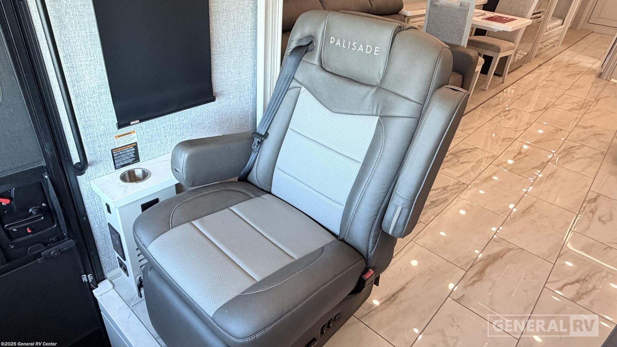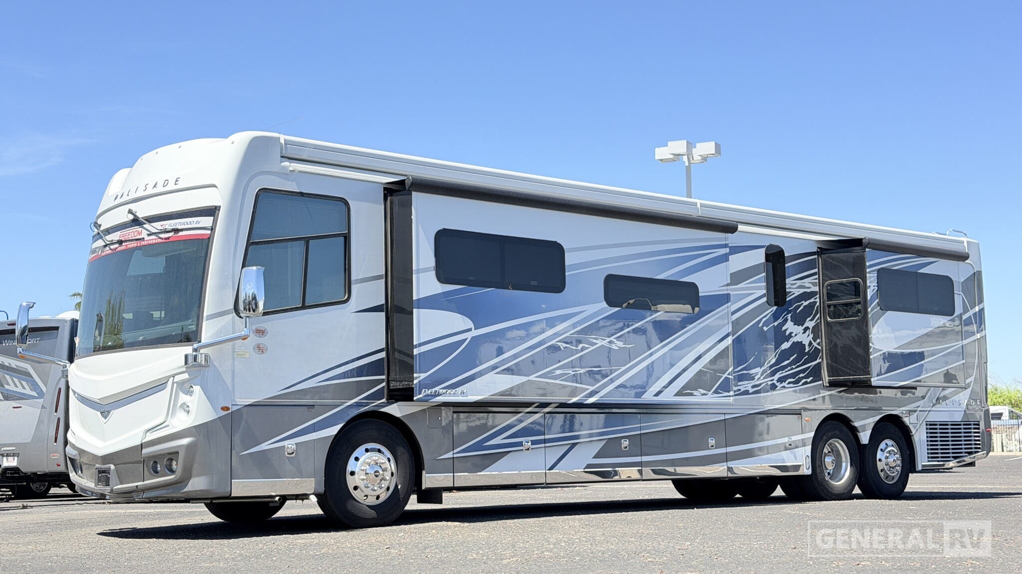 Step into the future of luxury travel with the 2025 Fleetwood Palisade 45FS. This magnificent diesel pusher, powered by a robust Cummins I6 engine, is designed for those who crave adventure without sacrificing comfort. With a spacious length of nearly 45 feet, this RV offers a thoughtfully designed floorplan that includes a front living area perfect for entertaining, complete with a 50" motion power lounge and a 72" sleeper sofa. The center kitchen, equipped with a convection microwave and full-size electric refrigerator, makes meal preparation a breeze, whether you're parked at a campsite or on the move. The Palisade 45FS is not just about luxury; it's about practicality too. It features a well-appointed center bedroom with a king-sized bed and convertible bunks, making it ideal for families or groups, comfortably sleeping up to eight. Enjoy the convenience of a washer and dryer and ample storage throughout. The rear and center bath areas, featuring a sophisticated plastic and glass shower, ensure everyone stays refreshed on the road. With a 150-gallon fuel capacity and a towing capacity of 15,000 pounds, your journey is limitless. Experience the perfect blend of elegance and functionality in the Fleetwood Palisade 45FS. For more details, visit your nearest General RV dealership.