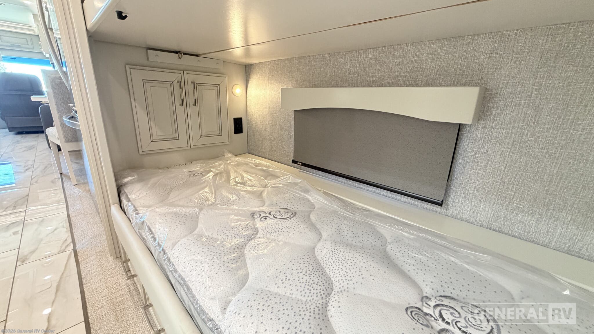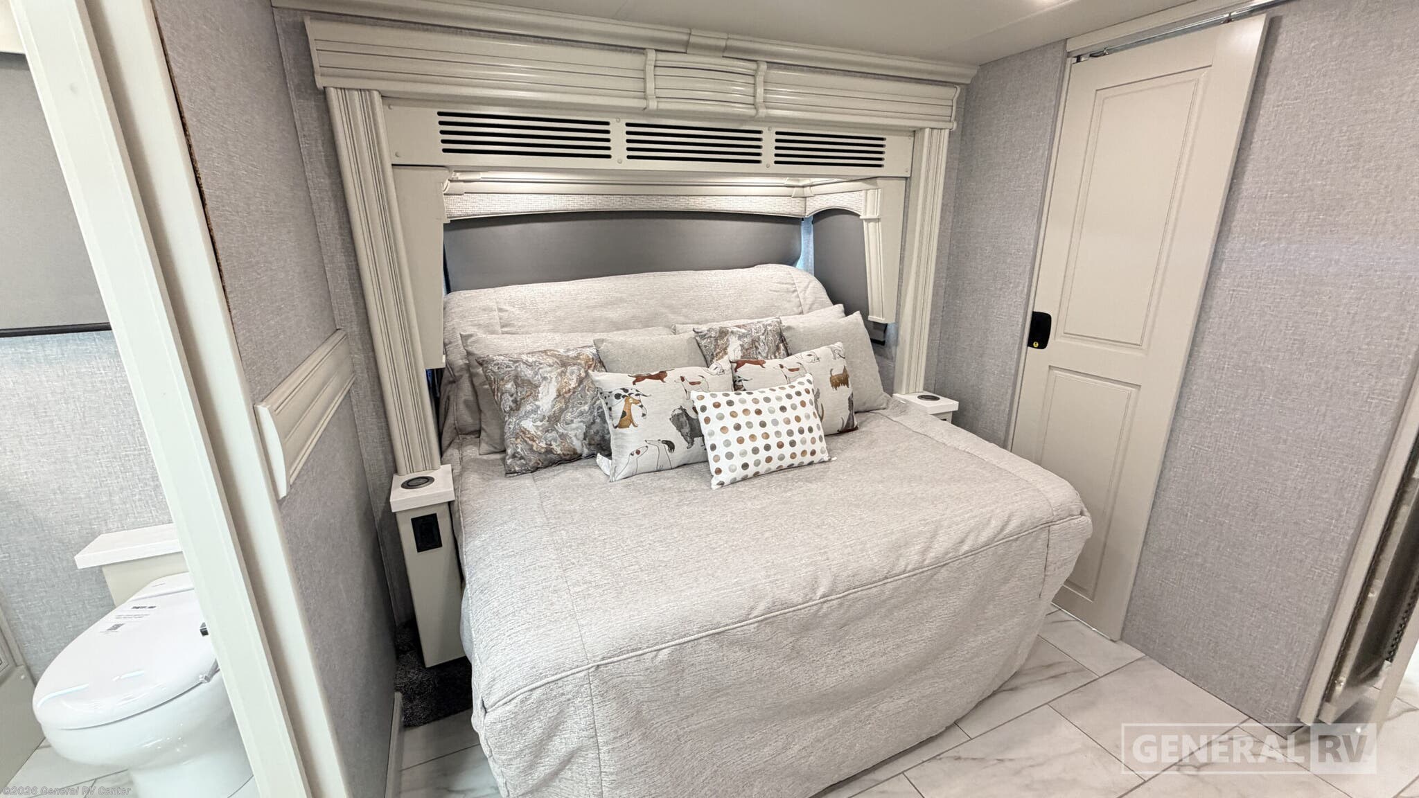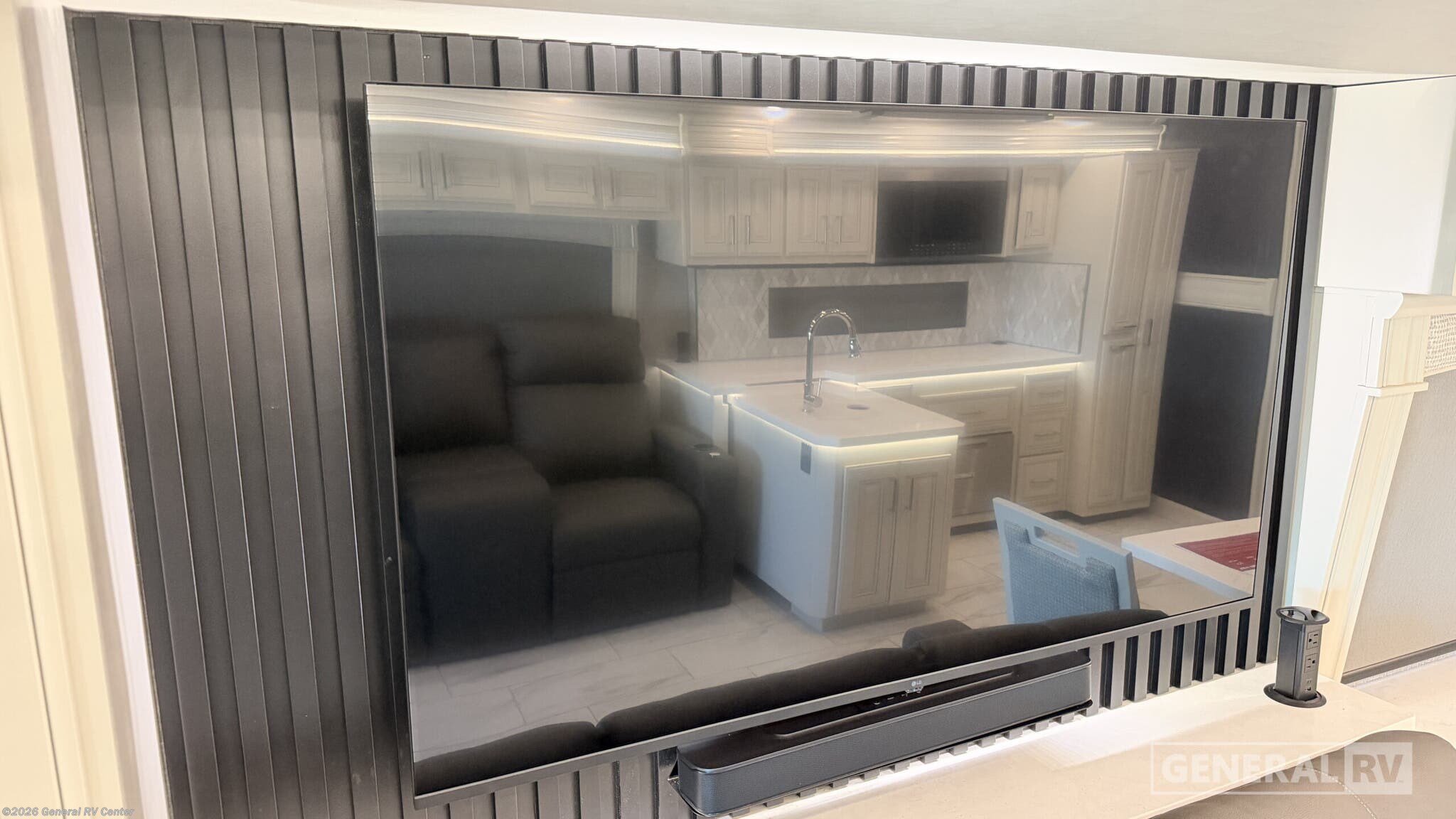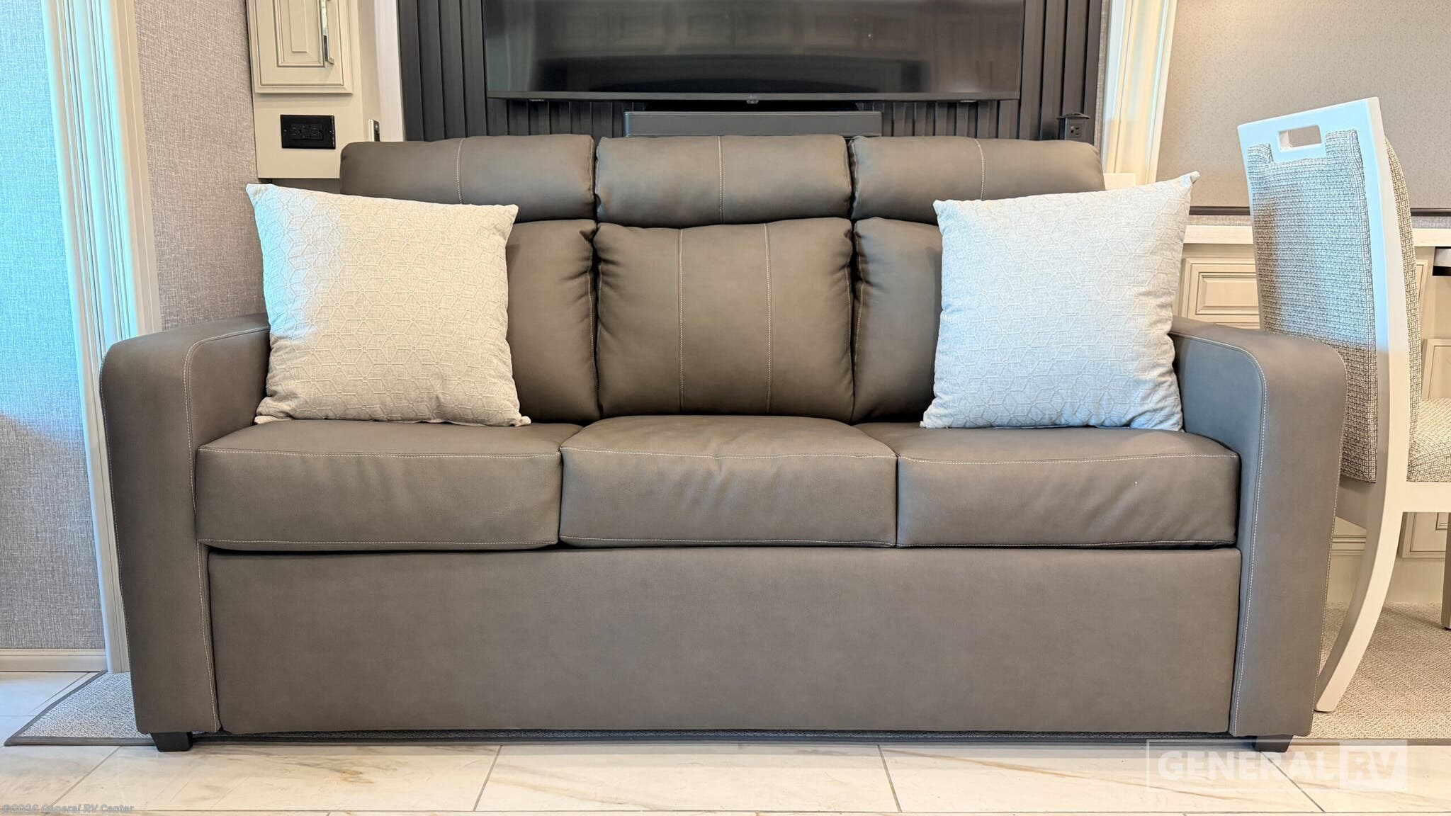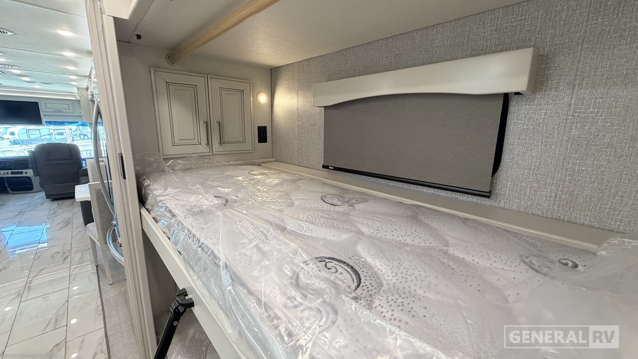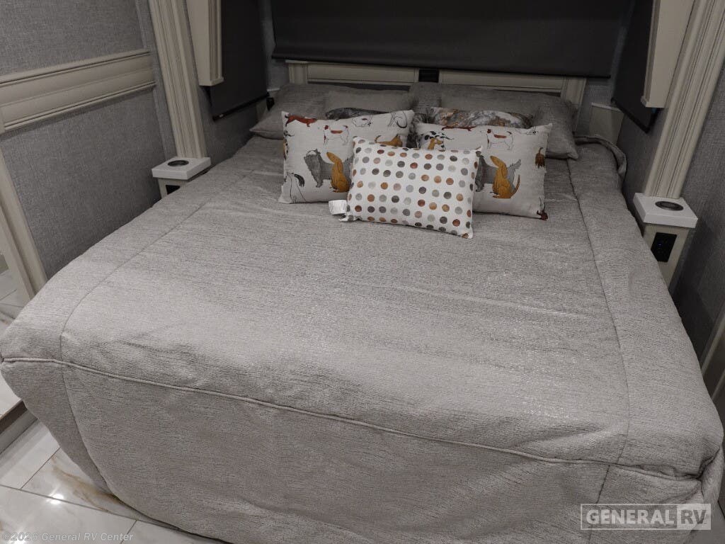 Step into the future of luxury travel with the 2025 Fleetwood Palisade 45FS. This magnificent diesel pusher, powered by a robust Cummins I6 engine, is designed for those who crave adventure without sacrificing comfort. With a spacious length of nearly 45 feet, this RV offers a thoughtfully designed floorplan that includes a front living area perfect for entertaining, complete with a 50" motion power lounge and a 72" sleeper sofa. The center kitchen, equipped with a convection microwave and full-size electric refrigerator, makes meal preparation a breeze, whether you're parked at a campsite or on the move. The Palisade 45FS is not just about luxury; it's about practicality too. It features a well-appointed center bedroom with a king-sized bed and convertible bunks, making it ideal for families or groups, comfortably sleeping up to eight. Enjoy the convenience of a washer and dryer and ample storage throughout. The rear and center bath areas, featuring a sophisticated plastic and glass shower, ensure everyone stays refreshed on the road. With a 150-gallon fuel capacity and a towing capacity of 15,000 pounds, your journey is limitless. Experience the perfect blend of elegance and functionality in the Fleetwood Palisade 45FS. For more details, visit your nearest General RV dealership.