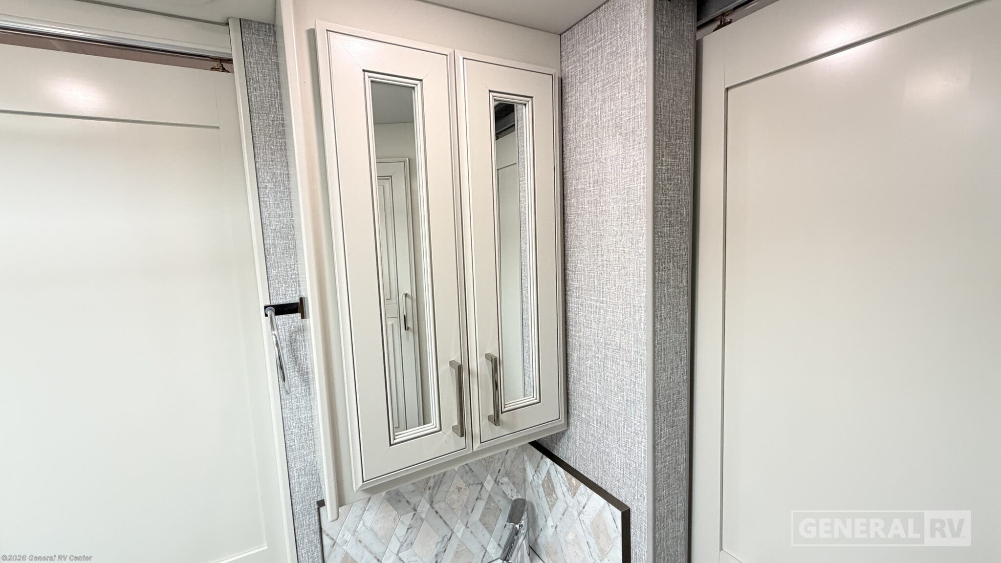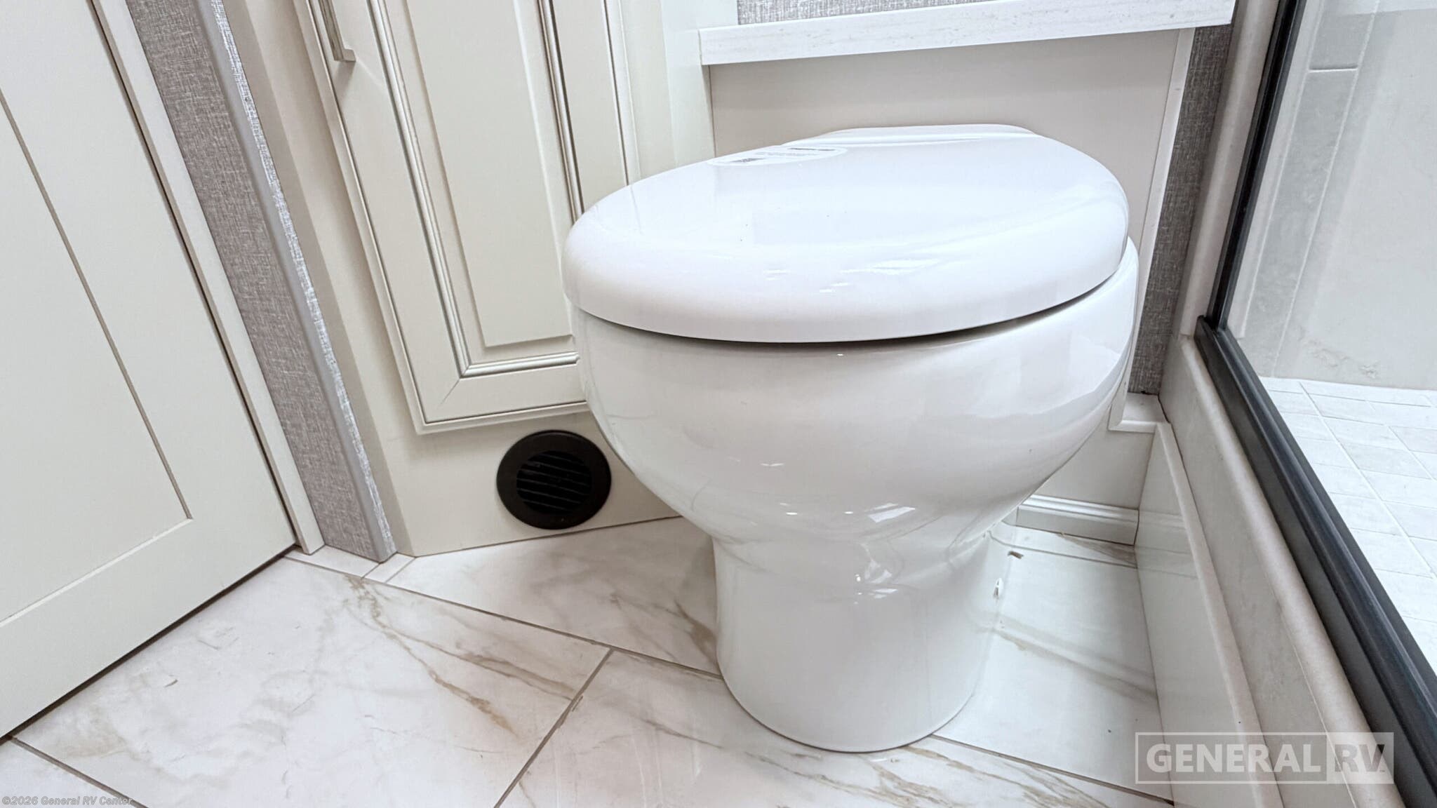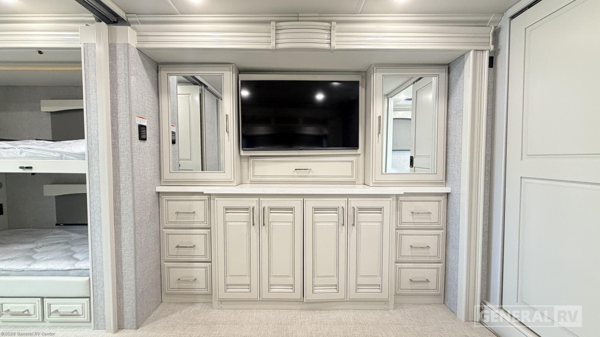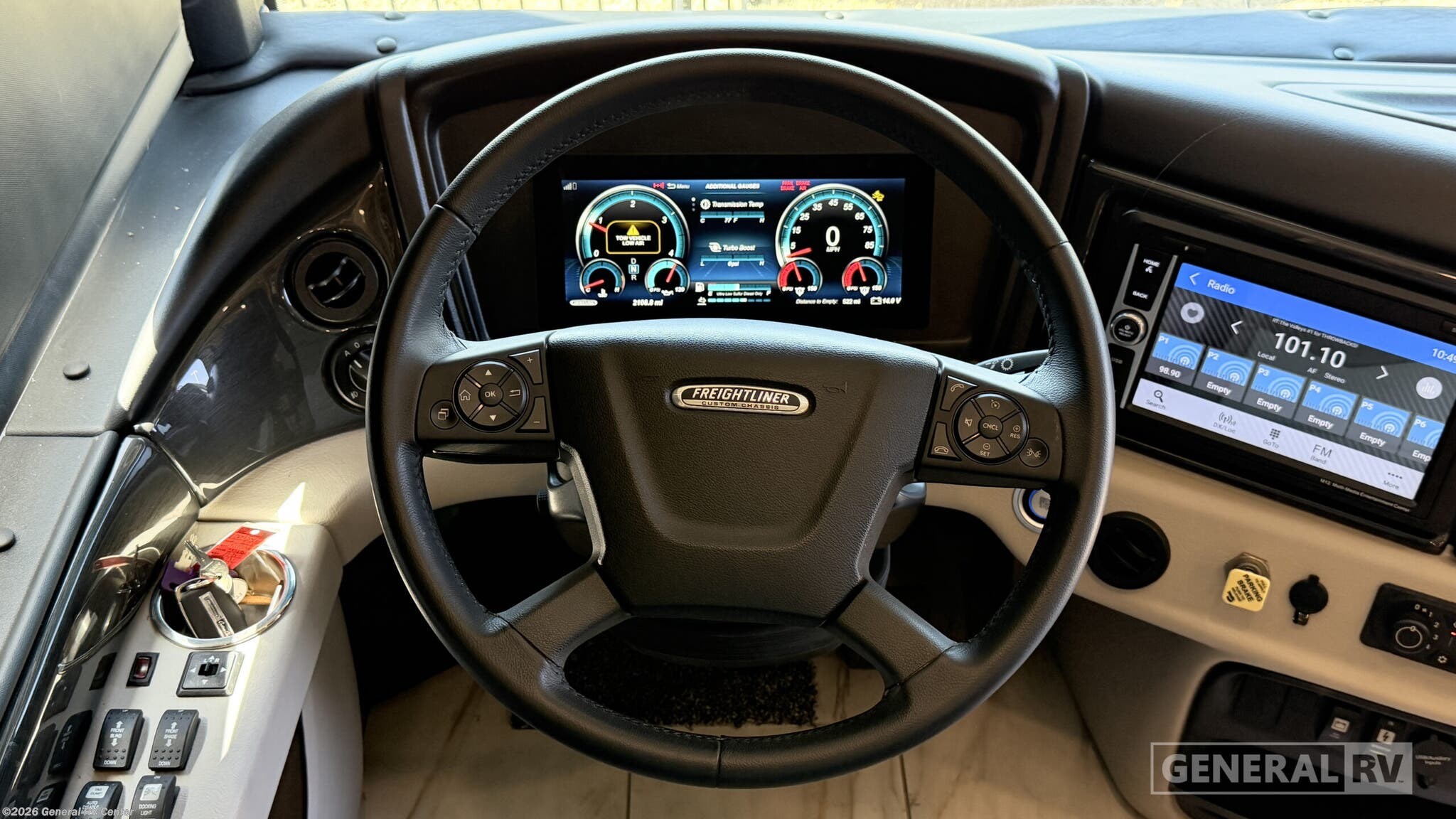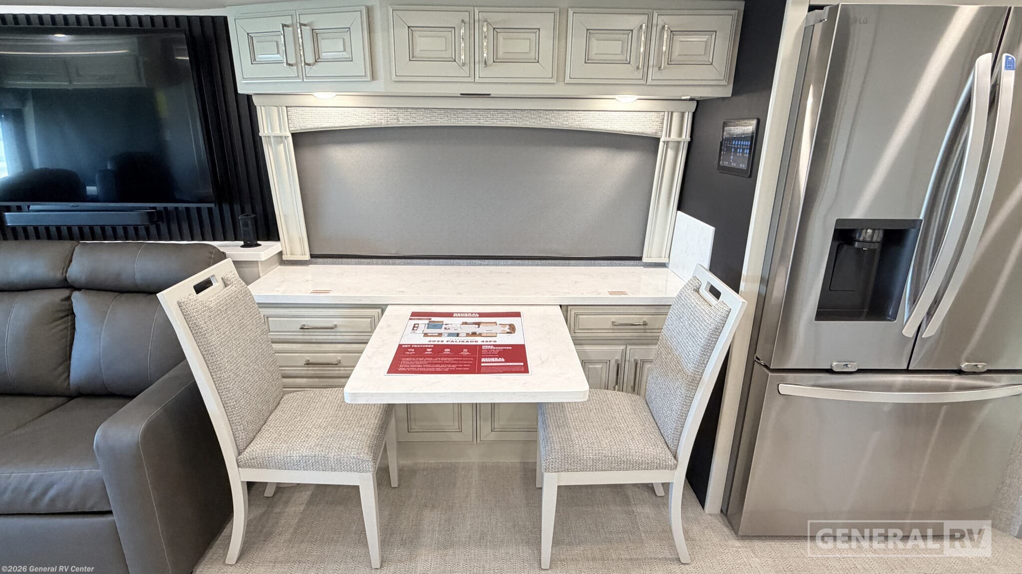 Step into the future of luxury travel with the 2025 Fleetwood Palisade 45FS. This magnificent diesel pusher, powered by a robust Cummins I6 engine, is designed for those who crave adventure without sacrificing comfort. With a spacious length of nearly 45 feet, this RV offers a thoughtfully designed floorplan that includes a front living area perfect for entertaining, complete with a 50" motion power lounge and a 72" sleeper sofa. The center kitchen, equipped with a convection microwave and full-size electric refrigerator, makes meal preparation a breeze, whether you're parked at a campsite or on the move. The Palisade 45FS is not just about luxury; it's about practicality too. It features a well-appointed center bedroom with a king-sized bed and convertible bunks, making it ideal for families or groups, comfortably sleeping up to eight. Enjoy the convenience of a washer and dryer and ample storage throughout. The rear and center bath areas, featuring a sophisticated plastic and glass shower, ensure everyone stays refreshed on the road. With a 150-gallon fuel capacity and a towing capacity of 15,000 pounds, your journey is limitless. Experience the perfect blend of elegance and functionality in the Fleetwood Palisade 45FS. For more details, visit your nearest General RV dealership.
