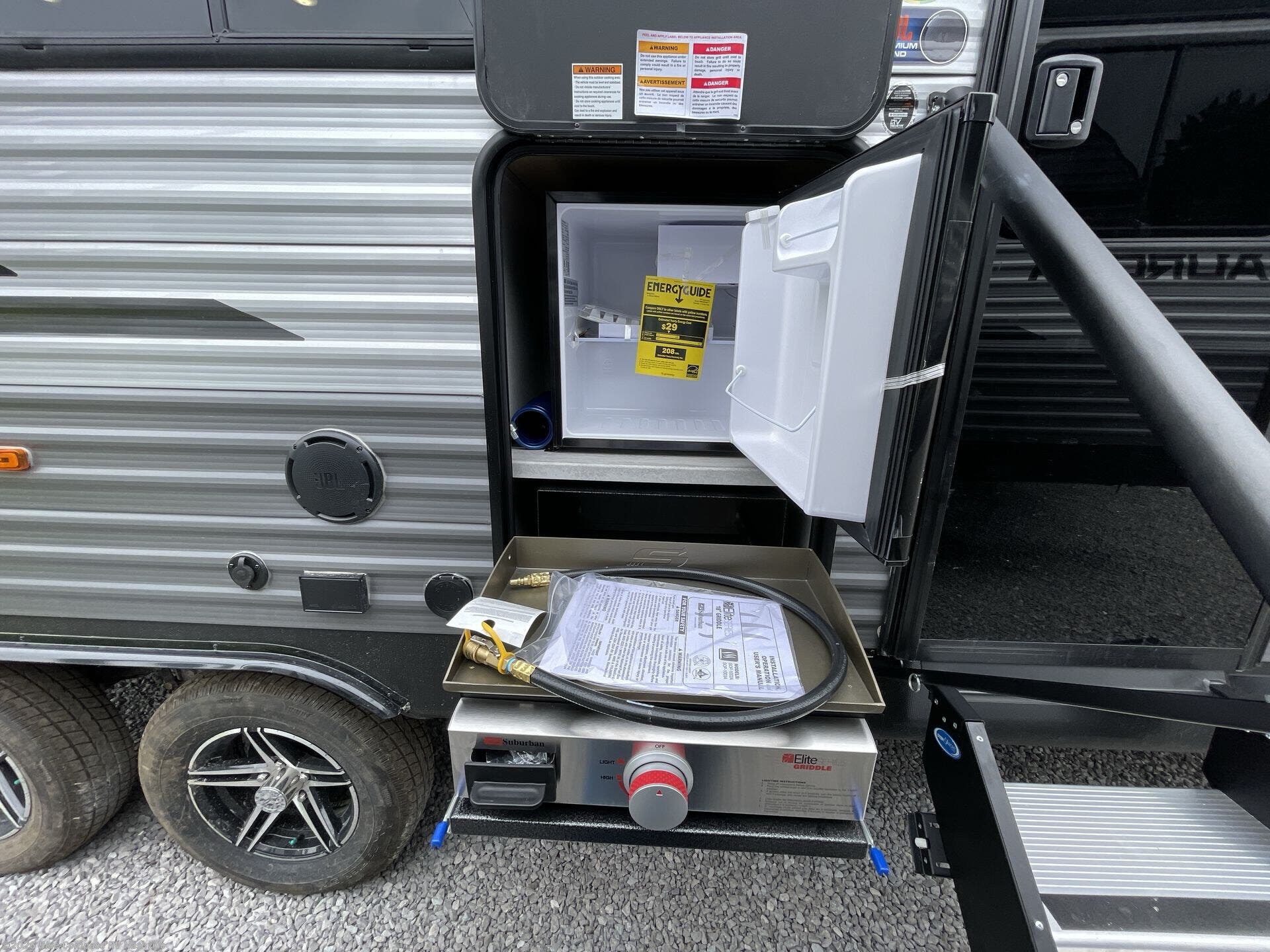 Comfortability, usability, and quality is what you will find in each one of these Forest River Aurora travel trailers, toy haulers or destination trailers! They are designed with a superior build and packed full with industry leading, functional, and distinctive standard features. SolidStep entrance steps and a Safe-T rail door assist on main entry door to help you safely enter and exit the unit. The diamond plate rock guard will protect your unit from road debris and the nitrogen filled radial tires, which keep their pressure longer, offer better fuel economy. You will also find upgraded JBL Elite exterior speakers outside, an electric awning with multicolor lights and remote, plus flush mount baggage doors for easy packing. The interiors are beautifully designed with a deep undermount farm style sink, stainless steel appliances, and linoleum flooring in the slide outs which will be easy to clean. Come find your favorite model today!