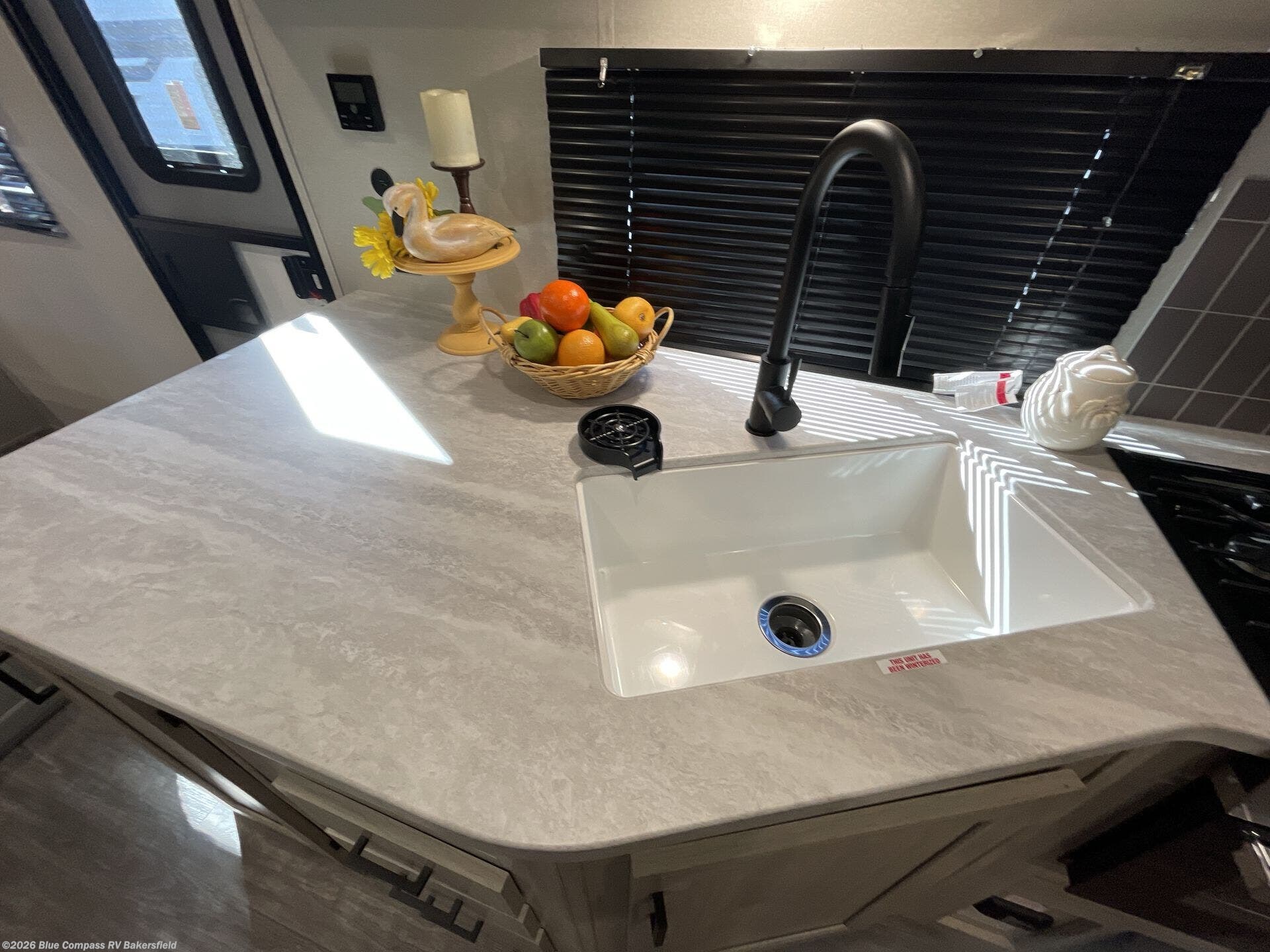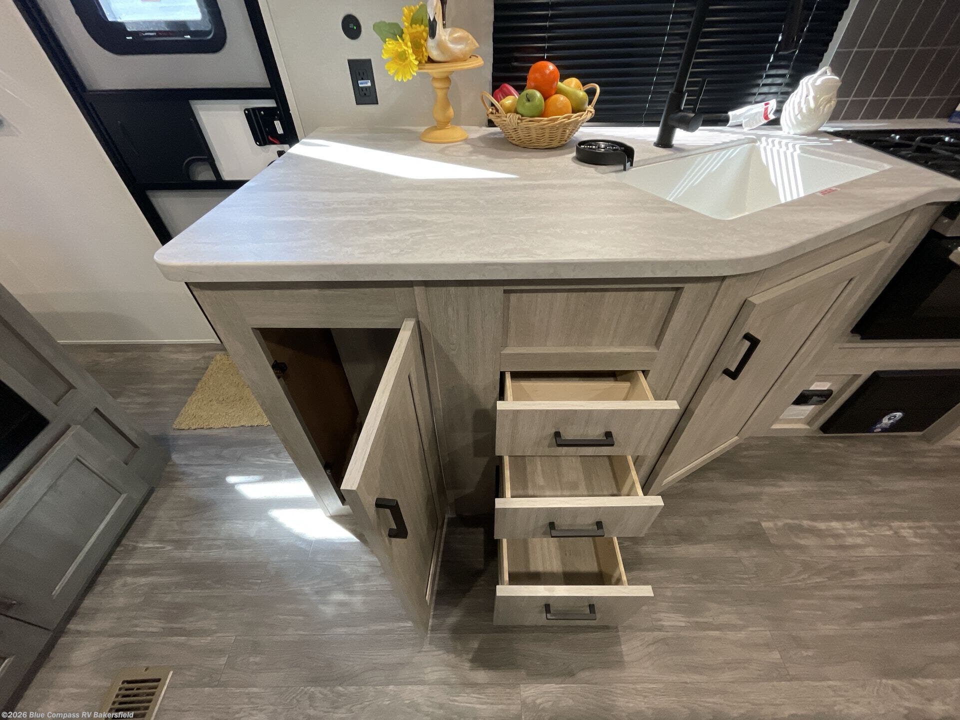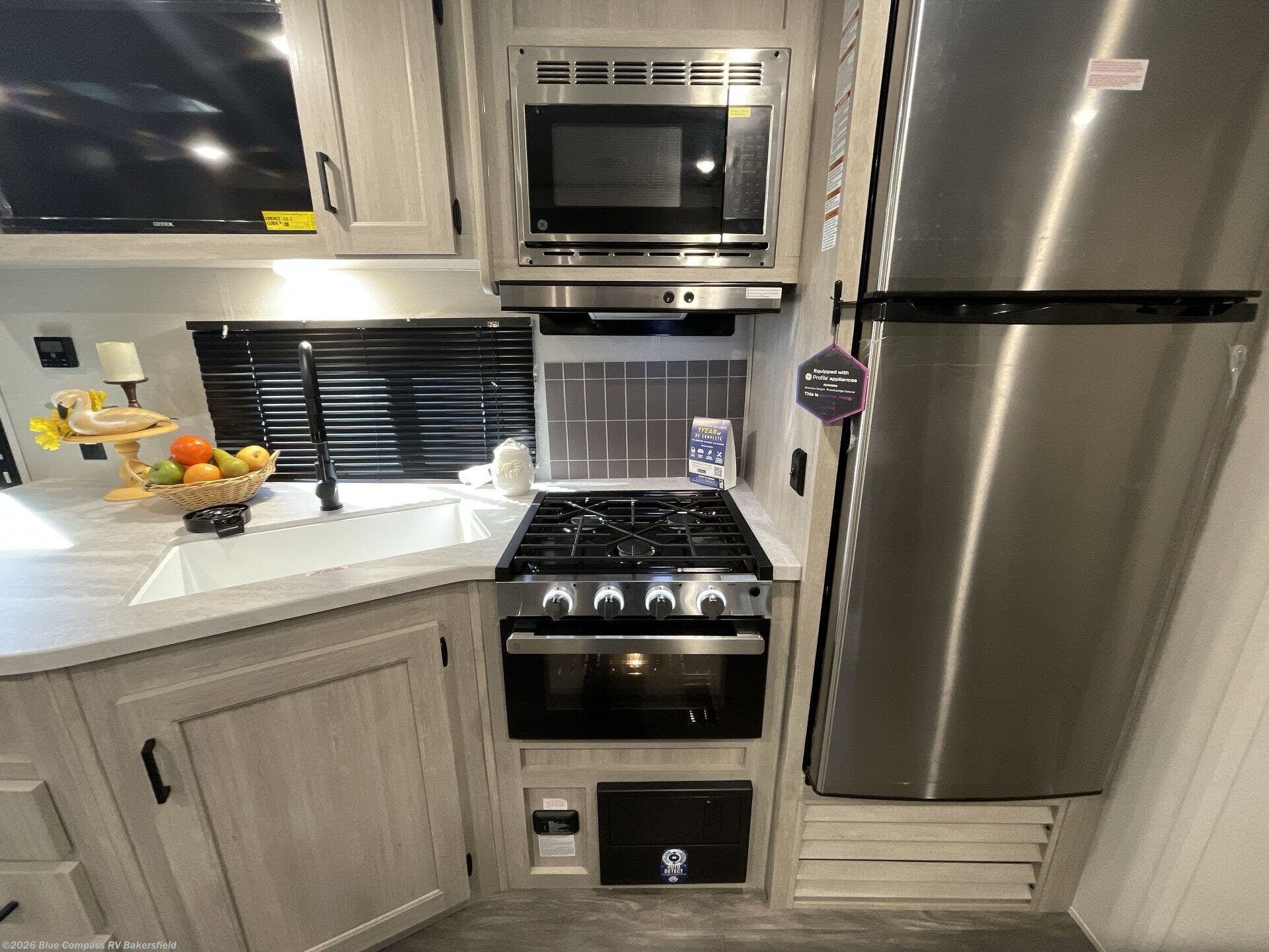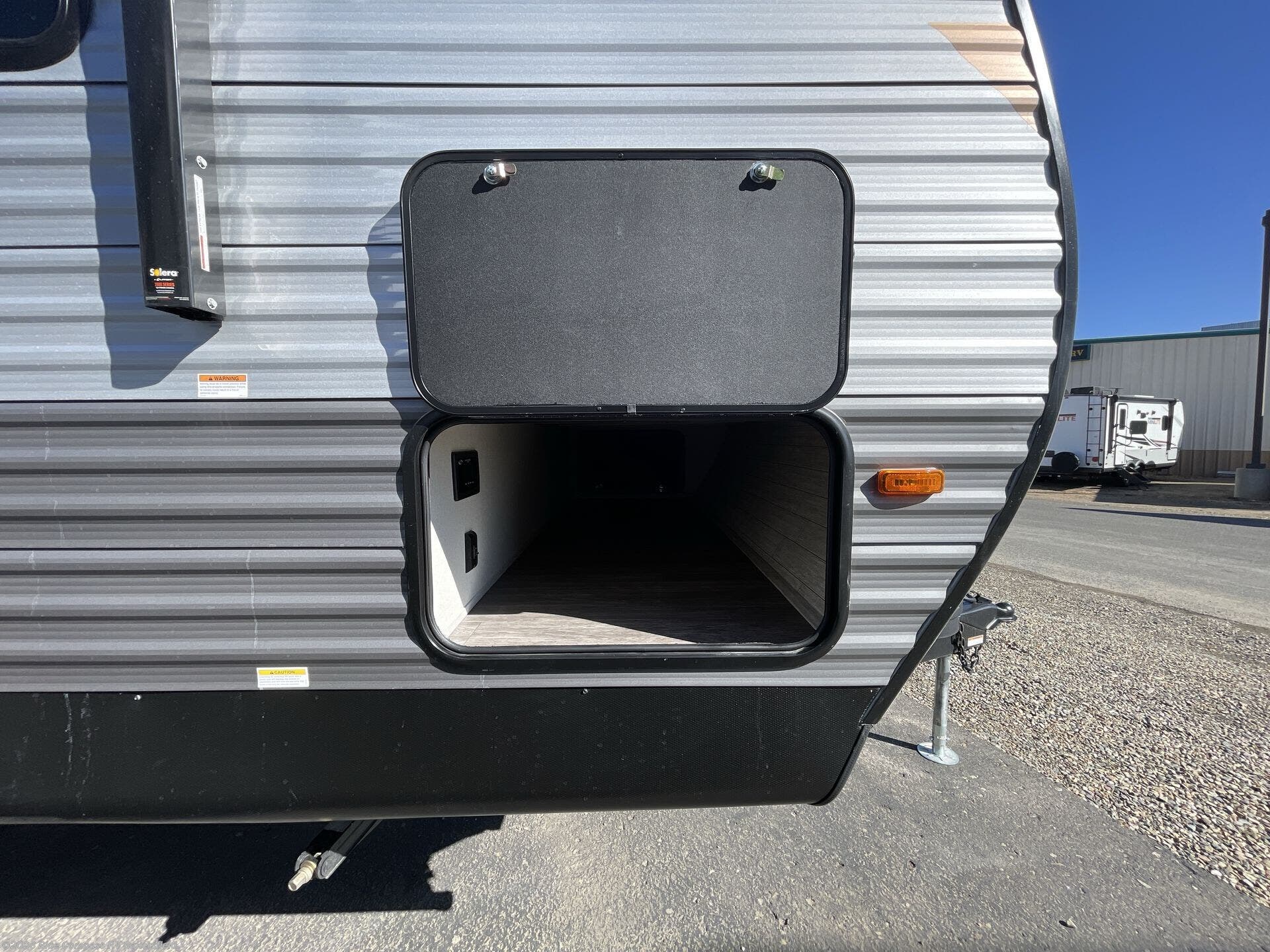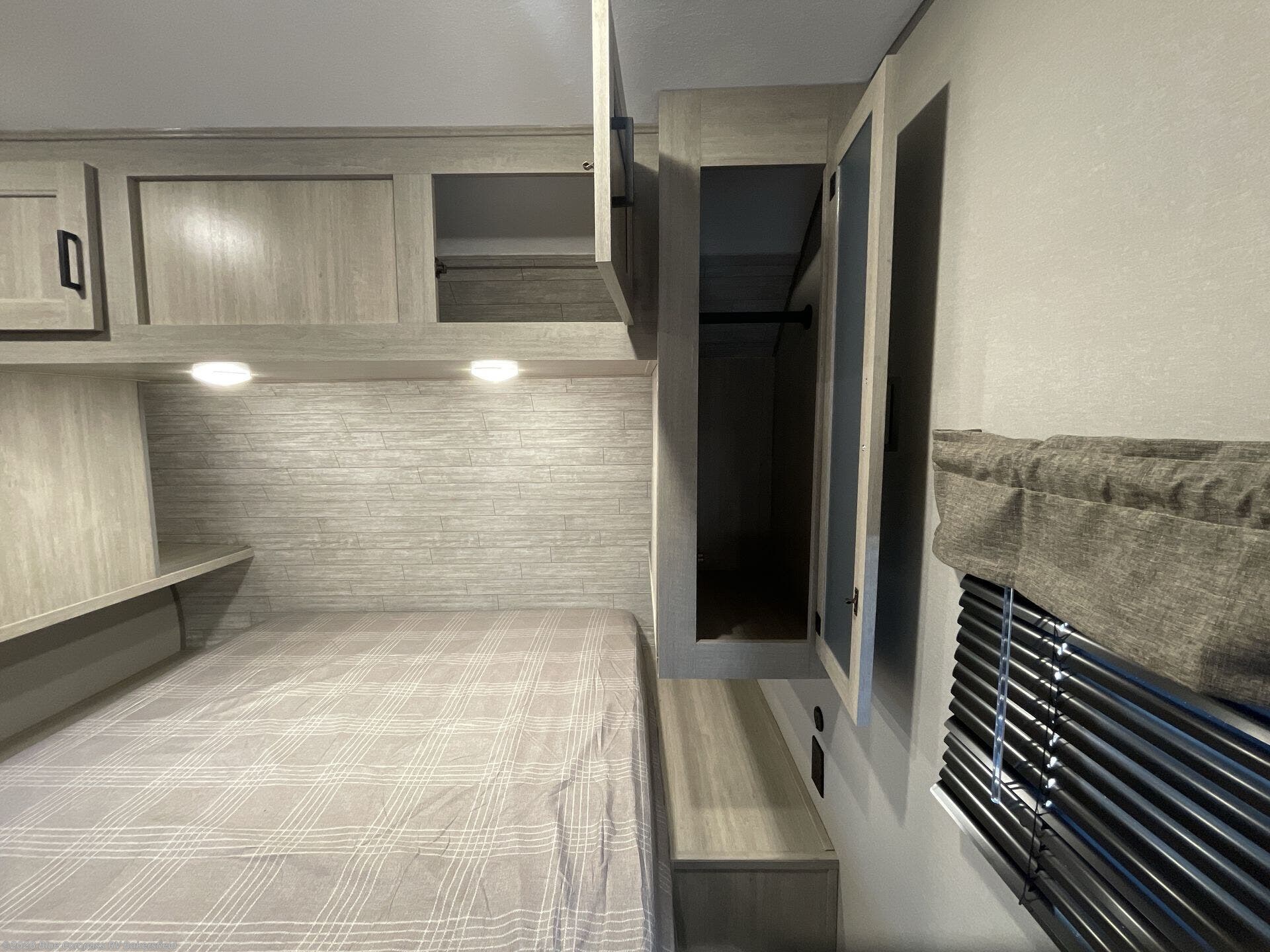 When you are ready to camp with your favorite person, this trailer offers the perfect couples trailer with space for an overnight guest on the booth dinette. You will have a front bedroom with a walk-around queen bed, dual wardrobes and overhead cabinets for your belongings. The main living and kitchen area is spacious with a slide out dinette and sofa giving you more floor space, dining and relaxing seating, and extra sleeping space for friends once the furniture is easily setup. There is a wardrobe/pantry next to the rear corner bathroom complete with a radius shower. The galley kitchen includes full amenities, plus there is an outside kitchen with a griddle and mini refrigerator. Everyone will enjoy the entertainment center when inside, and the 18' awning offers a covered outdoor living area, just grab your chairs from the pass-through compartment.