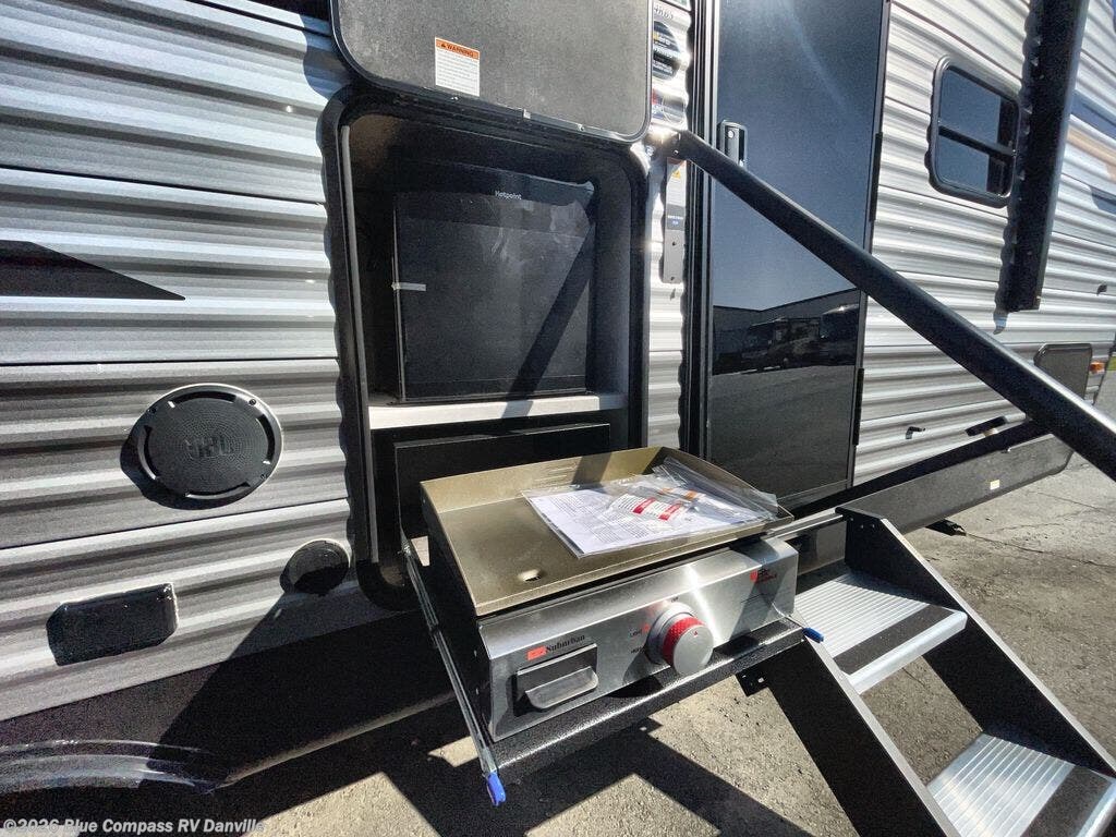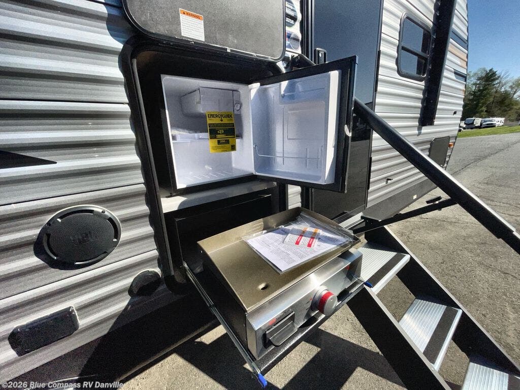 When you are ready to camp with your favorite person, this trailer offers the perfect couples trailer with space for an overnight guest on the booth dinette. You will have a front bedroom with a walk-around queen bed, dual wardrobes and overhead cabinets for your belongings. The main living and kitchen area is spacious with a slide out dinette and sofa giving you more floor space, dining and relaxing seating, and extra sleeping space for friends once the furniture is easily setup. There is a wardrobe/pantry next to the rear corner bathroom complete with a radius shower. The galley kitchen includes full amenities, plus there is an outside kitchen with a griddle and mini refrigerator. Everyone will enjoy the entertainment center when inside, and the 18' awning offers a covered outdoor living area, just grab your chairs from the pass-through compartment.
