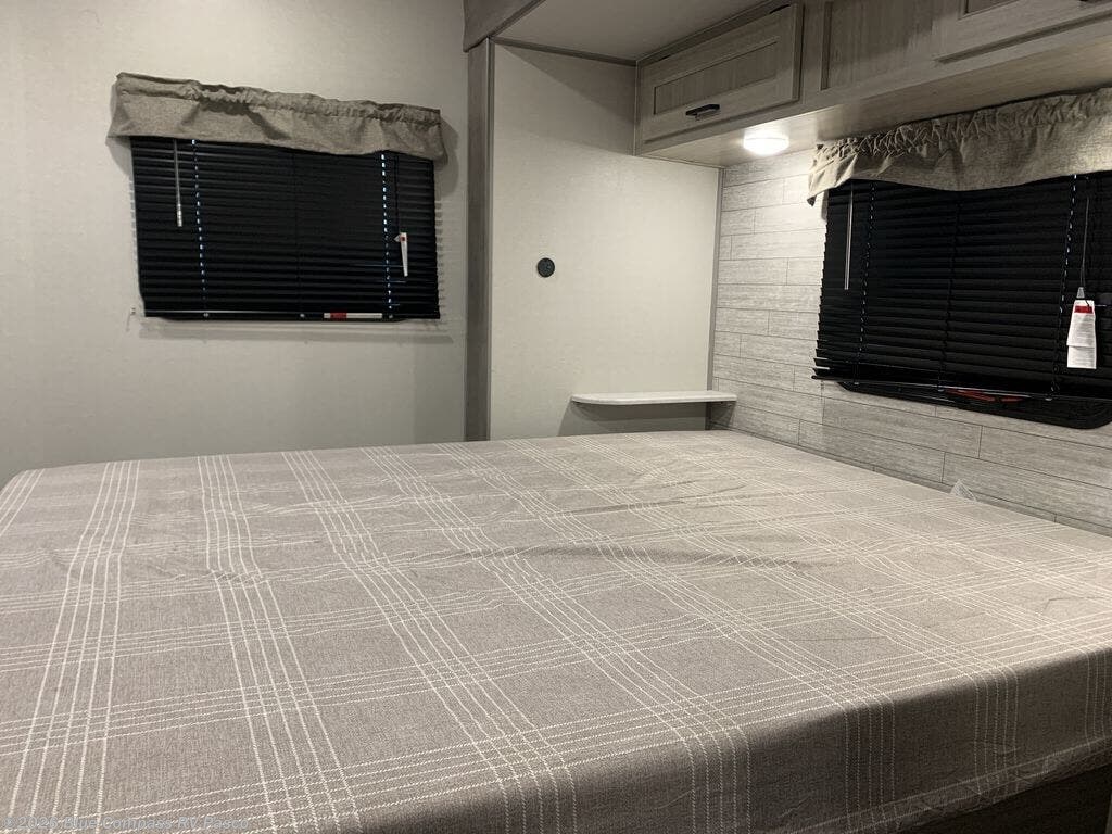 You're going to love every minute spent in this travel trailer with double slide outs and double entry doors. The front kitchen includes ample counter space to prep and cook meals, plus there are two pantries for storage space. Your crew can get comfortable on the 68" sofa or play a game at the 45" booth dinette. There is also an entertainment center with a LED TV for movie night, or you might head outdoors to relax under the 18' awning. The exterior camper kitchen here includes a griddle and a mini refrigerator the chef of your group is sure to love. When it's time to call it a night, head to the rear master bedroom that includes a 60" x 74" queen bed slide out, a large wardrobe, plus your own entrance into the dual entry bath!
