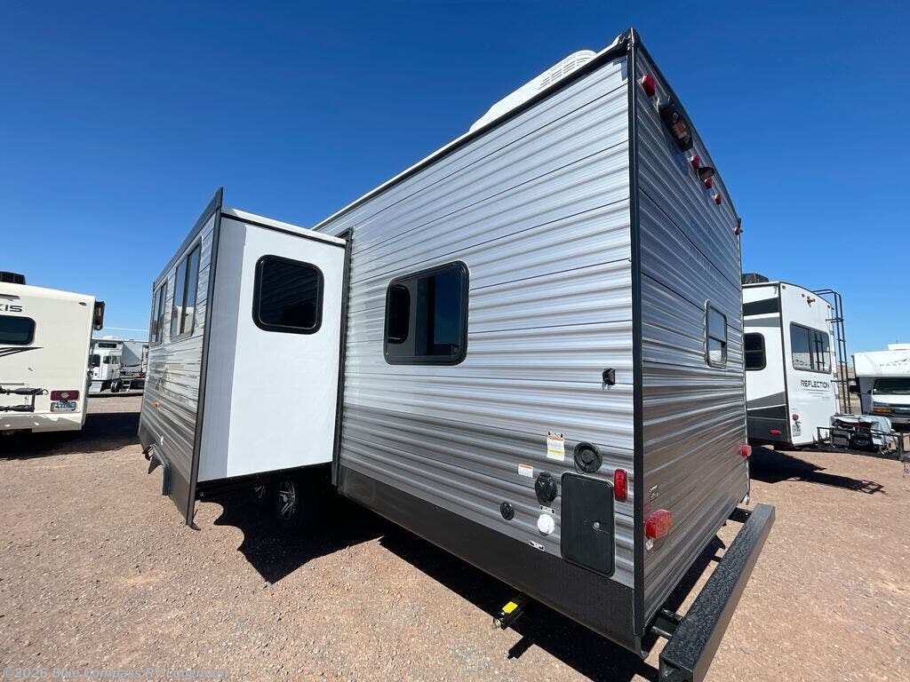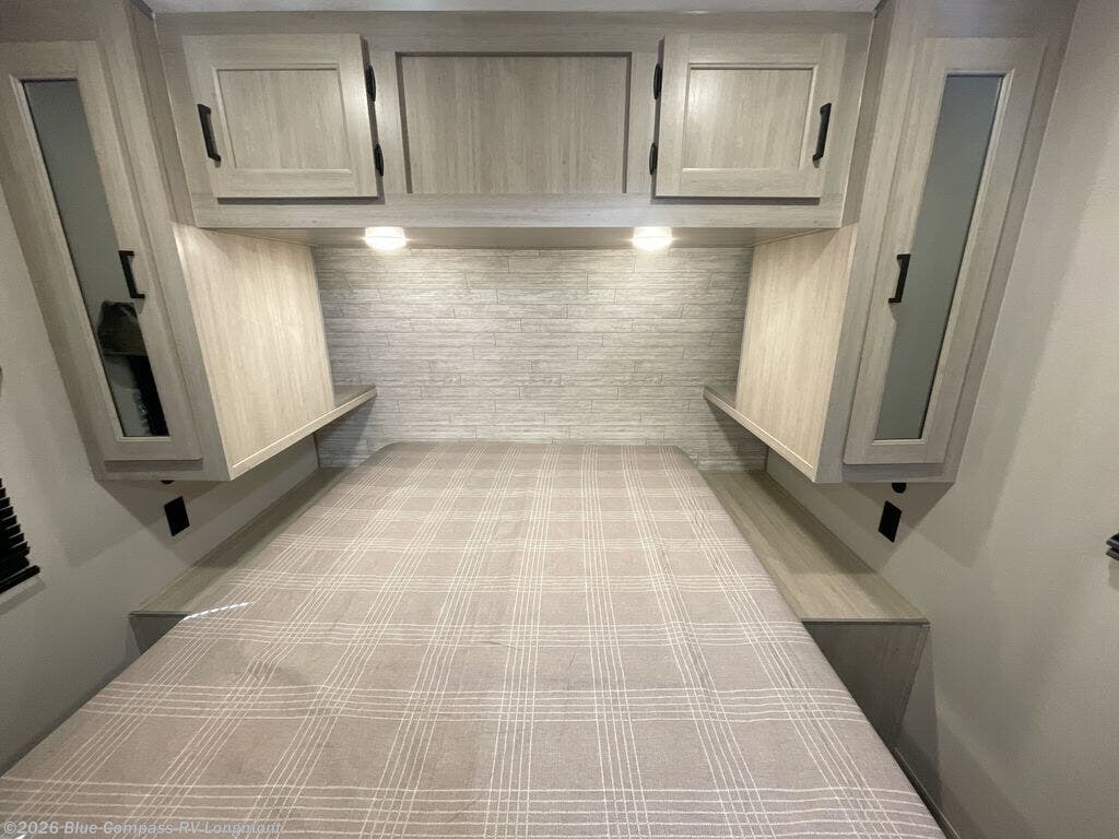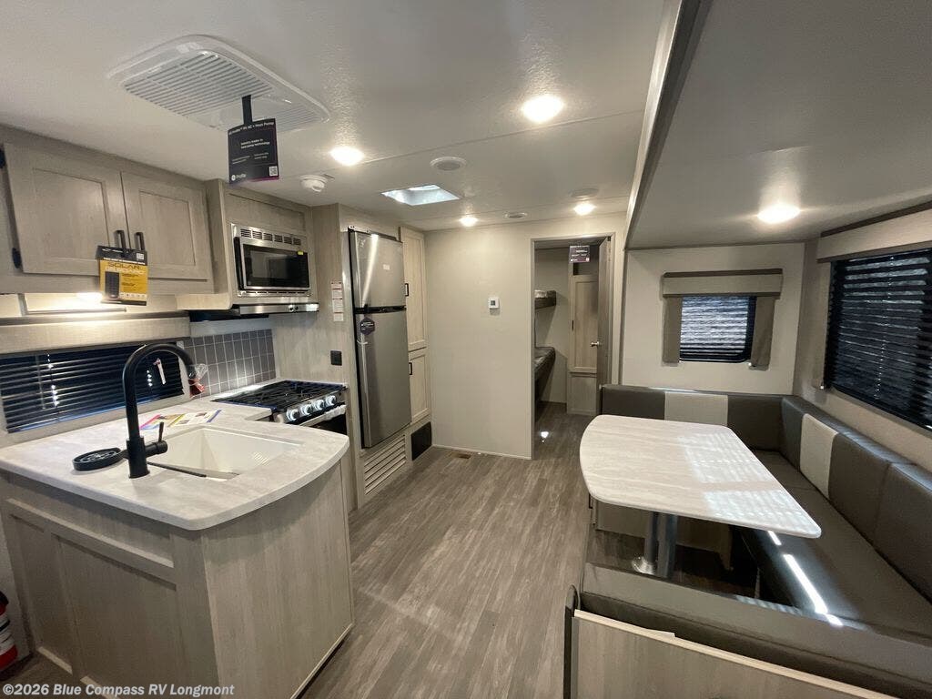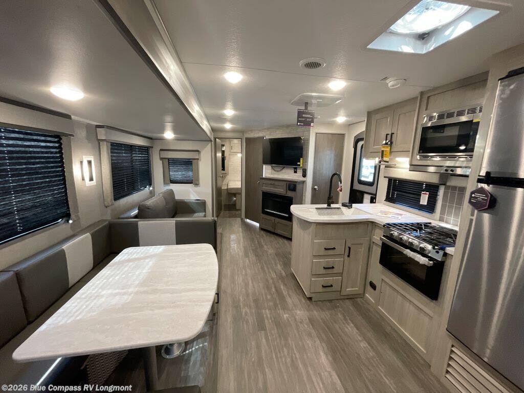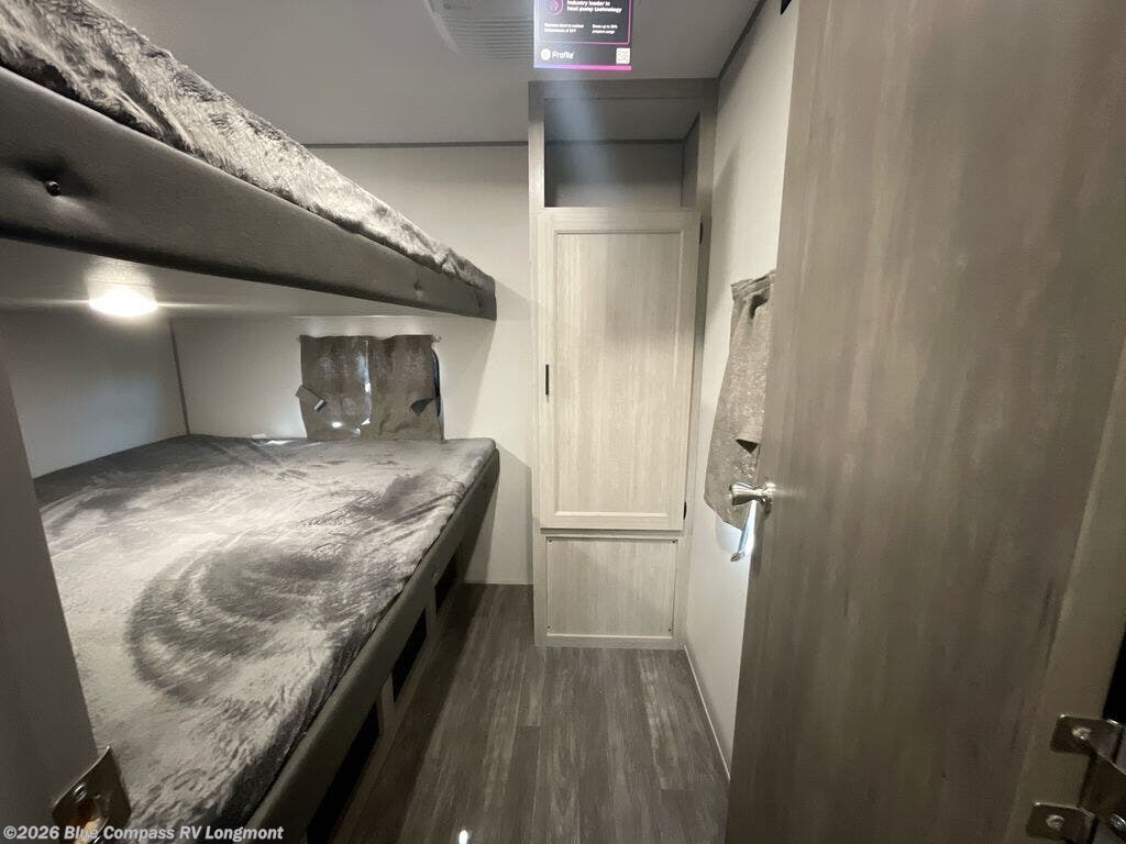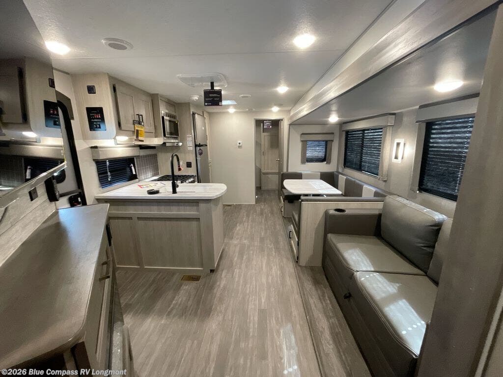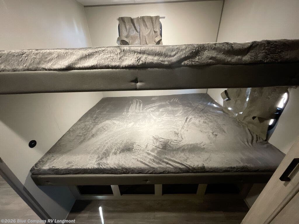 The rear private bunkhouse in this travel trailer is perfect for the kids or guests! It has a set of queen bunk beds with storage totes underneath and a linen closet. The dual entry bathroom is convenient for all to access it and has a 34" x 34" radius shower with a skylight above for natural lighting as you get ready. The chef can prepare their best meals with the three burner cooktop and everyone can enjoy them at the U-shaped dinette. The sofa is across from the entertainment center with an optional fireplace to add for extra comfort. The front private bedroom has a 60" x 74" queen bed to lay your head on at night and wardrobes on either side of it to keep your clothes out of the way and looking their best, plus an entrance into the dual entry bathroom!