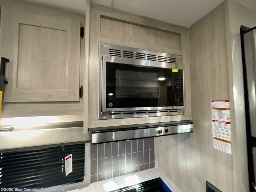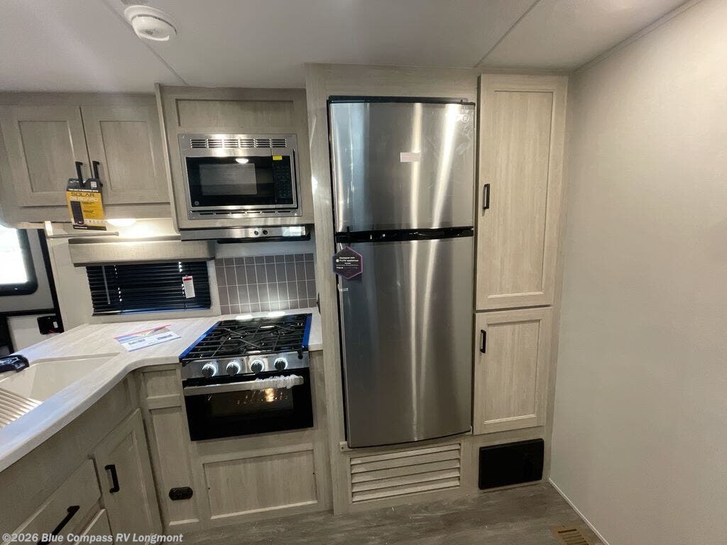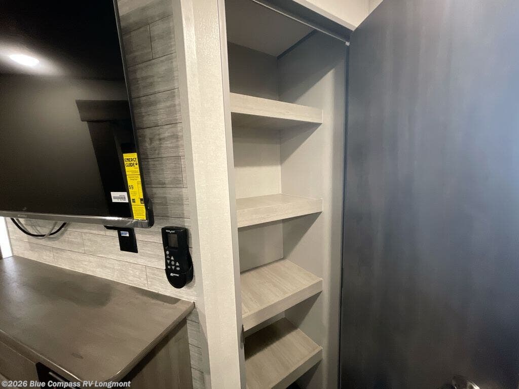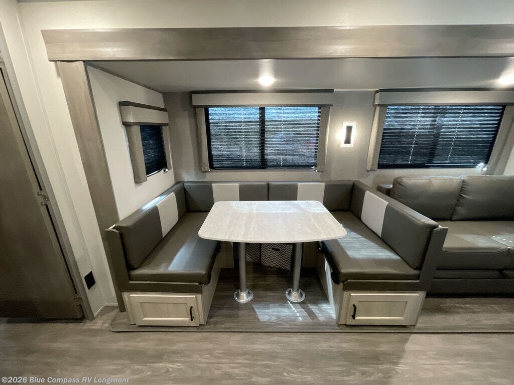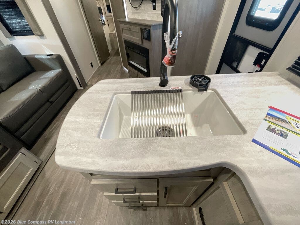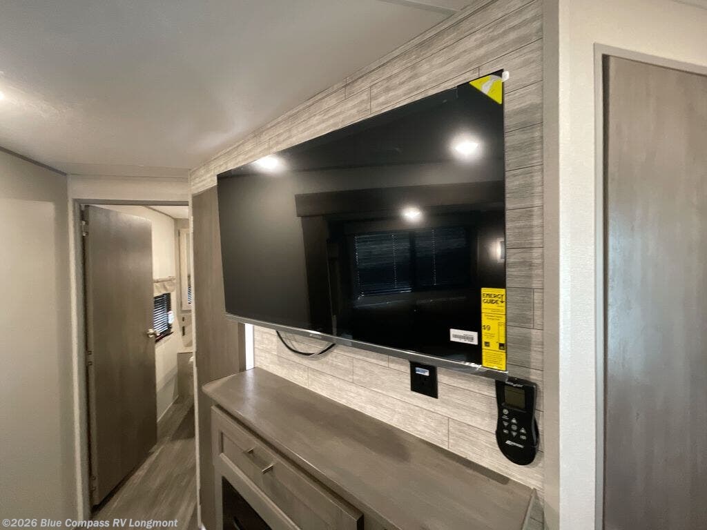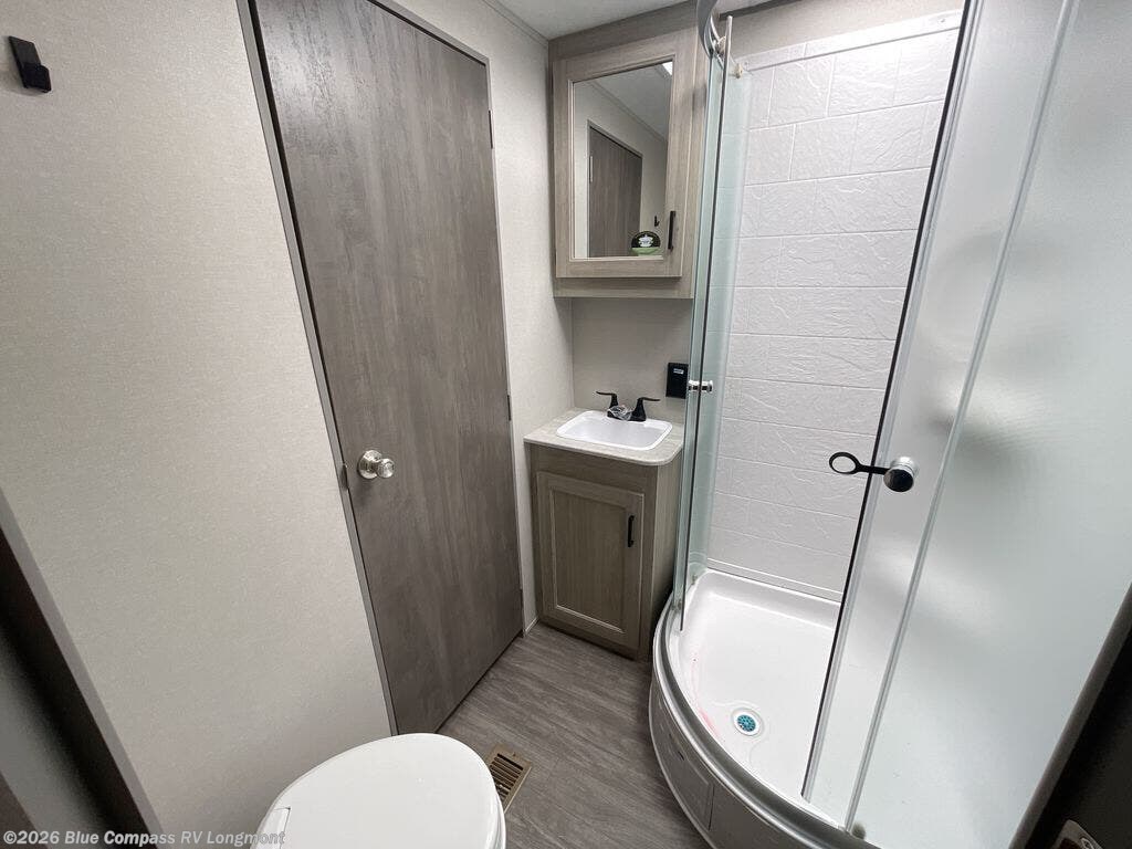 The rear private bunkhouse in this travel trailer is perfect for the kids or guests! It has a set of queen bunk beds with storage totes underneath and a linen closet. The dual entry bathroom is convenient for all to access it and has a 34" x 34" radius shower with a skylight above for natural lighting as you get ready. The chef can prepare their best meals with the three burner cooktop and everyone can enjoy them at the U-shaped dinette. The sofa is across from the entertainment center with an optional fireplace to add for extra comfort. The front private bedroom has a 60" x 74" queen bed to lay your head on at night and wardrobes on either side of it to keep your clothes out of the way and looking their best, plus an entrance into the dual entry bathroom!