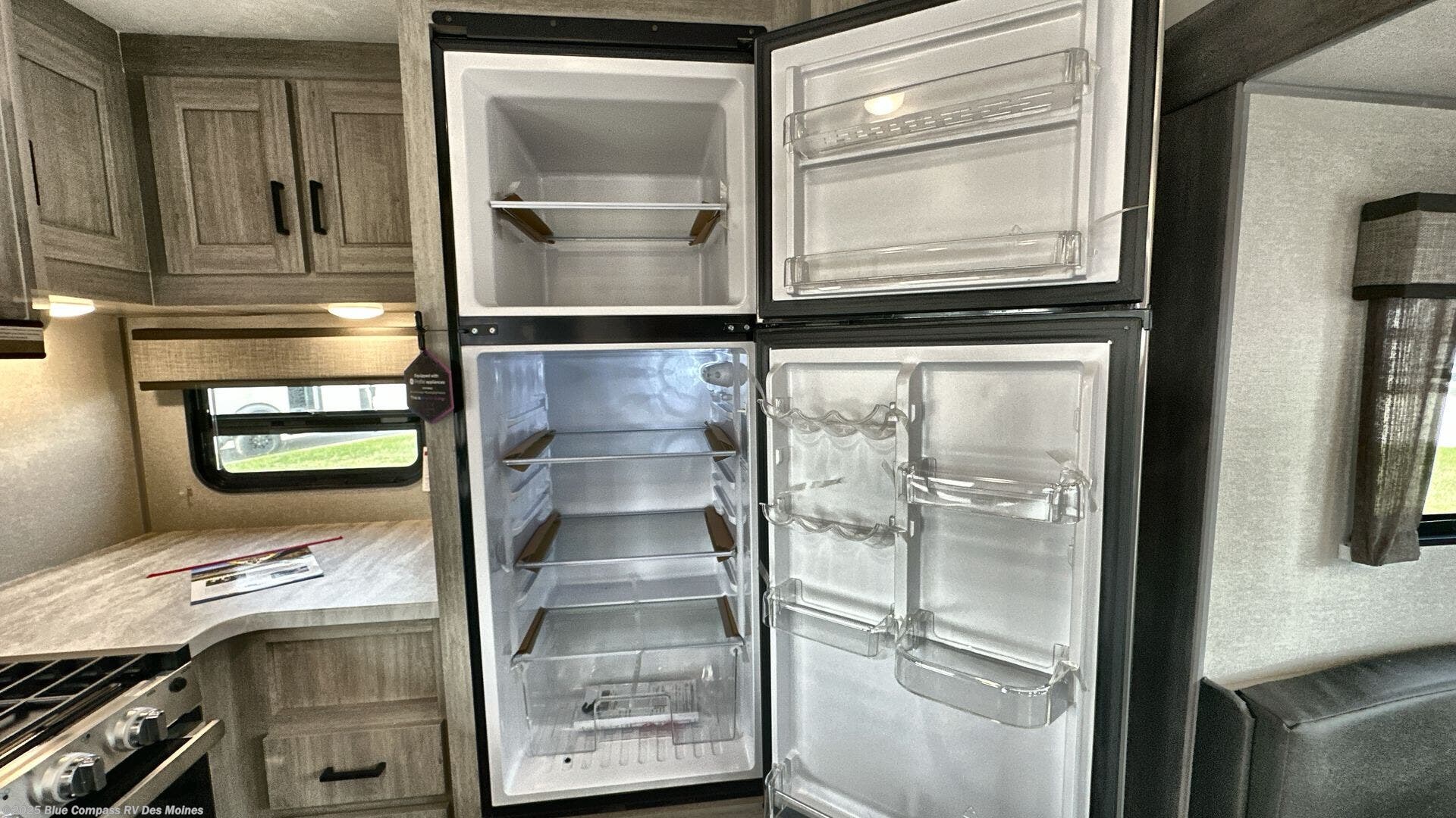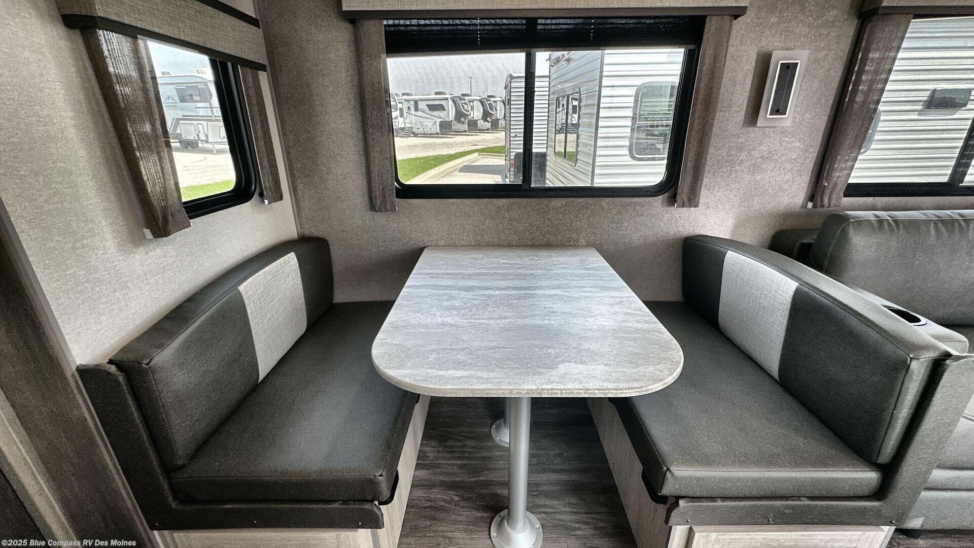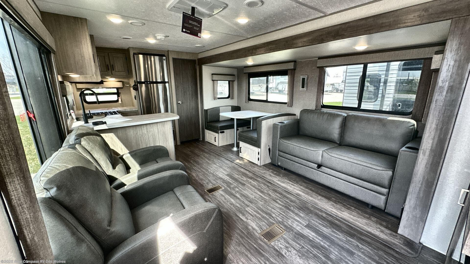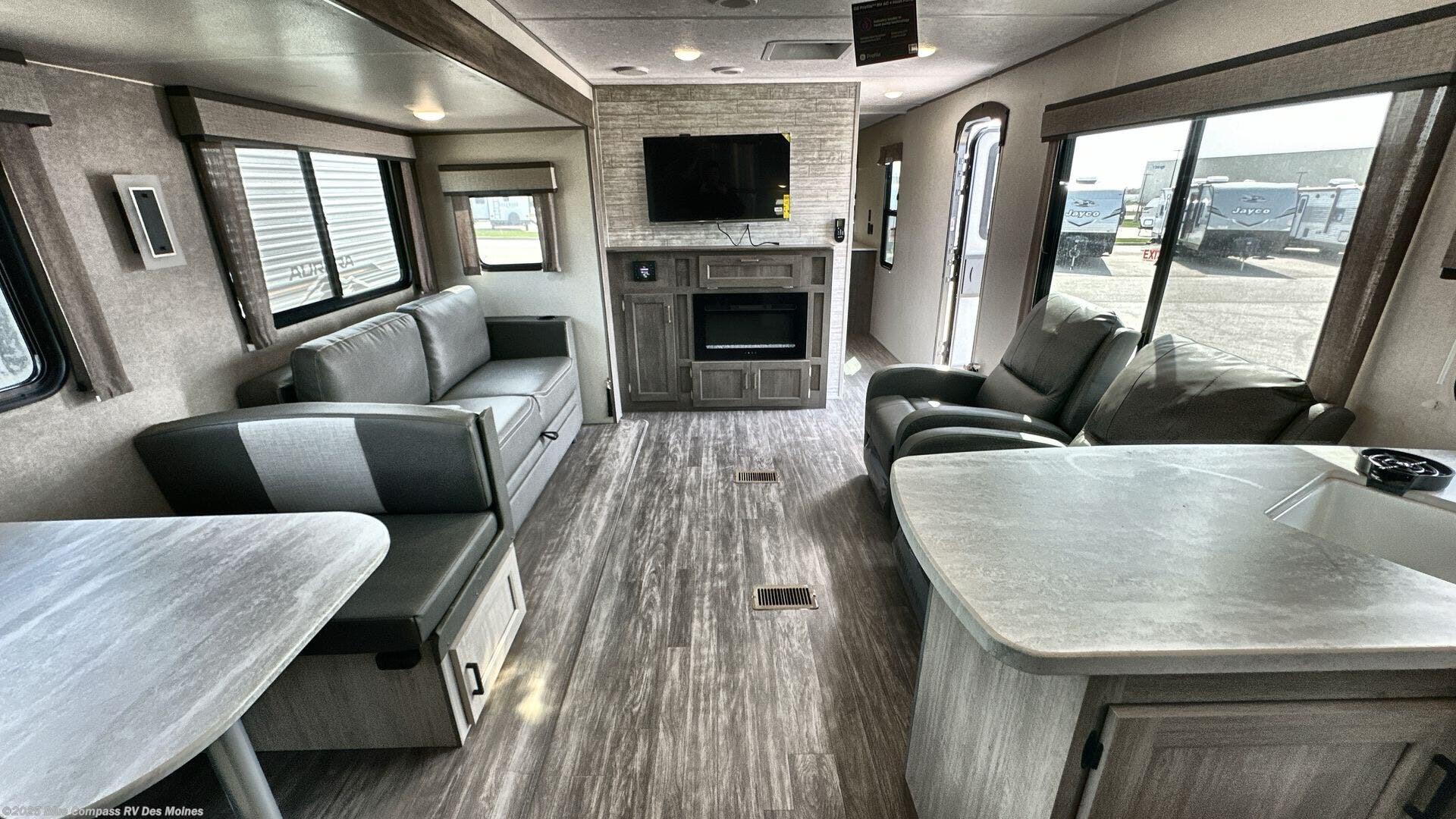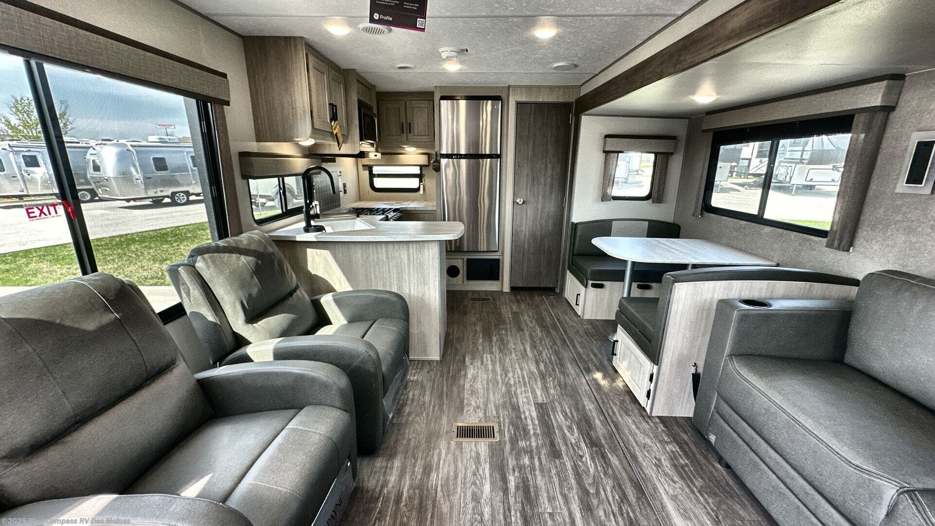 The chef will love cooking in the rear kitchen of this travel trailer! You will feel right at home in the front private bedroom with the 60" x 74" queen bed slide across from a dresser and a front closet that has an area prepped for an optional washer and dryer. There is an optional fireplace and entertainment center in the living area in by the two recliner lounge chairs and the 68" sofa next to the 45" booth dinette. Stay clean and fresh with the 36" x 30" shower pan with a skylight above for natural lighting as you get ready in the full bathroom. The 21' electric awning has multicolor lights for you to choose your favorite color as you enjoy a refreshing beverage from the mini fridge!