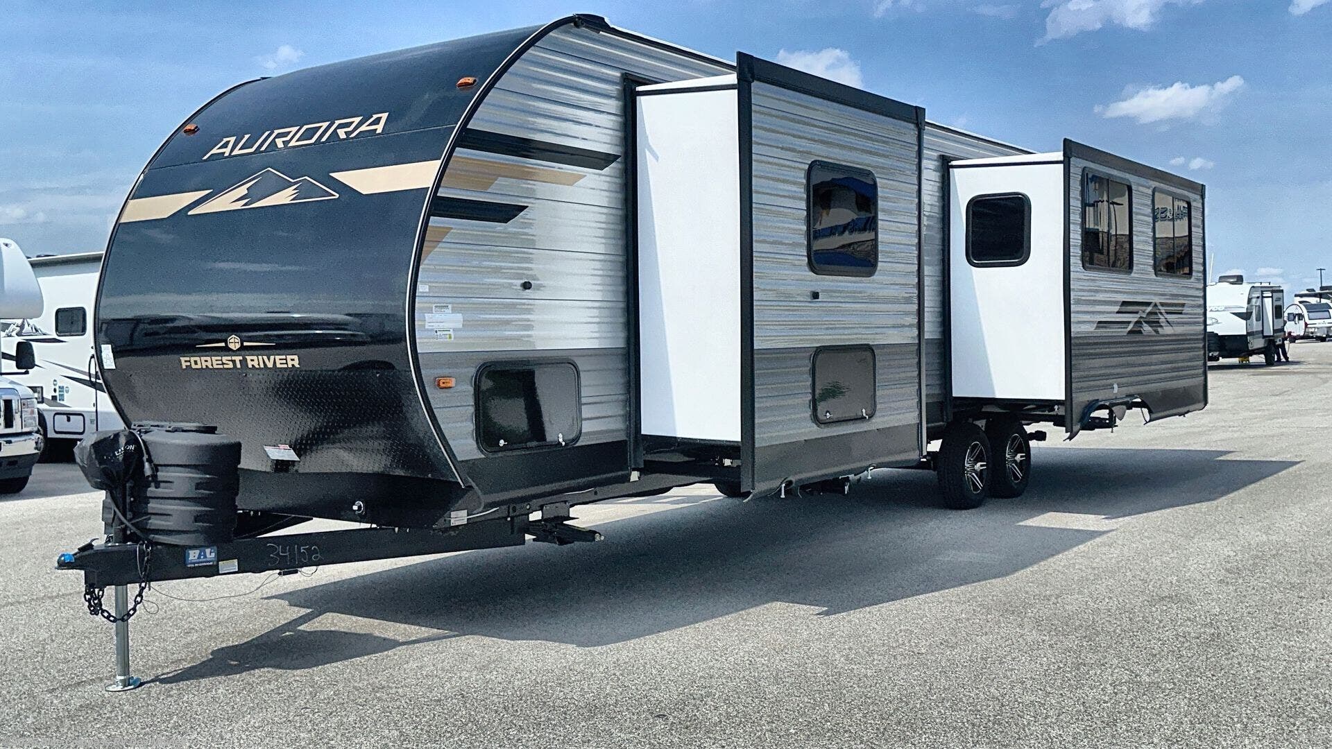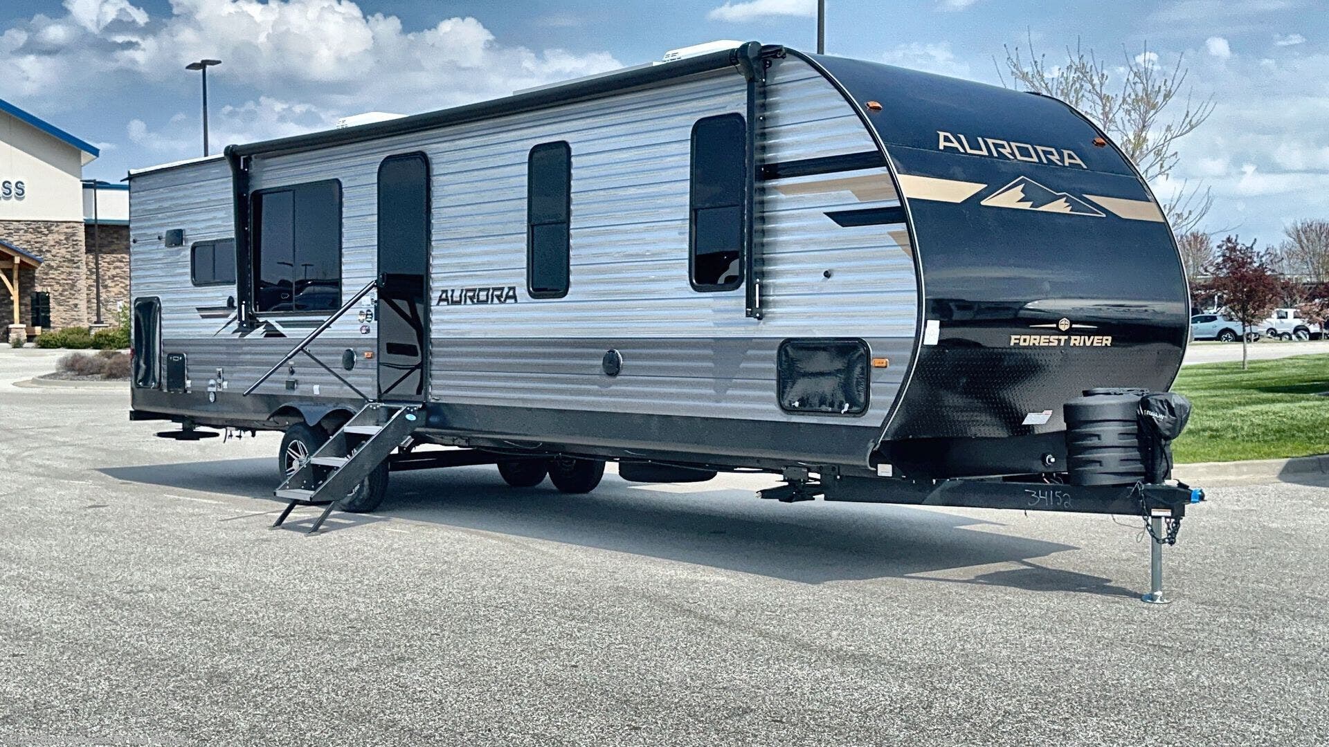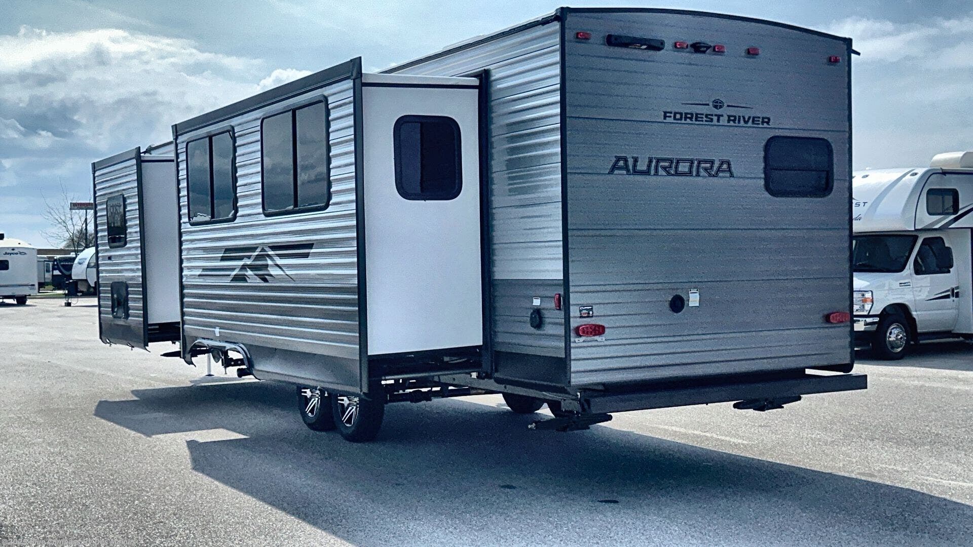 Comfortability, usability, and quality is what you will find in each one of these Forest River Aurora travel trailers, toy haulers or destination trailers! They are designed with a superior build and packed full with industry leading, functional, and distinctive standard features. SolidStep entrance steps and a Safe-T rail door assist on main entry door to help you safely enter and exit the unit. The diamond plate rock guard will protect your unit from road debris and the nitrogen filled radial tires, which keep their pressure longer, offer better fuel economy. You will also find upgraded JBL Elite exterior speakers outside, an electric awning with multicolor lights and remote, plus flush mount baggage doors for easy packing. The interiors are beautifully designed with a deep undermount farm style sink, stainless steel appliances, and linoleum flooring in the slide outs which will be easy to clean. Come find your favorite model today!