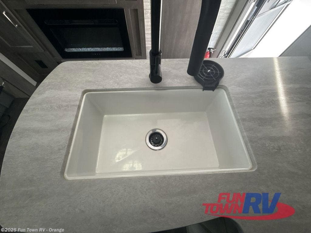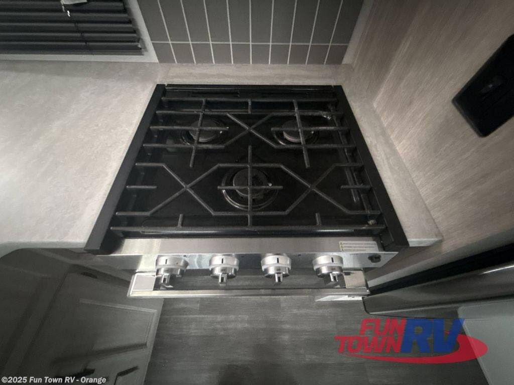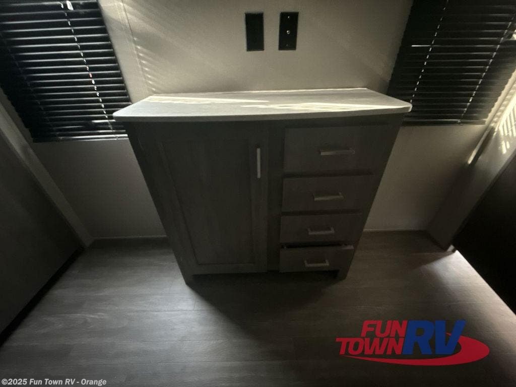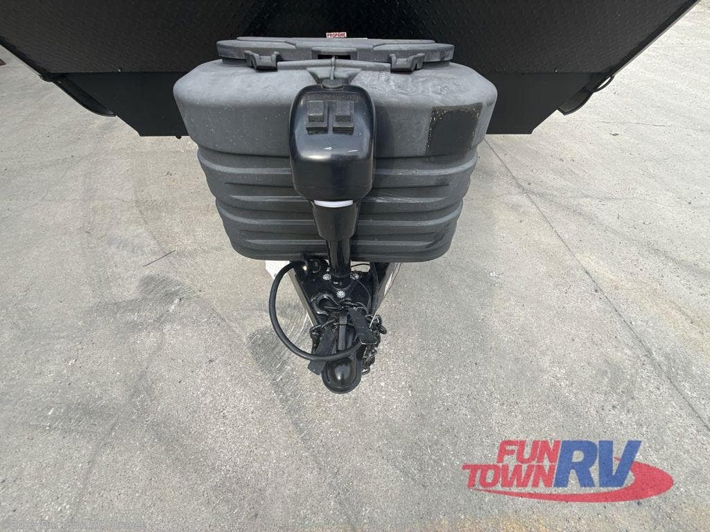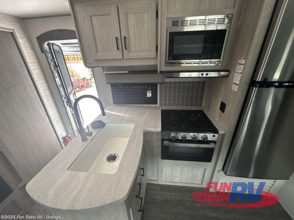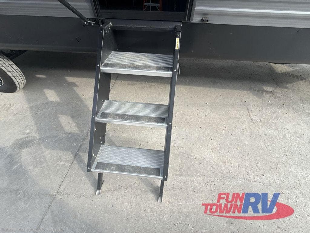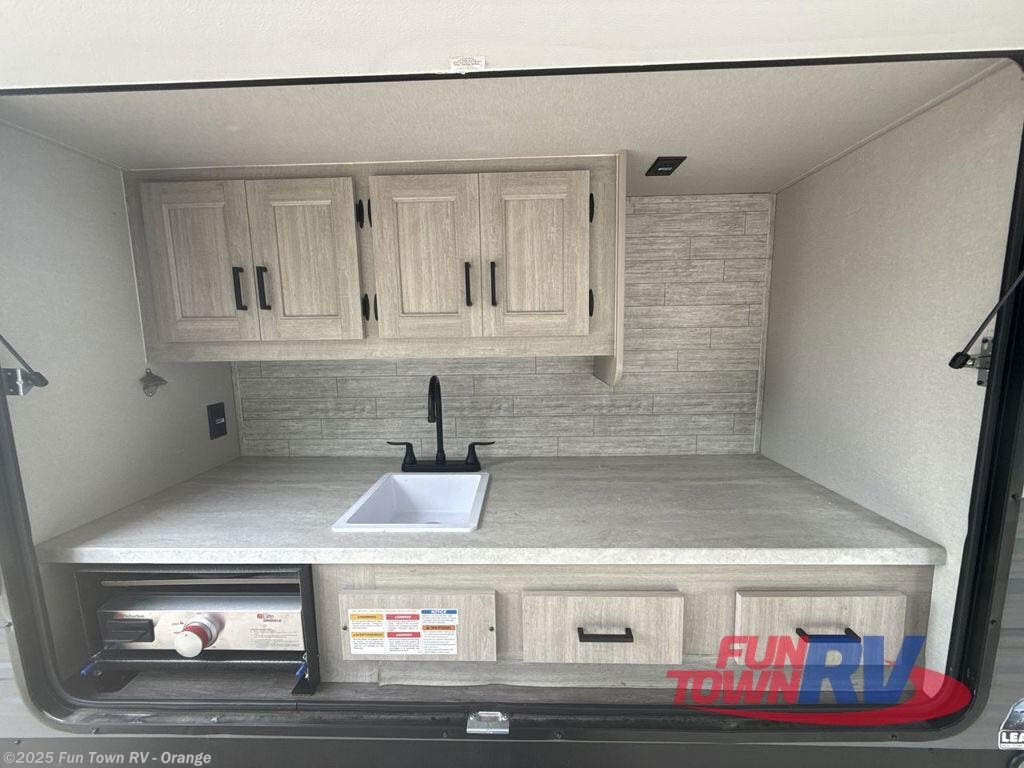 The whole gang will have a good time camping in this travel trailer! There is a place for everyone to sleep between the rear private bunkhouse with a 40" x 74" loft bed and a flip up bunk bed above a jackknife sofa, and the front private bedroom has a 60" x 74" queen bed slide, plus the booth dinette and 60" sofa in the main living area can provide extra sleeping spaces. You could even choose to switch out the bunk and sofa for an optional queen bed instead. The bedroom also has a dresser and a front closet that is big enough for your clothes and an area with washer and dryer prep. The chef can choose to either cook indoors with the three burner cooktop or breathe in some fresh air while cooking at the outside camp kitchen with a refrigerator, a sink, overhead cabinets, and a grill with drawers next to it for your cooking utensils!