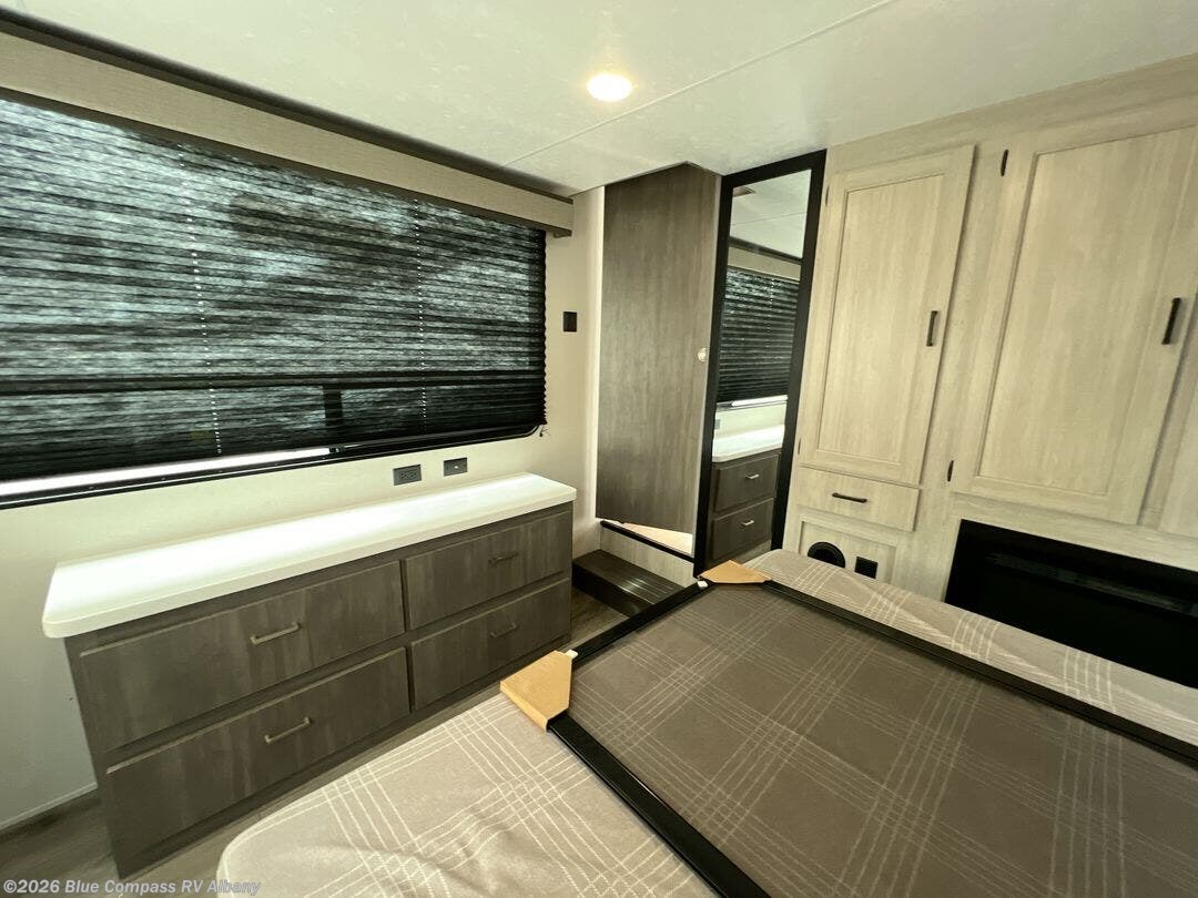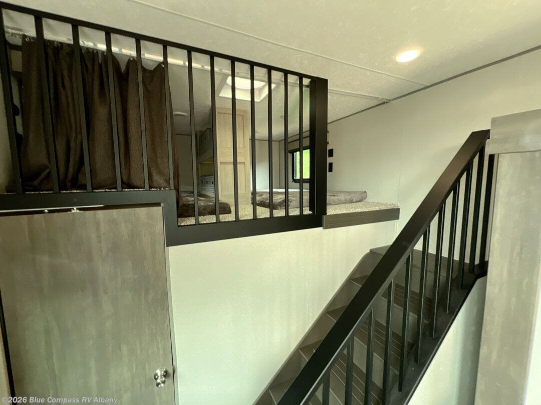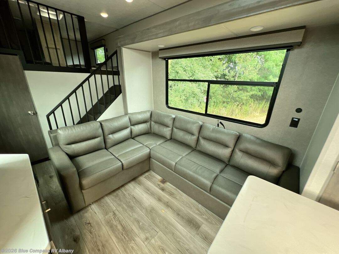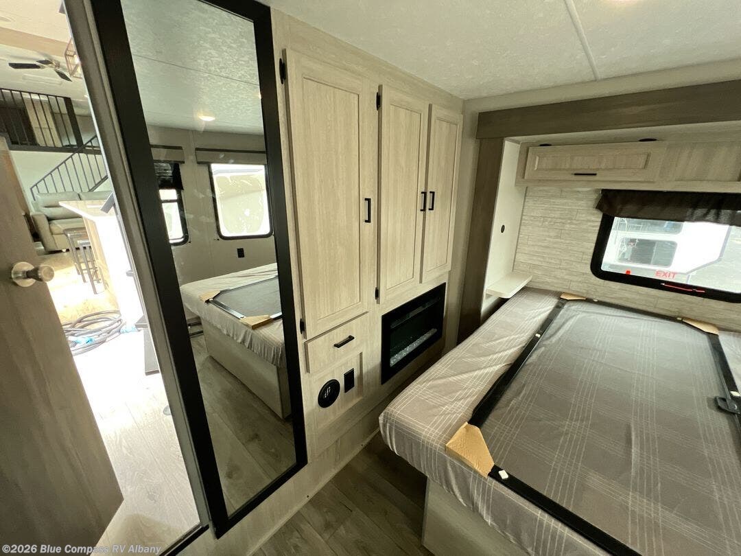 You won't believe the amount of comfort found throughout this destination trailer! The front private bedroom will provide you with your own space each night, and here you'll enjoy the RV queen bed slide out, wardrobe closets and a dresser, plus a bedroom fireplace for more comfort. The main living area is made spacious thanks to the large slide out, and the kitchen island with five bar stools will be the perfect place to dine together each day. There is also a hide-a-bed sectional sofa everyone is sure to enjoy relaxing on, and the power lift TV means you can make it a movie night! A spacious full rear bath includes a 48" x 30" shower with a seat and glass shower door and plenty of storage space to keep clean towels and bath necessities stocked. The feature you will really love on this trailer has to be the double loft areas, complete with five bunk mats in total and storage space for your guests' things; how convenient!