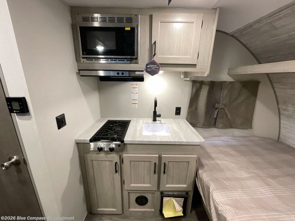 This lightweight travel trailer includes everything you need for comfortable camping trips at the lake. You can make your meals on the two burner cooktop or in the stainless steel microwave, and a 3.3 cu. ft. 12V refrigerator will keep leftovers fresh. A front queen bed provides a great night's rest, and there are 29" x 70" bunk beds for your guests or little ones. And a private bath with a 24" x 32" shower and toilet will let you easily freshen up without having to use the camp's facilities!