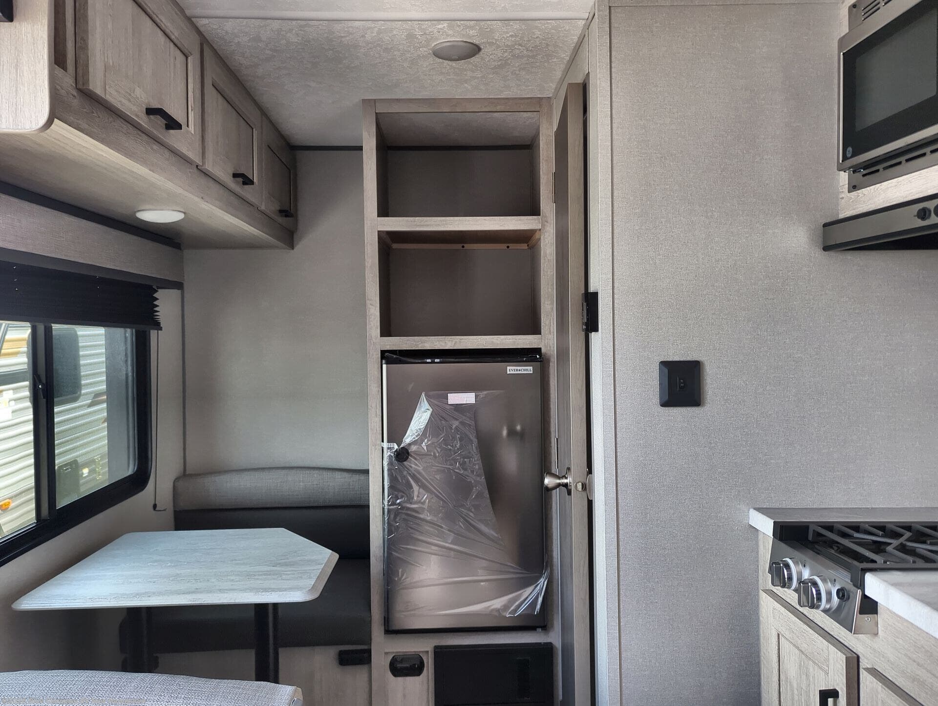 This lightweight travel trailer includes everything you need for comfortable camping trips at the lake. You can make your meals on the two burner cooktop or in the stainless steel microwave, and a 3.3 cu. ft. 12V refrigerator will keep leftovers fresh. A front queen bed provides a great night's rest, and there is a 29" booth dinette that will double as both dining and additional sleeping space. And a private bath with a 24" x 32" shower and toilet will let you easily freshen up without having to use the camp's facilities!