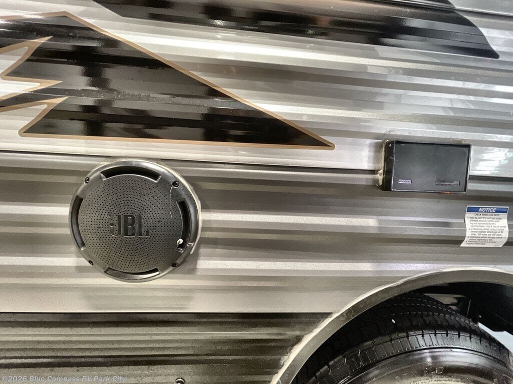 Comfortability, usability, and quality is what you will find in each one of these Forest River Aurora Light travel trailers! They are designed with a superior build and packed full with industry leading, functional, and distinctive standard features. SolidStep entrance steps and a Safe-T rail door assist on main entry door to help you safely enter and exit the unit. The diamond plate rock guard will protect your unit from road debris and the nitrogen filled radial tires, which keep their pressure longer, offer better fuel economy. You will also find upgraded JBL Elite exterior speaker outside, an electric awning with multicolor lights and remote, plus flush mount baggage doors for easy packing. The interiors are beautifully designed with matte black kitchen and bath faucets, black nightshades in the living room, and GE kitchen appliances!