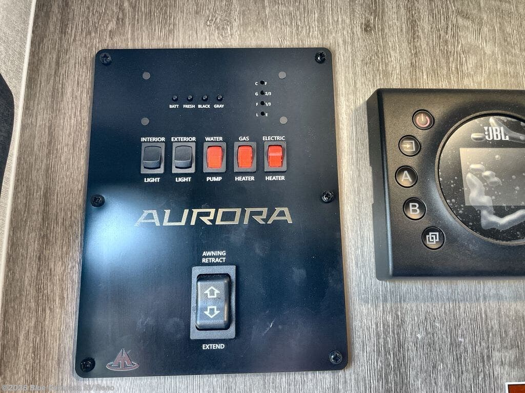 Comfortability, usability, and quality is what you will find in each one of these Forest River Aurora Light travel trailers! They are designed with a superior build and packed full with industry leading, functional, and distinctive standard features. SolidStep entrance steps and a Safe-T rail door assist on main entry door to help you safely enter and exit the unit. The diamond plate rock guard will protect your unit from road debris and the nitrogen filled radial tires, which keep their pressure longer, offer better fuel economy. You will also find upgraded JBL Elite exterior speaker outside, an electric awning with multicolor lights and remote, plus flush mount baggage doors for easy packing. The interiors are beautifully designed with matte black kitchen and bath faucets, black nightshades in the living room, and GE kitchen appliances!