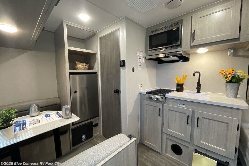 This lightweight travel trailer includes everything you need for comfortable camping trips at the lake. You can make your meals on the two burner cooktop or in the stainless steel microwave, and a 3.3 cu. ft. 12V refrigerator will keep leftovers fresh. A front queen bed provides a great night's rest, and there is a 29" booth dinette that will double as both dining and additional sleeping space. And a private bath with a 24" x 32" shower and toilet will let you easily freshen up without having to use the camp's facilities!