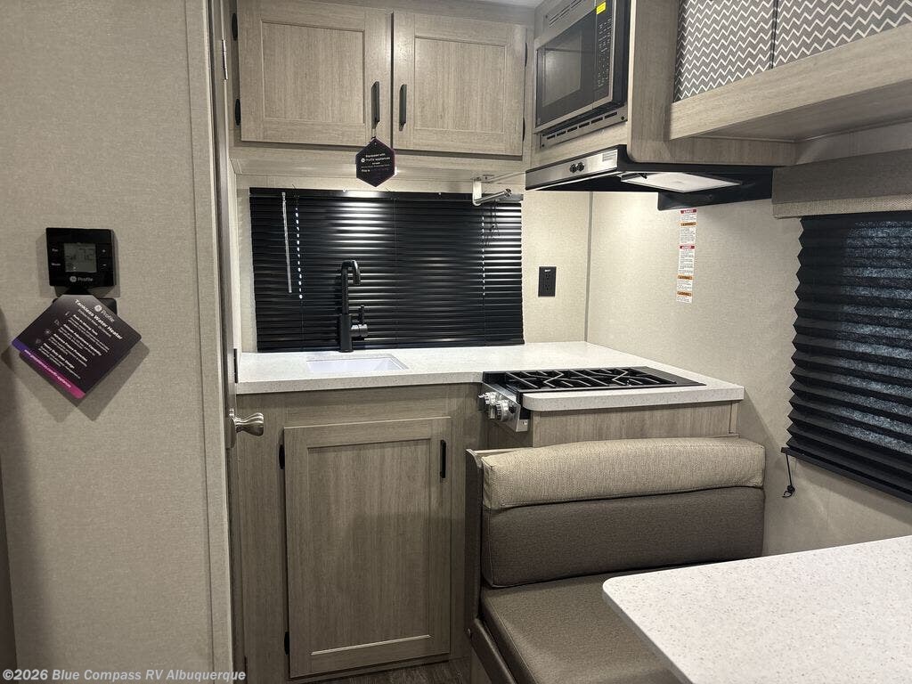 This lightweight travel trailer includes everything you need for comfortable camping trips at the lake. A front queen bed provides a great night's rest, and there is a 60" jack knife sofa for an overnight guest. You'll appreciate the bedroom storage and overhead shelf, along with an overhead shelf with bins over the sofa to keep your space tidy. The rear corner kitchen includes a two burner gas range and microwave oven, and the private bath is conveniently located in the other rear corner!