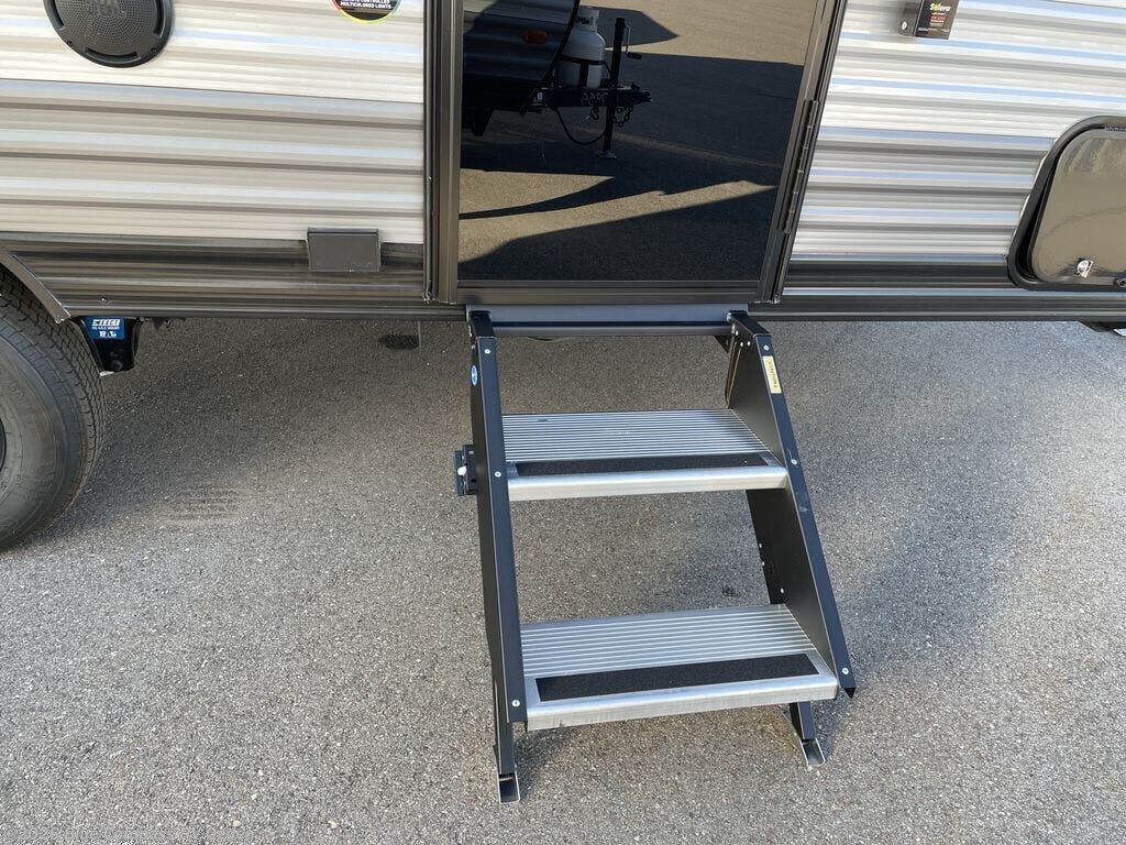 You will enjoy every adventure in this travel trailer for two to four! You will have a queen bed up front to sleep on each night, and the rear U-shaped dinette can easily be folded down to create additional sleeping for one or two more depending on size. Use the two burner cooktop and microwave oven to create meals inside. A centrally located bathroom is easily accessible from the entry and features a 36" x 30" shower, toilet, and mirror plus storage shelf. You also have an 11' electric awning on the outside with multi-colored lights with remote to select from depending on your mood, and exterior storage in front for all of your camp chairs and outdoor gear, plus more!