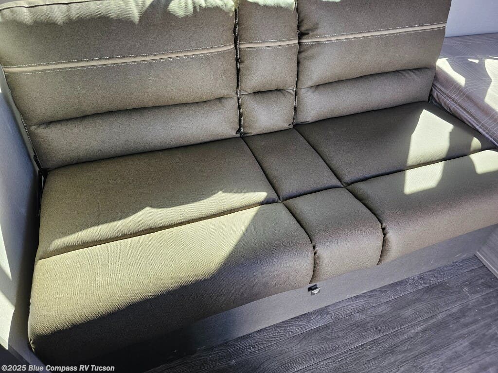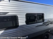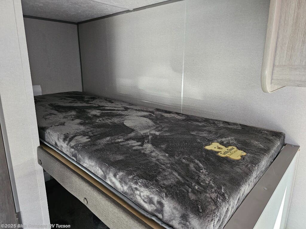 This cozy travel trailer can sleep five, so pack up and head out! You will have a queen bed up front to sleep on each night instead of an air mattress, and the little ones can take the 28" x 70" bunk beds! There is also a 60" sofa here that can sleep an additional guest and is perfect for relaxing during the day. The two burner cooktop and microwave oven means you won't have to cook over a campfire, and the private toilet and shower lets you clean up after a day outdoors. This model includes plenty of storage space, including bedroom storage, an exterior pass-through, plus additional outside storage beneath the bunks for hiking gear!