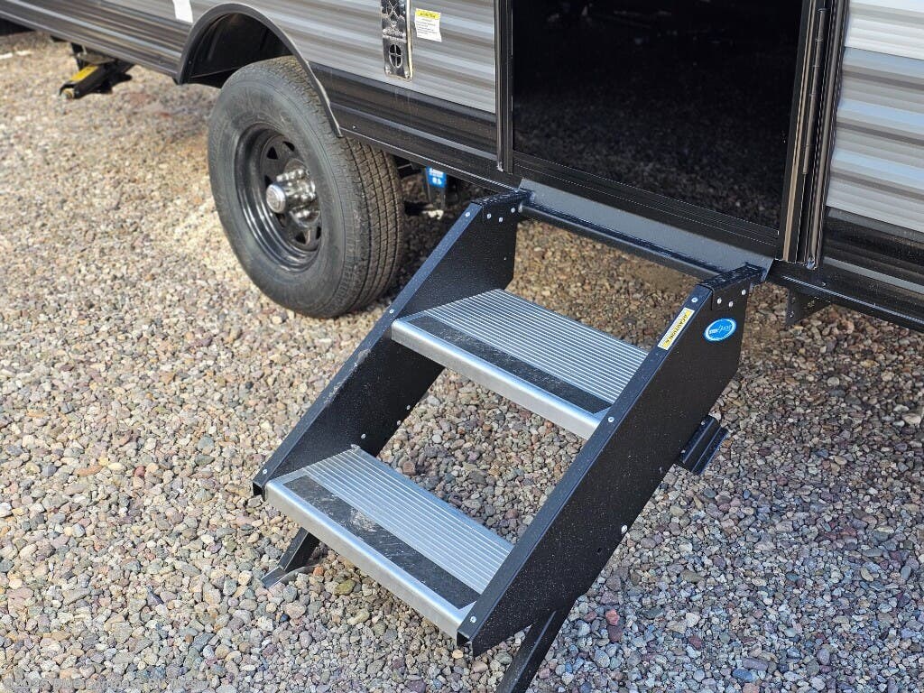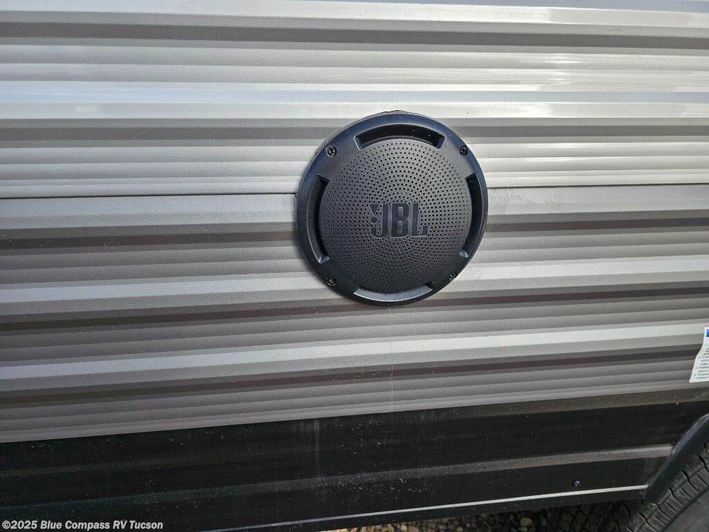Comfortability, usability, and quality is what you will find in each one of these Forest River Aurora Light travel trailers! They are designed with a superior build and packed full with industry leading, functional, and distinctive standard features. SolidStep entrance steps and a Safe-T rail door assist on main entry door to help you safely enter and exit the unit. The diamond plate rock guard will protect your unit from road debris and the nitrogen filled radial tires, which keep their pressure longer, offer better fuel economy. You will also find upgraded JBL Elite exterior speaker outside, an electric awning with multicolor lights and remote, plus flush mount baggage doors for easy packing. The interiors are beautifully designed with matte black kitchen and bath faucets, black nightshades in the living room, and GE kitchen appliances!
