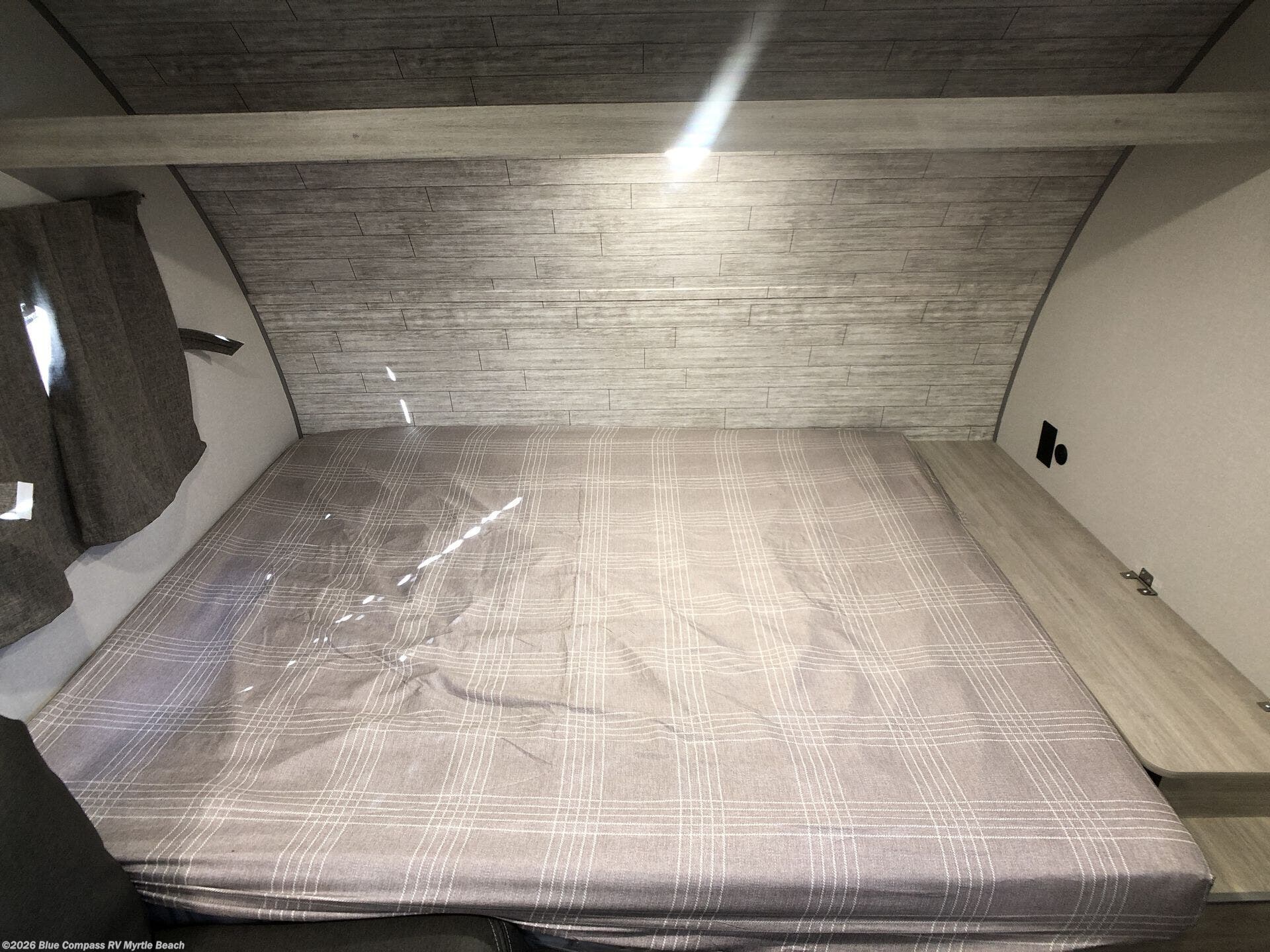 This cozy travel trailer can sleep five, so pack up and head out! You will have a queen bed up front to sleep on each night instead of an air mattress, and the little ones can take the 28" x 70" bunk beds! There is also a 60" sofa here that can sleep an additional guest and is perfect for relaxing during the day. The two burner cooktop and microwave oven means you won't have to cook over a campfire, and the private toilet and shower lets you clean up after a day outdoors. This model includes plenty of storage space, including bedroom storage, an exterior pass-through, plus additional outside storage beneath the bunks for hiking gear!