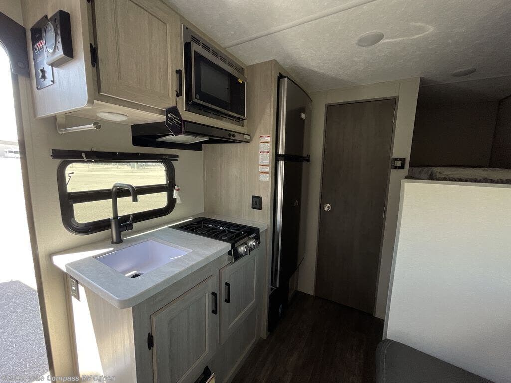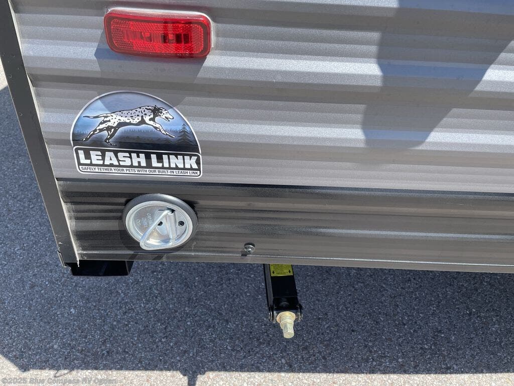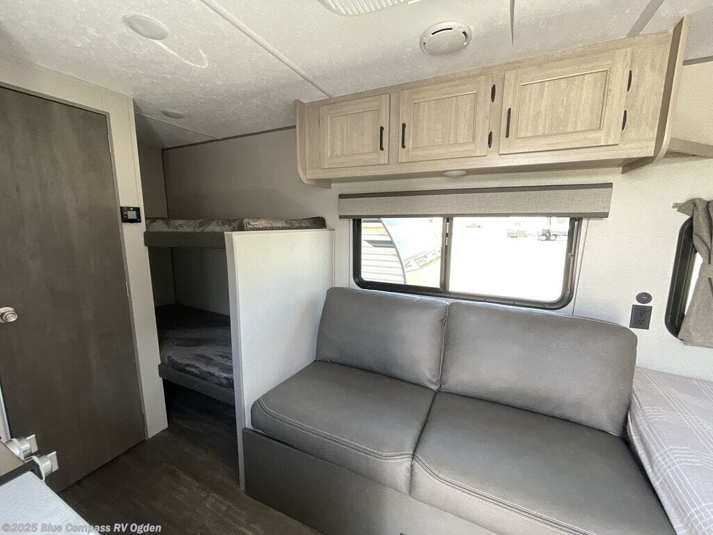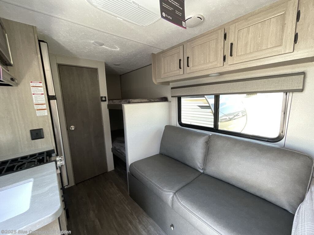 This cozy travel trailer can sleep five, so pack up and head out! You will have a queen bed up front to sleep on each night instead of an air mattress, and the little ones can take the 28" x 70" bunk beds! There is also a 60" sofa here that can sleep an additional guest and is perfect for relaxing during the day. The two burner cooktop and microwave oven means you won't have to cook over a campfire, and the private toilet and shower lets you clean up after a day outdoors. This model includes plenty of storage space, including bedroom storage, an exterior pass-through, plus additional outside storage beneath the bunks for hiking gear!