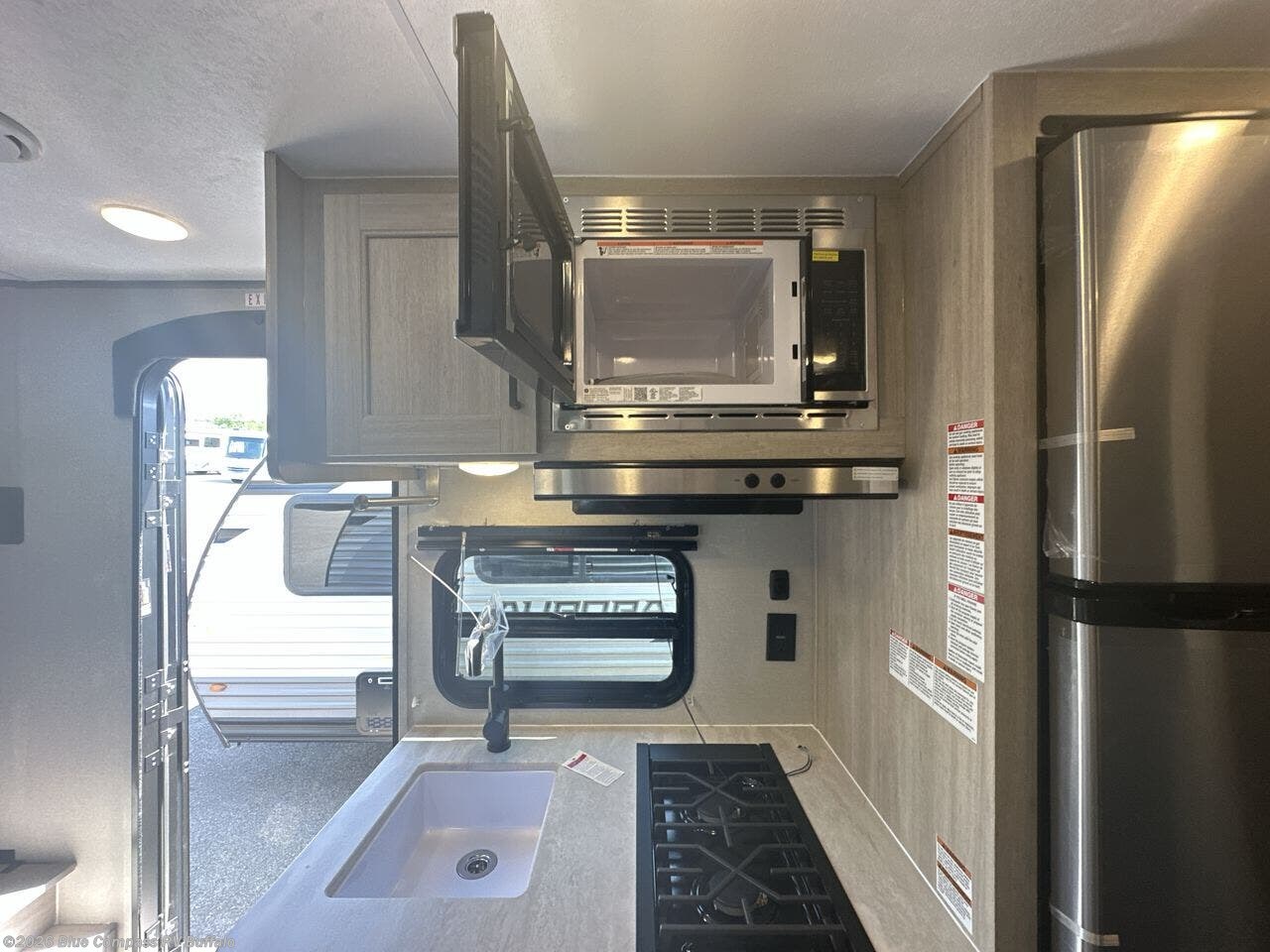Comfortability, usability, and quality is what you will find in each one of these Forest River Aurora Light travel trailers! They are designed with a superior build and packed full with industry leading, functional, and distinctive standard features. SolidStep entrance steps and a Safe-T rail door assist on main entry door to help you safely enter and exit the unit. The diamond plate rock guard will protect your unit from road debris and the nitrogen filled radial tires, which keep their pressure longer, offer better fuel economy. You will also find upgraded JBL Elite exterior speaker outside, an electric awning with multicolor lights and remote, plus flush mount baggage doors for easy packing. The interiors are beautifully designed with matte black kitchen and bath faucets, black nightshades in the living room, and GE kitchen appliances!