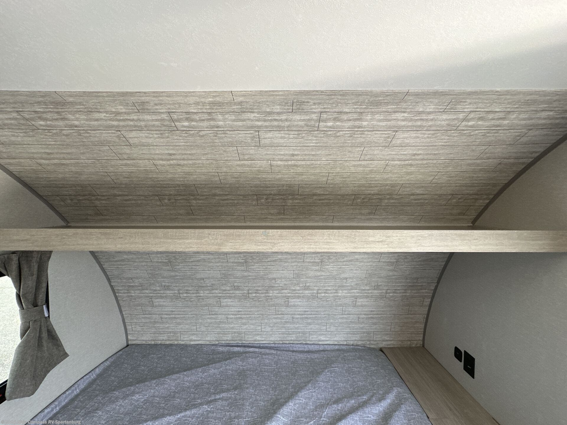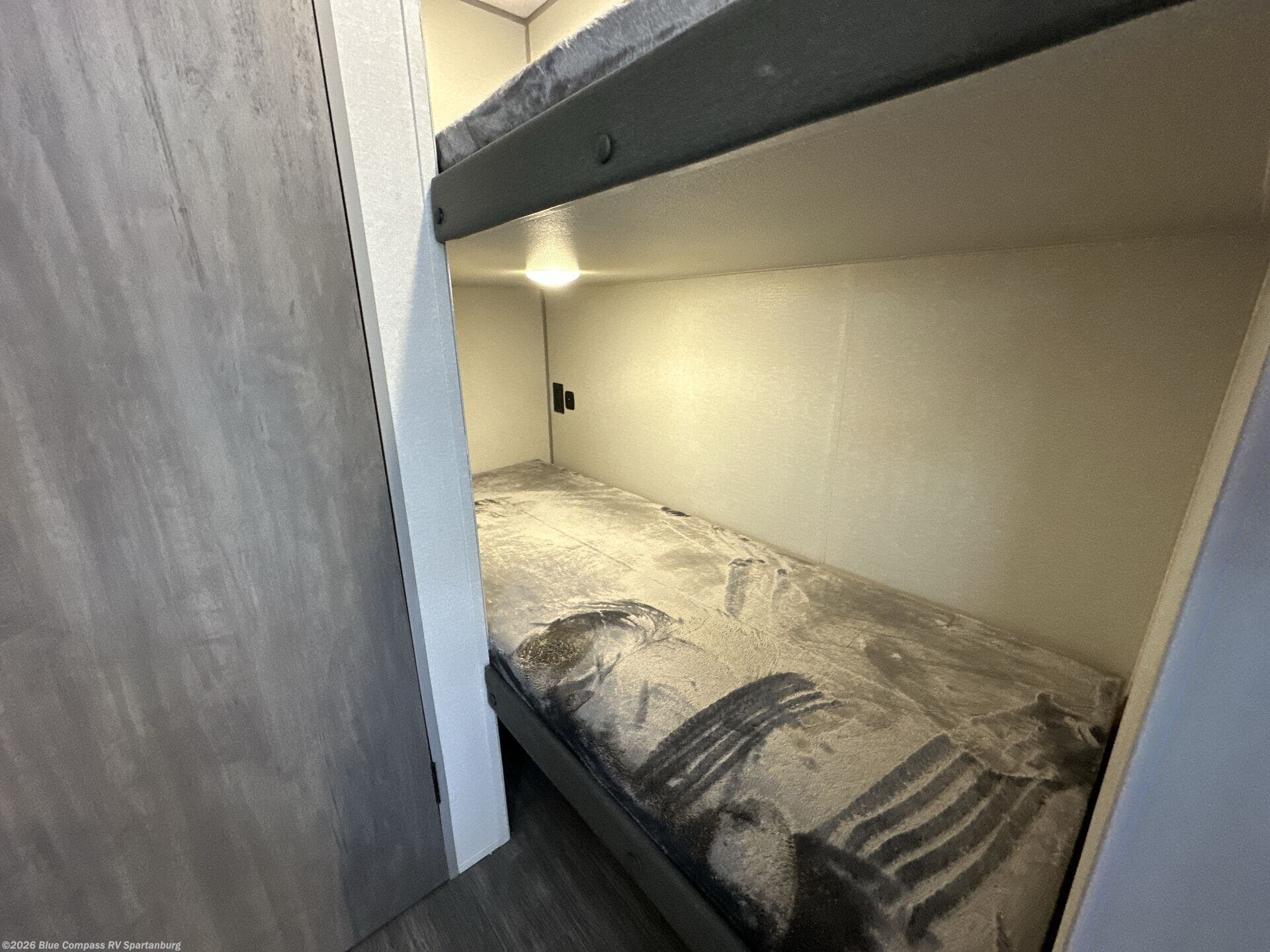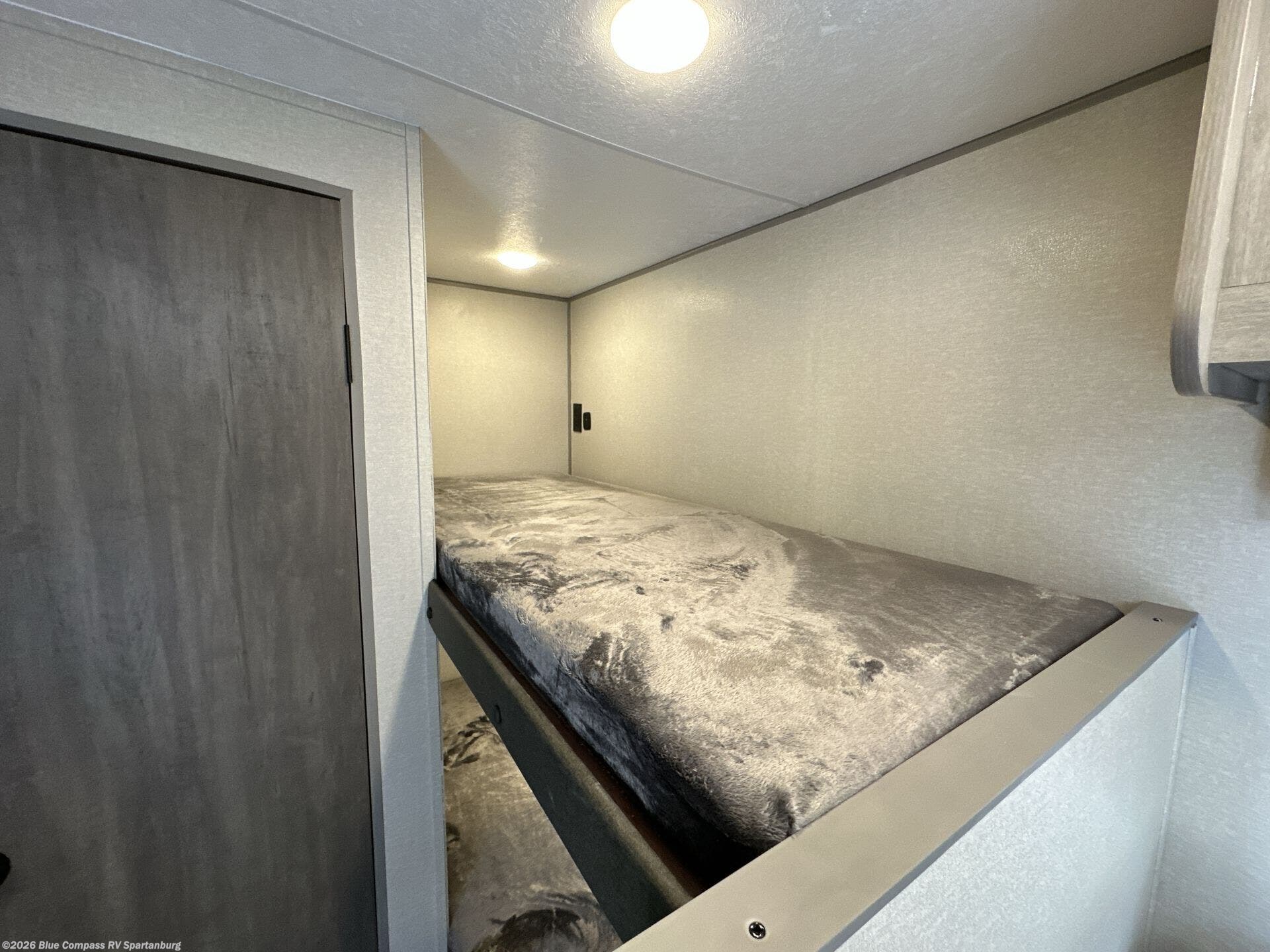 This cozy travel trailer can sleep five, so pack up and head out! You will have a queen bed up front to sleep on each night instead of an air mattress, and the little ones can take the 28" x 70" bunk beds! There is also a 60" sofa here that can sleep an additional guest and is perfect for relaxing during the day. The two burner cooktop and microwave oven means you won't have to cook over a campfire, and the private toilet and shower lets you clean up after a day outdoors. This model includes plenty of storage space, including bedroom storage, an exterior pass-through, plus additional outside storage beneath the bunks for hiking gear!