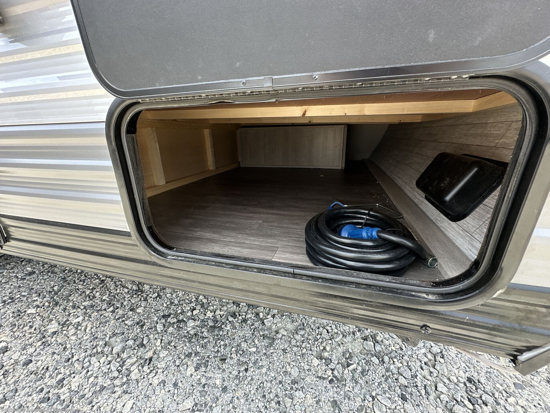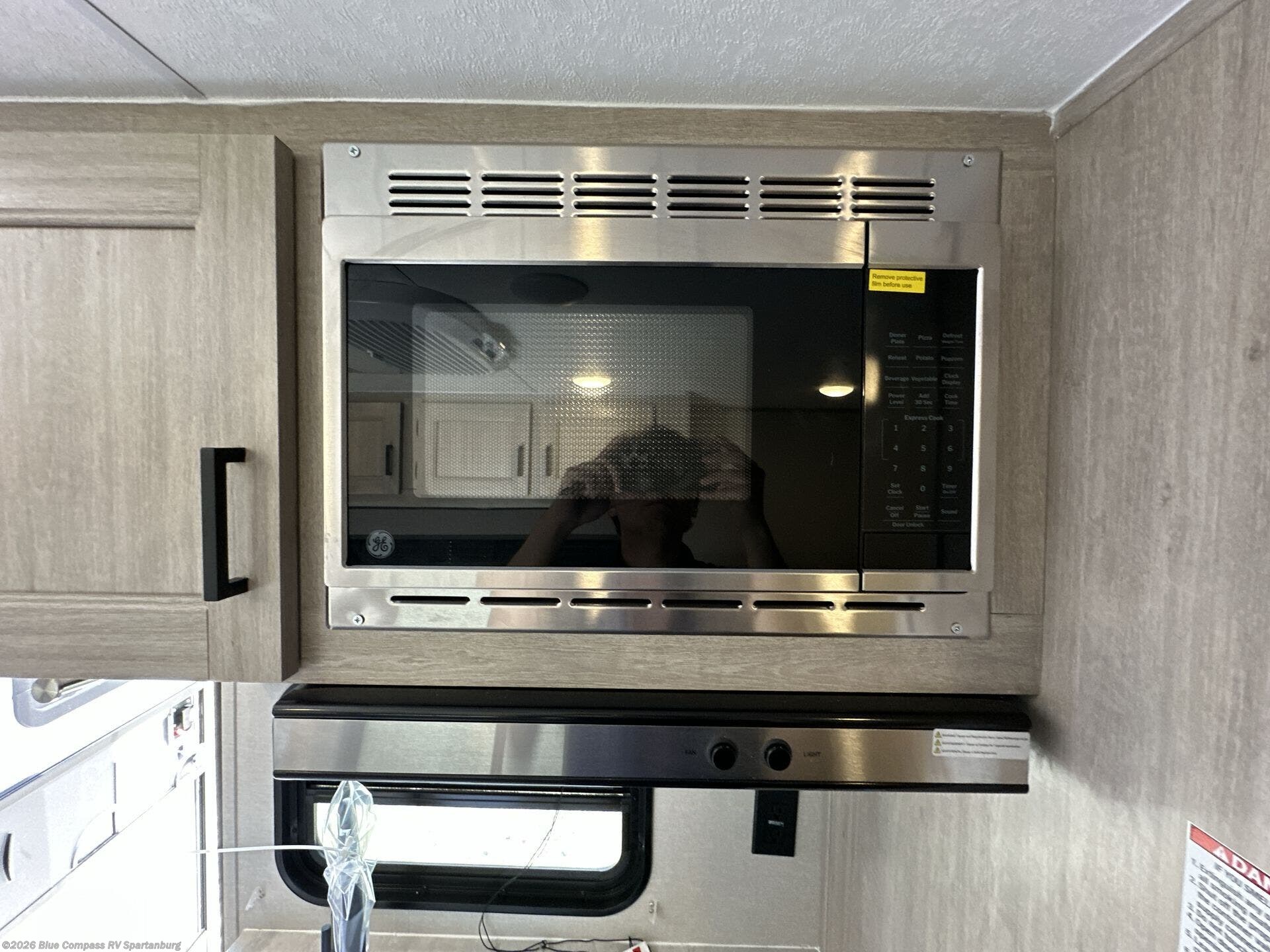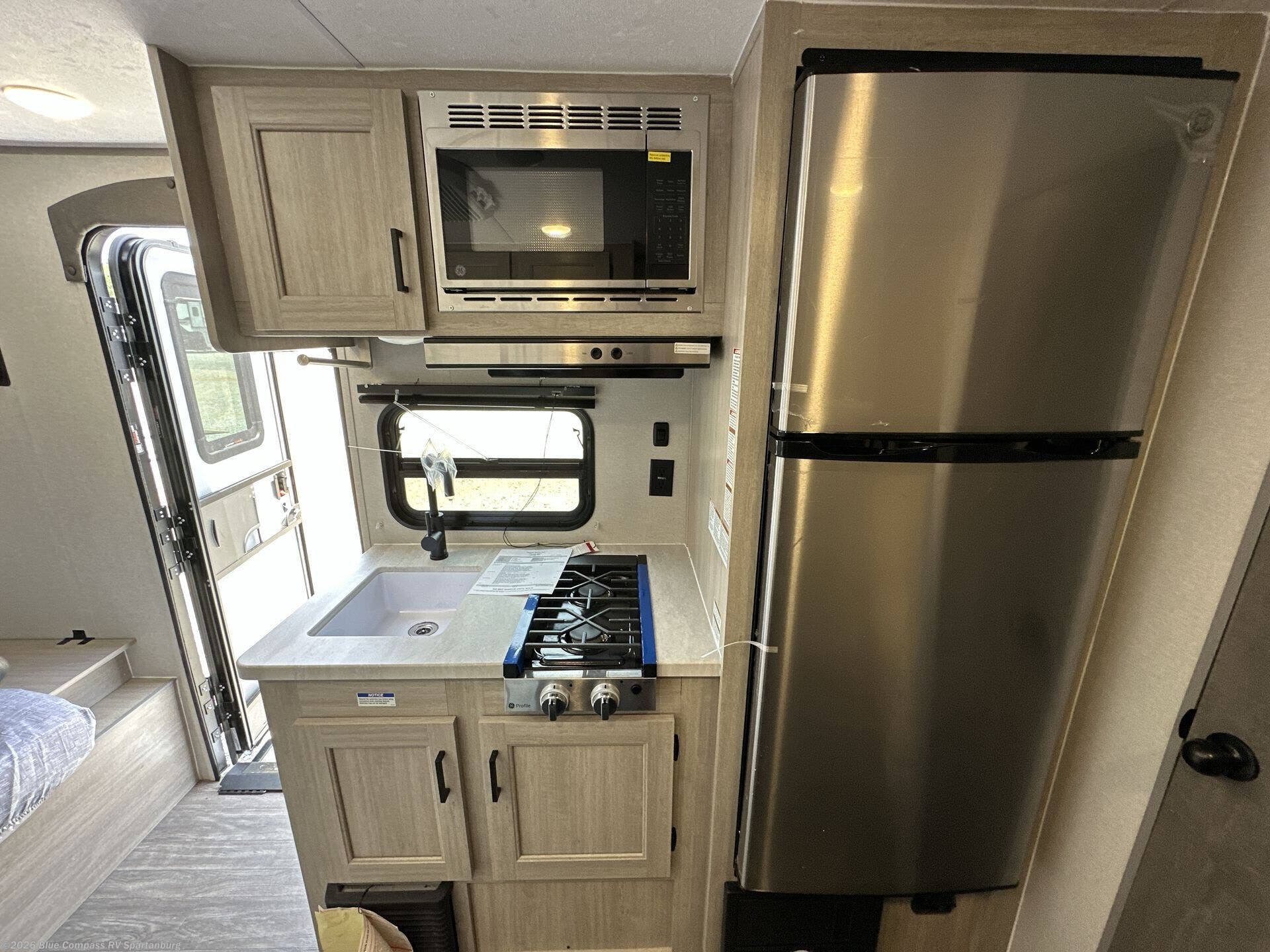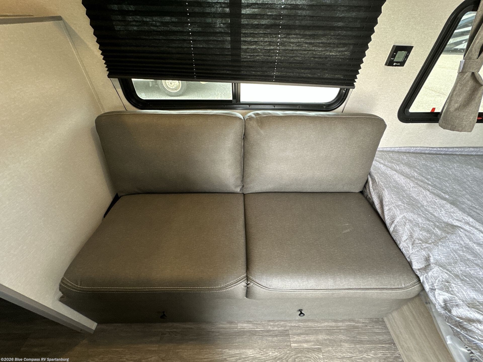 This cozy travel trailer can sleep five, so pack up and head out! You will have a queen bed up front to sleep on each night instead of an air mattress, and the little ones can take the 28" x 70" bunk beds! There is also a 60" sofa here that can sleep an additional guest and is perfect for relaxing during the day. The two burner cooktop and microwave oven means you won't have to cook over a campfire, and the private toilet and shower lets you clean up after a day outdoors. This model includes plenty of storage space, including bedroom storage, an exterior pass-through, plus additional outside storage beneath the bunks for hiking gear!