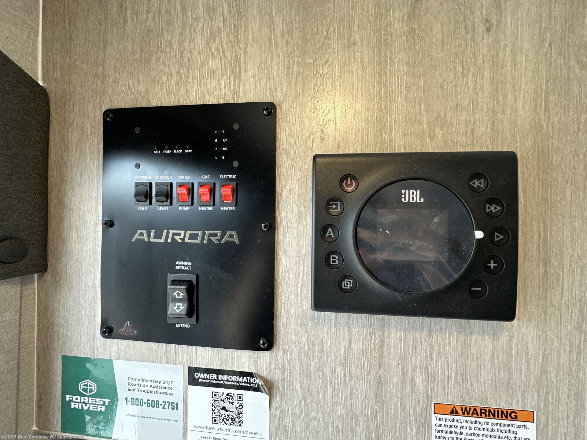 Comfortability, usability, and quality is what you will find in each one of these Forest River Aurora Light travel trailers! They are designed with a superior build and packed full with industry leading, functional, and distinctive standard features. SolidStep entrance steps and a Safe-T rail door assist on main entry door to help you safely enter and exit the unit. The diamond plate rock guard will protect your unit from road debris and the nitrogen filled radial tires, which keep their pressure longer, offer better fuel economy. You will also find upgraded JBL Elite exterior speaker outside, an electric awning with multicolor lights and remote, plus flush mount baggage doors for easy packing. The interiors are beautifully designed with matte black kitchen and bath faucets, black nightshades in the living room, and GE kitchen appliances!