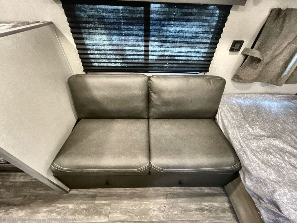This cozy travel trailer can sleep five, so pack up and head out! You will have a queen bed up front to sleep on each night instead of an air mattress, and the little ones can take the 28" x 70" bunk beds! There is also a 60" sofa here that can sleep an additional guest and is perfect for relaxing during the day. The two burner cooktop and microwave oven means you won't have to cook over a campfire, and the private toilet and shower lets you clean up after a day outdoors. This model includes plenty of storage space, including bedroom storage, an exterior pass-through, plus additional outside storage beneath the bunks for hiking gear!